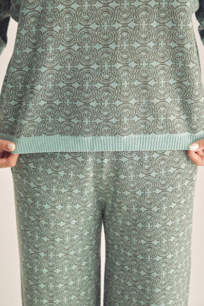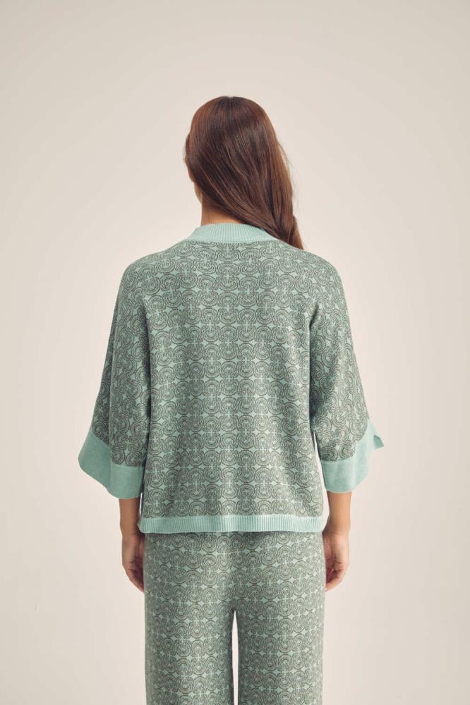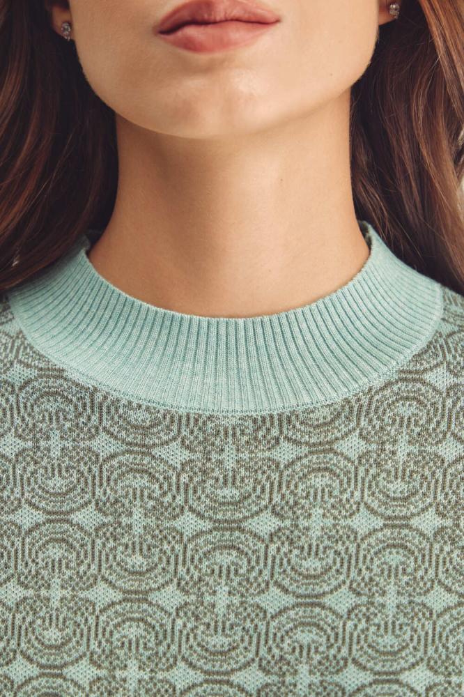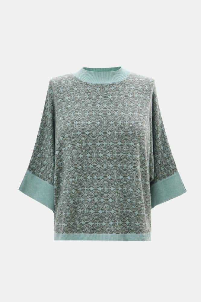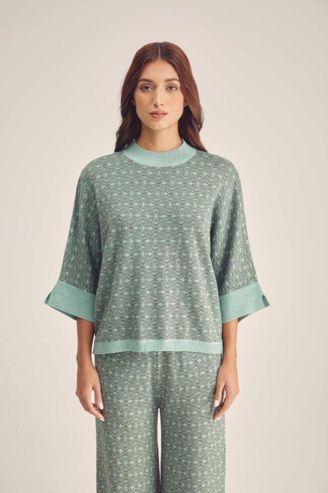 أضيفي لمسة أناقة ساحرة إلى إطلالتك في الأجواء الباردة مع هذه البلوزة بياقة ضيقة وبأكمام متوسطة الطول ،بقصة فضفاضة ،وتتميز بنقوش فريدة تكسبها طابعًا عصرياً.