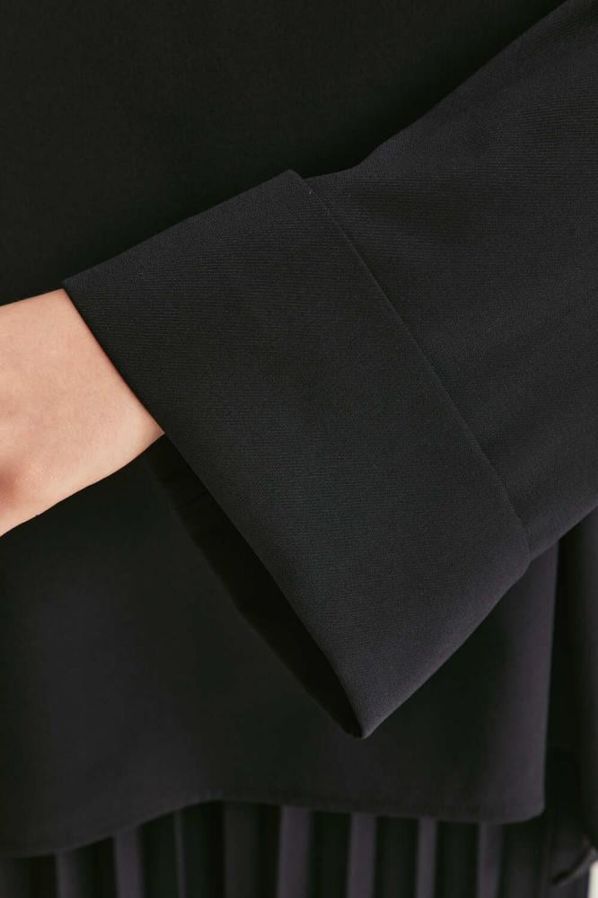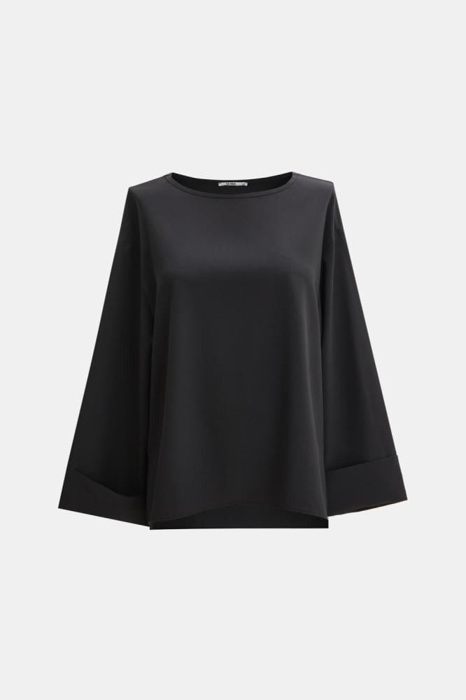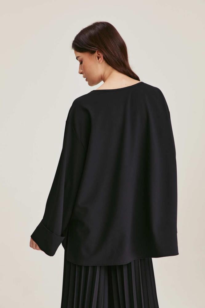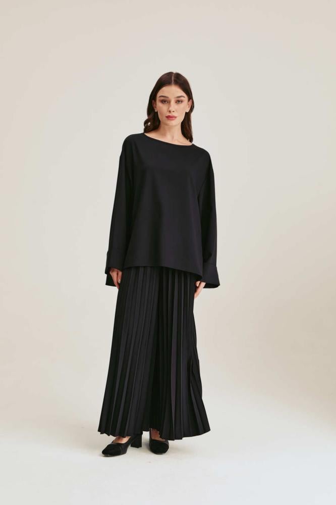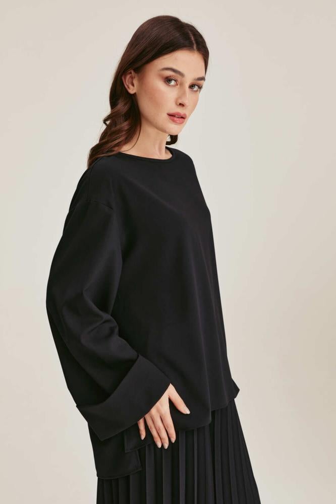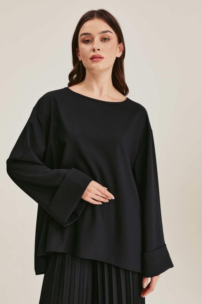 • تأتي البلوزة بأكمام واسعة مع نهايات قابلة للطي؛ لتضفي لمسة عصرية وأنيقة، وتسمح لكِ بتعديل طول الكم حسب رغبتكِ.