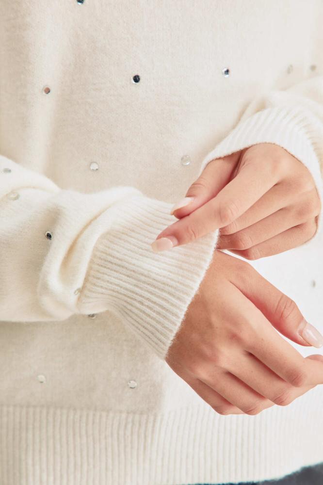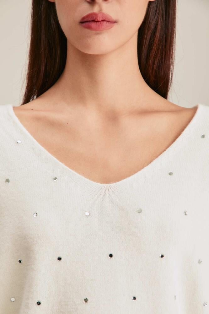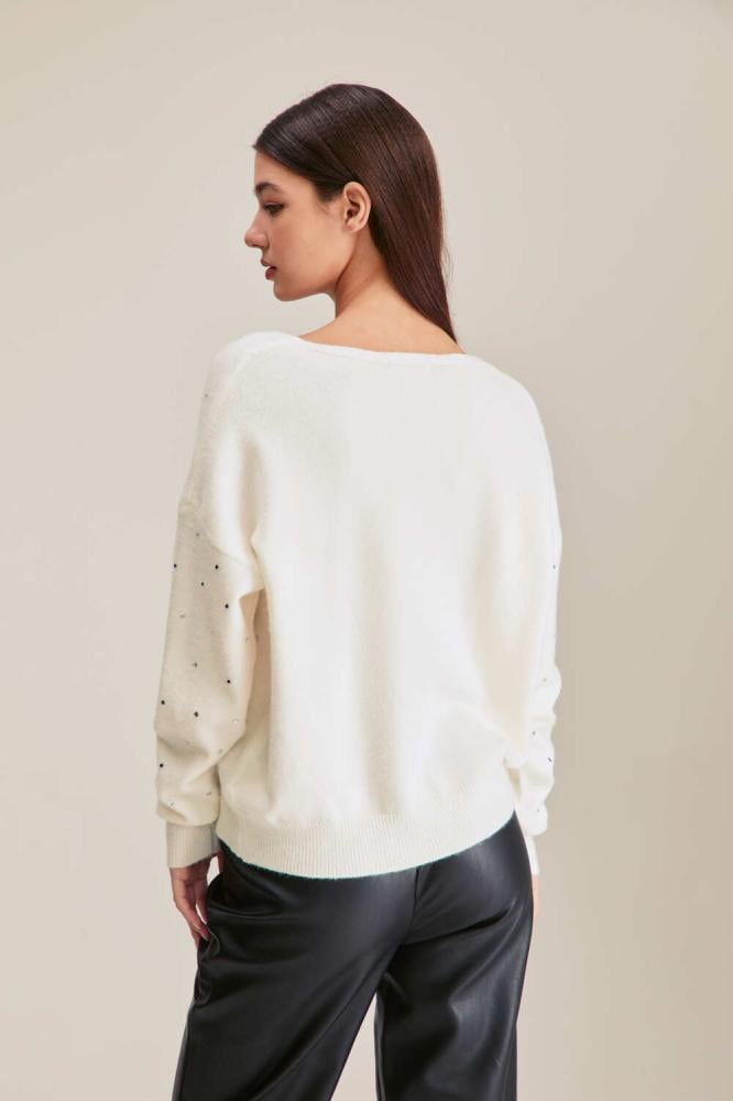 إضافة مميزة إلى تشكيلة ملابسك العصرية، بلوزة أنيقة مصنوعة من خامة محبوكة بياقة V وبأكمام طويلة ومزين بتفاصيل لامعة ، بتصميم بقصة واسعة .