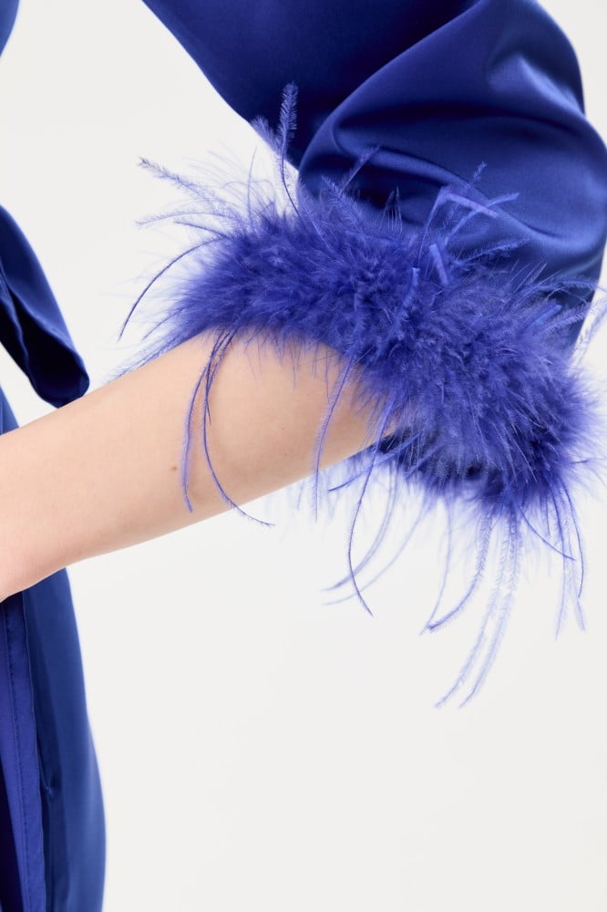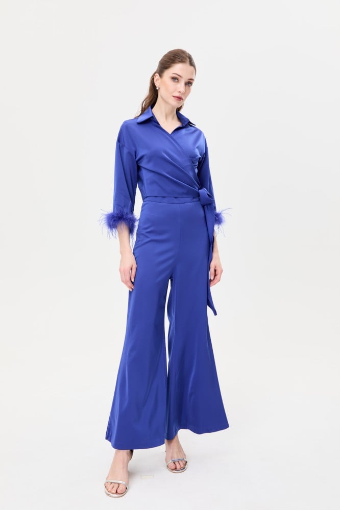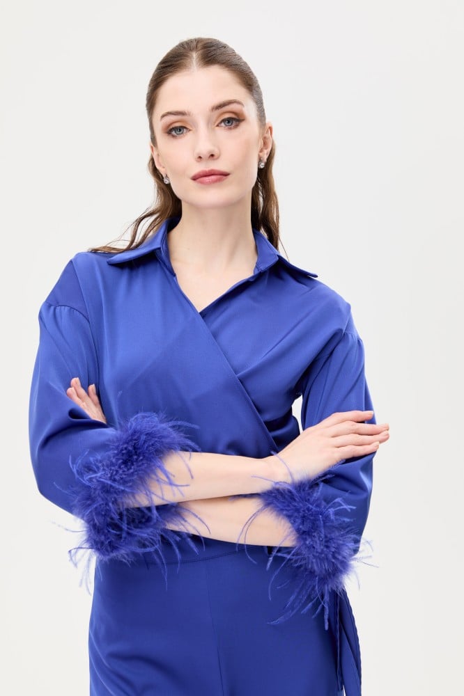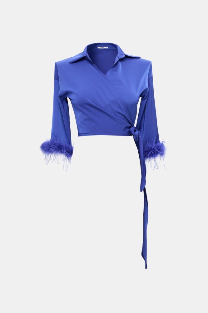 تألقي بإطلالة ساحرة وجذابة مع هذه البلوزة تتميز بقصة جذابة بتصميم لف وبأكمام واسعة مزينة بأشرطة بريش يضفي عليها لمسة مذهلة