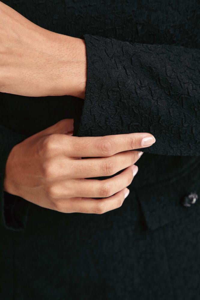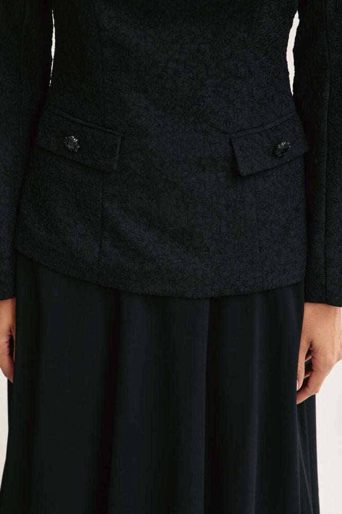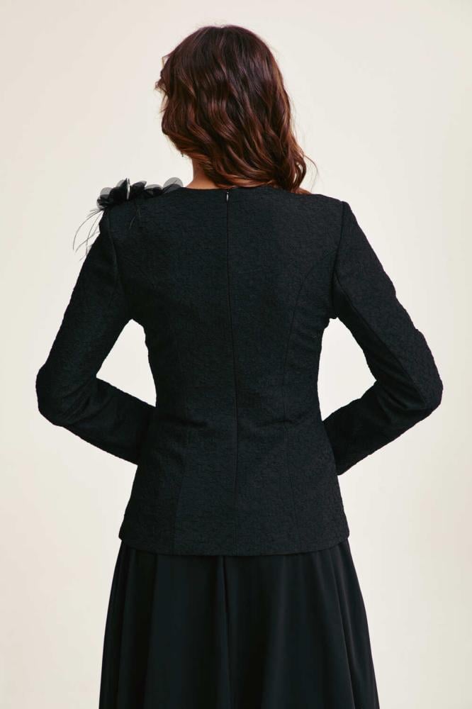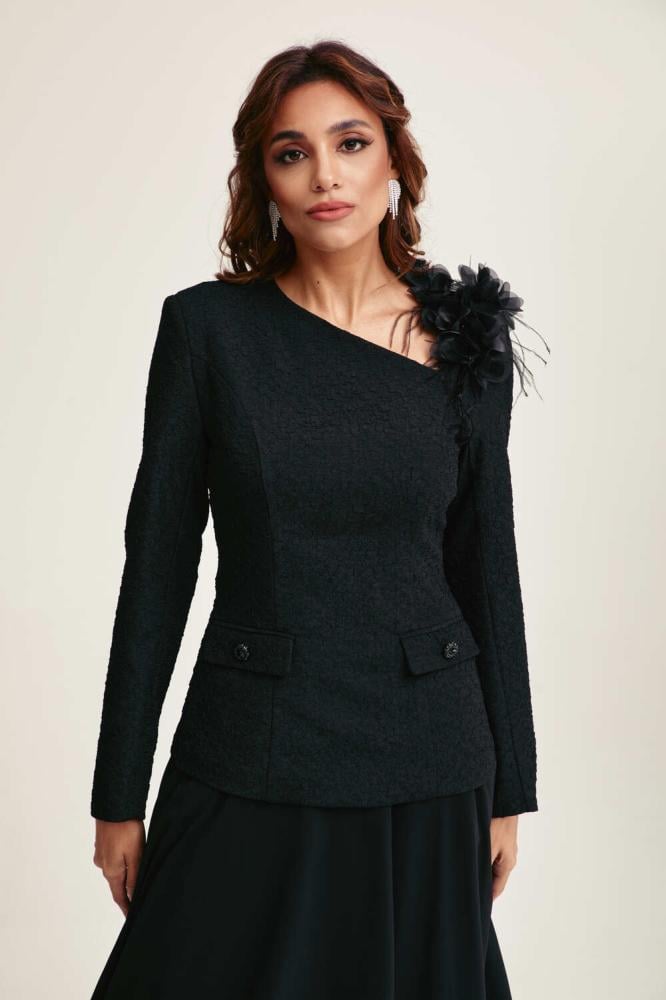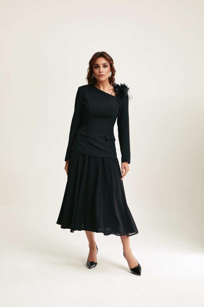 بلوزة يمكن تنسيقها مع تنورة بقصة جذابة بتصميم مٌبطن من الداخل ومزين بجيوب وأزرار، تأتي بياقة V غير متماثلة ، يتميز بزخرفة يدوية من الزهور والريش على الكتف لتمنحه لمسة راقية بطابع كوتور أنيق.