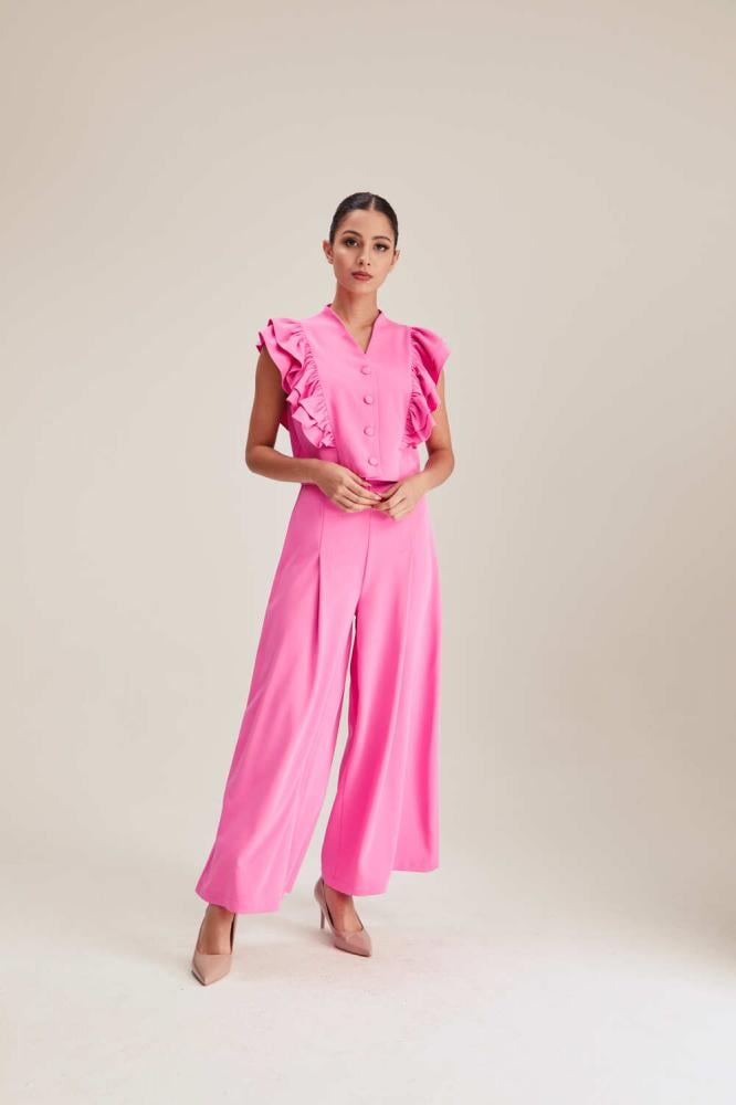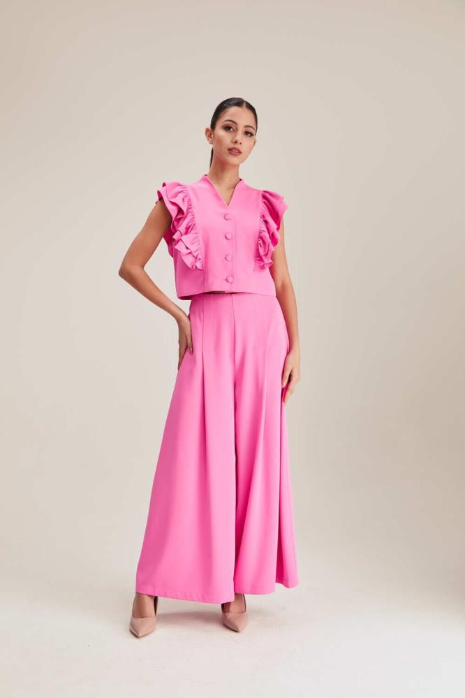 بنطلون فضفاض بتصميم عصري جذاب يأتي بقصة تجمع بين الراحة والأناقة نسقيه مع جاكيت متناسق لإطلالة ساحرة في المناسبات المختلفة.