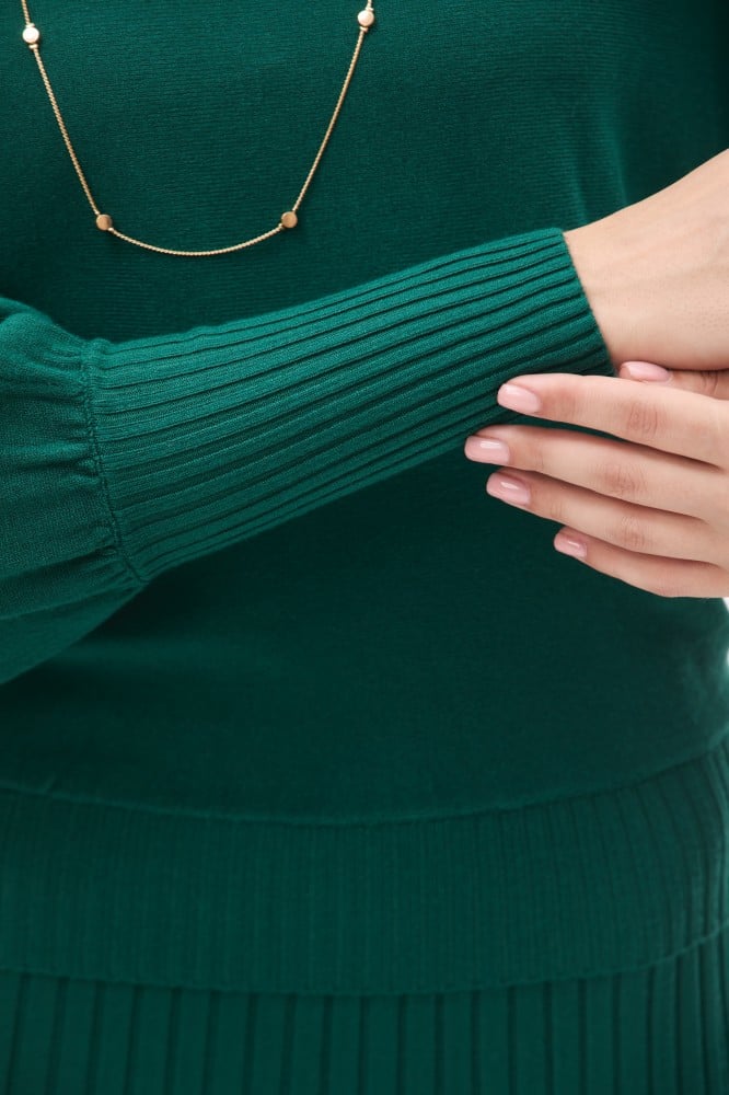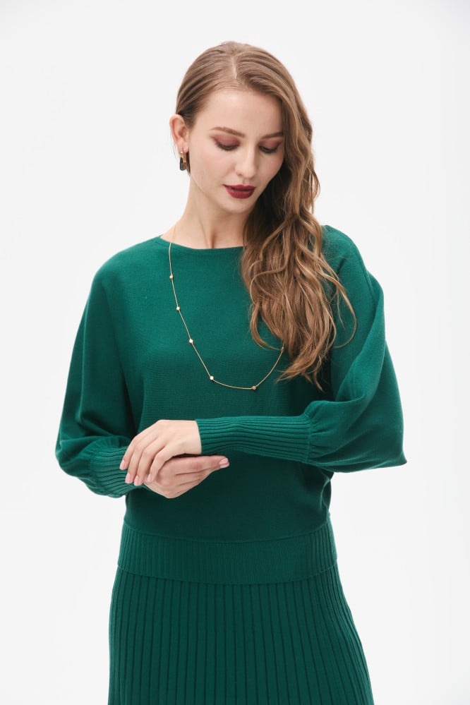 تمتعي بالدفء والأناقة هذا الشتاء وانتقي بلوزة محبوكة بياقة مستديرة وبأكمام طويلة ، نسقيها مع تنورة بتصميم مماثل للوك عصري مذهل.