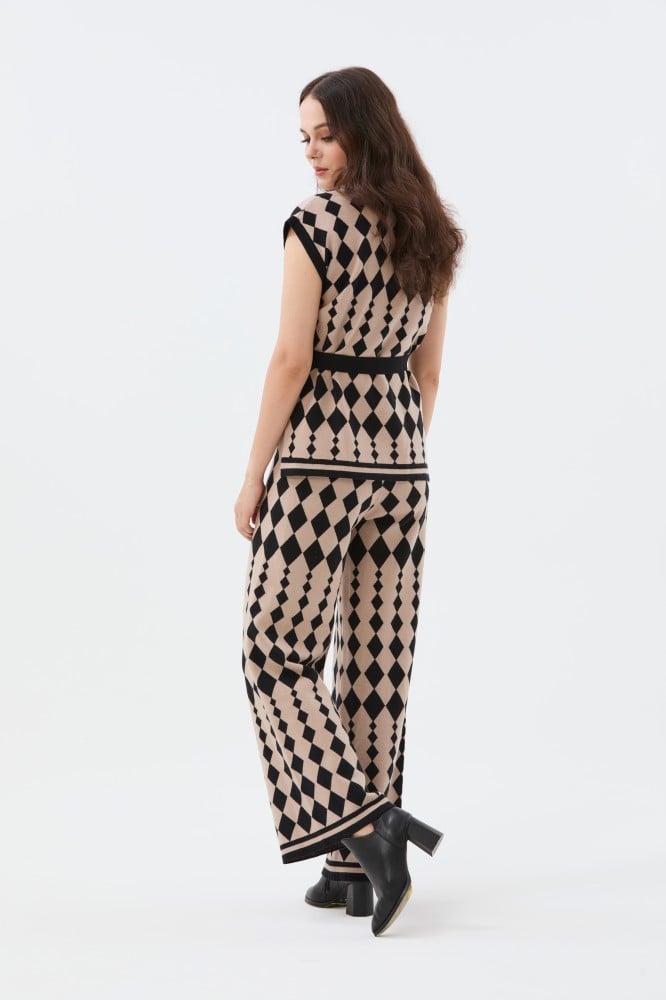 احصلي على إطلالة أنيقة بإرتداء بنطلون محبوك مزين بنقوش هندسية بتصممي بخصر مطاطي وأرجل واسعة ،يمكنك تنسيقه مع بلوزة مماثله للوك مبهر.
