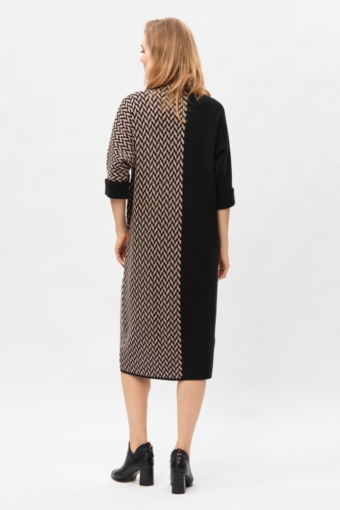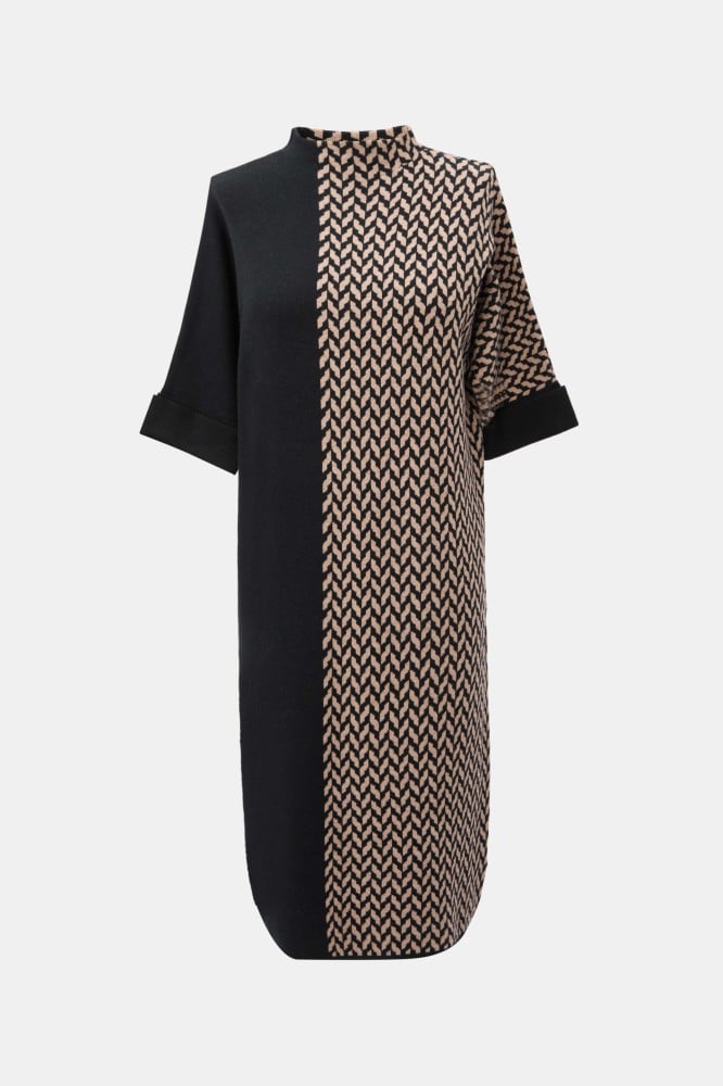 احصلي على إطلالة بسيطة تنبض بالأنوثة مع هذا الفستان الناعم، مصمم بياقة عالية وبأكمام متوسطة الطول بثنية ومزدان بنقوش جذابة