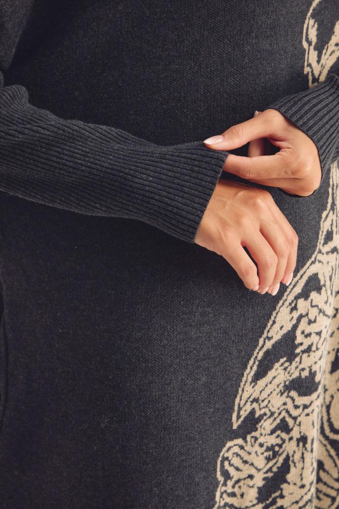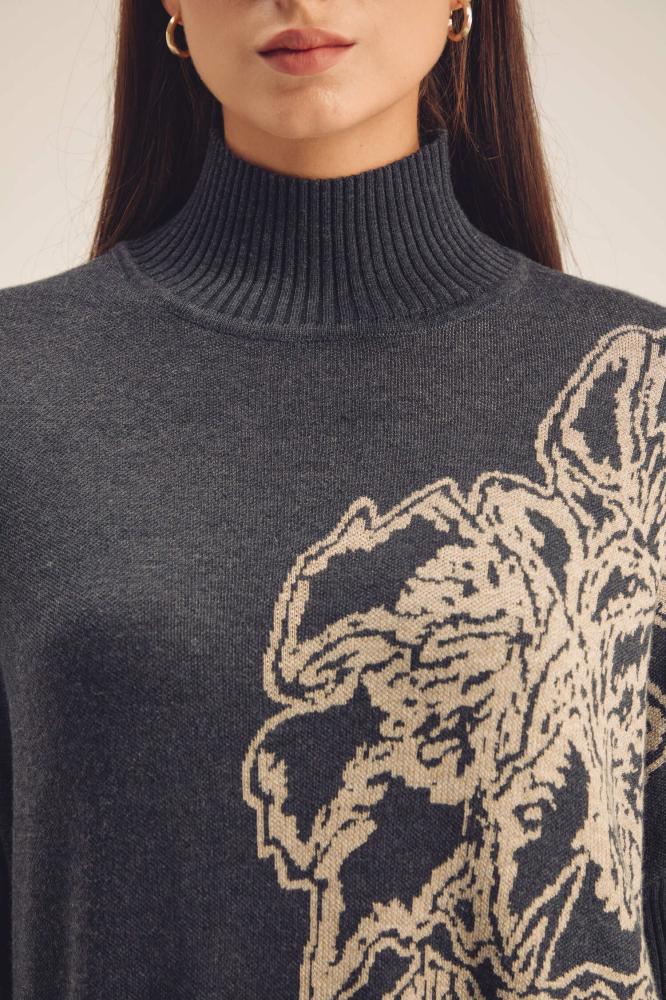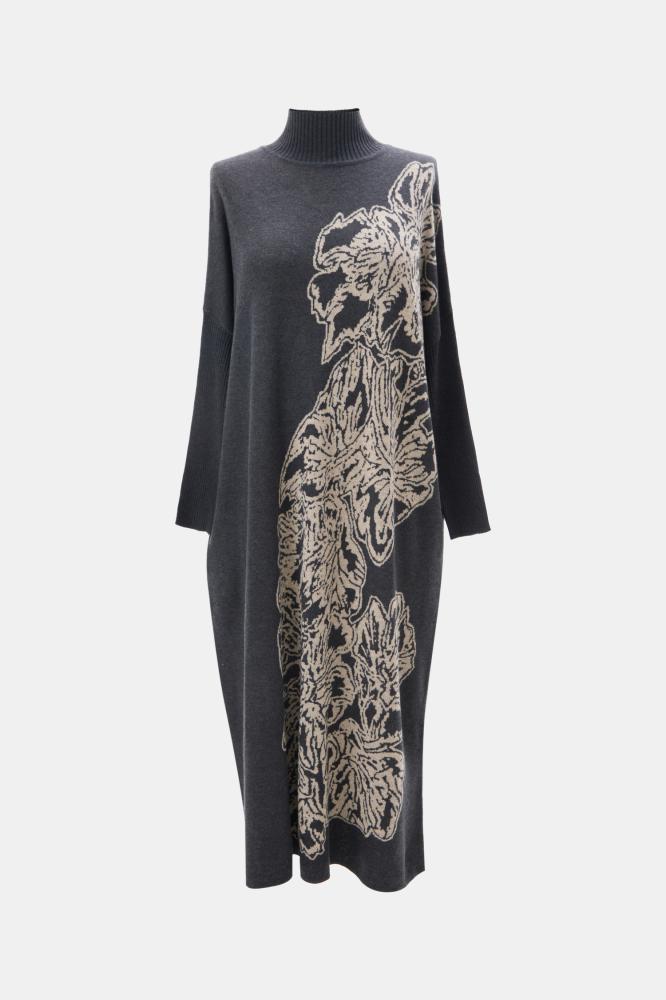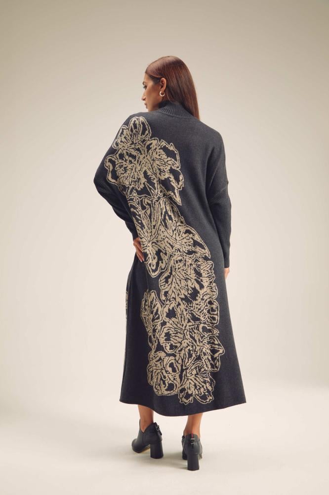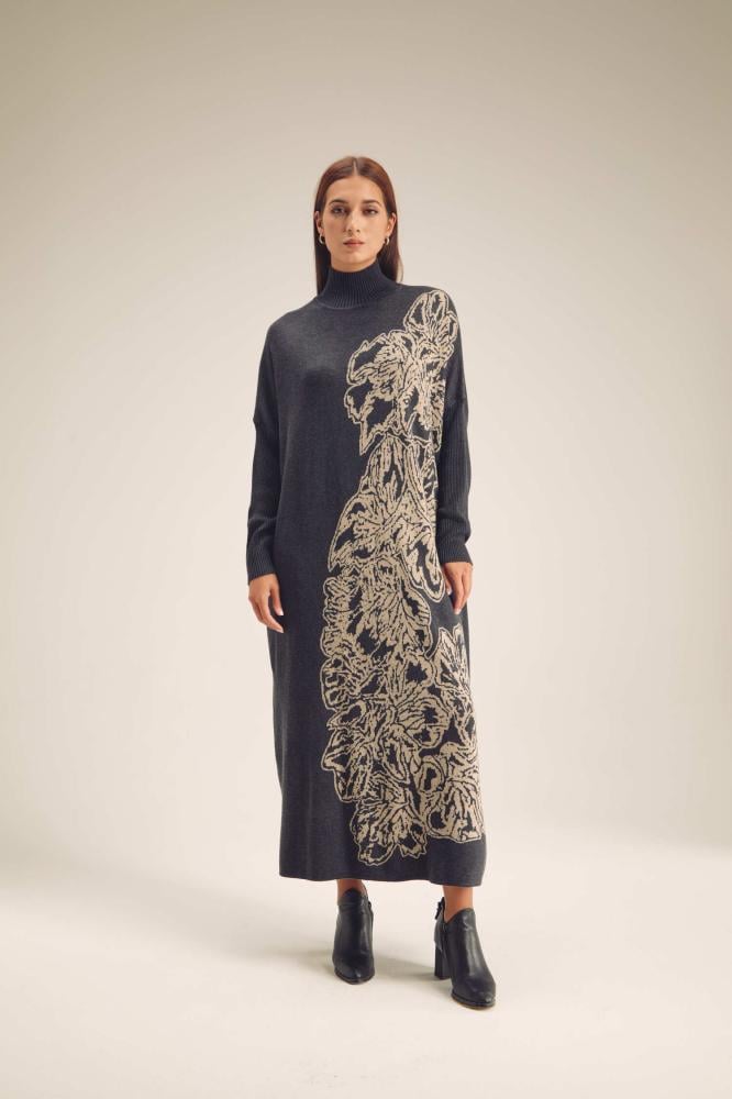 لإطلالة ناعمة ومريحة تألقي بفستان محبوك بقصة واسعة ،بتصميم بياقة عالية وبأكمام ضيقة ، ومزدان بنقوش موردة