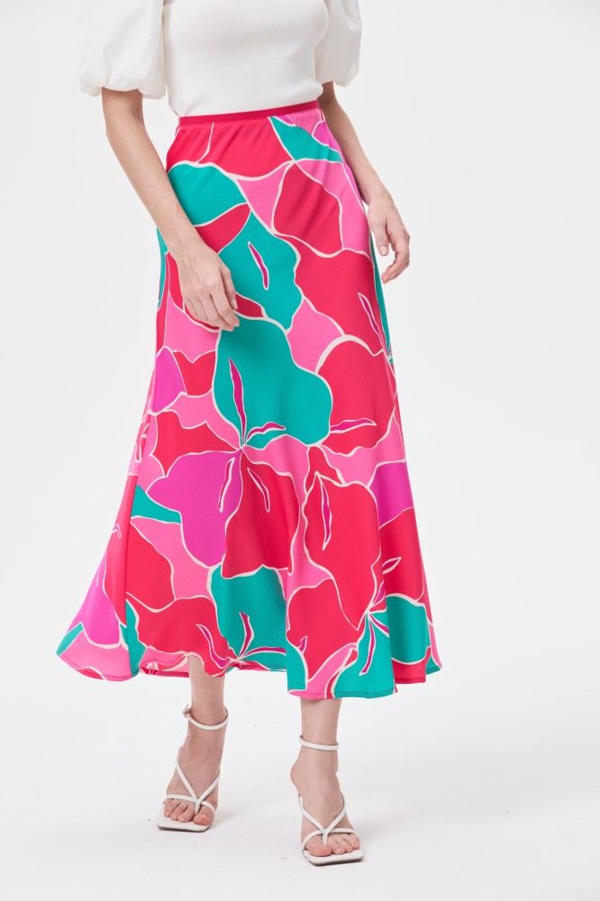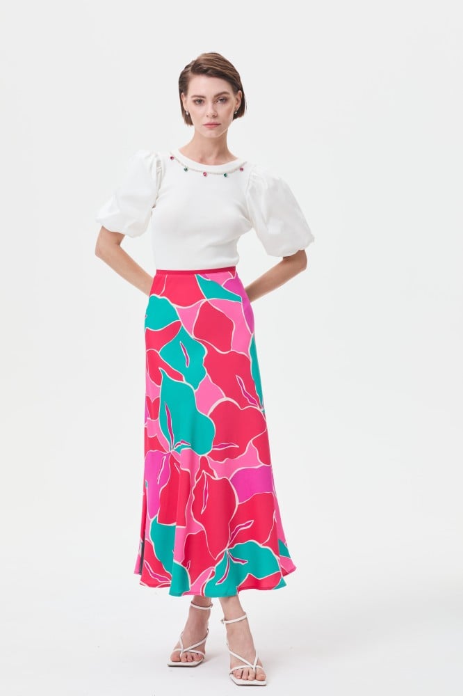 لإطلالة ملفتة ومفعمة بالأنوثة ، تنورة مزينة بنقشة ورورد ، بتصميم بخصر مطاطي وقصة كلوش ، نسقيها مع بلوزة مماثلة لتكملي أناقة مظهرك.