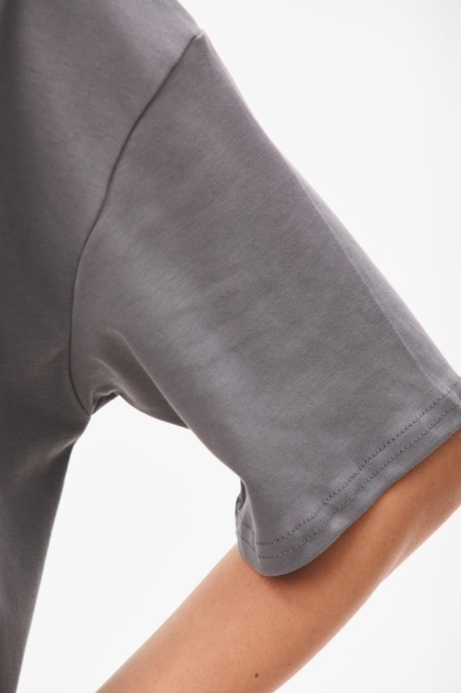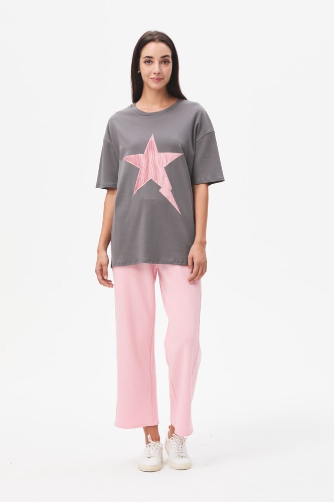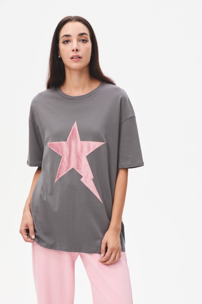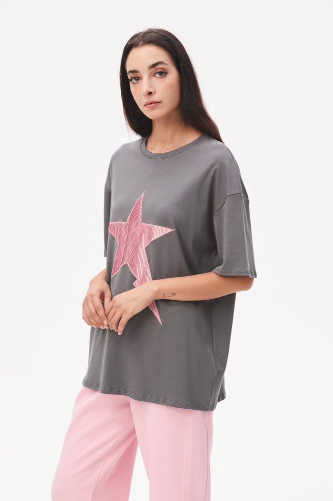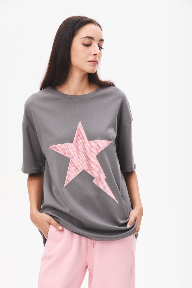 بلوزة كاجوال، للوك عصري مميّز ولافت مصممة بياقة مستديرة وبأكمام قصيرة وتأتي بقصة واسعة ومزدانة بطبعة نجمة