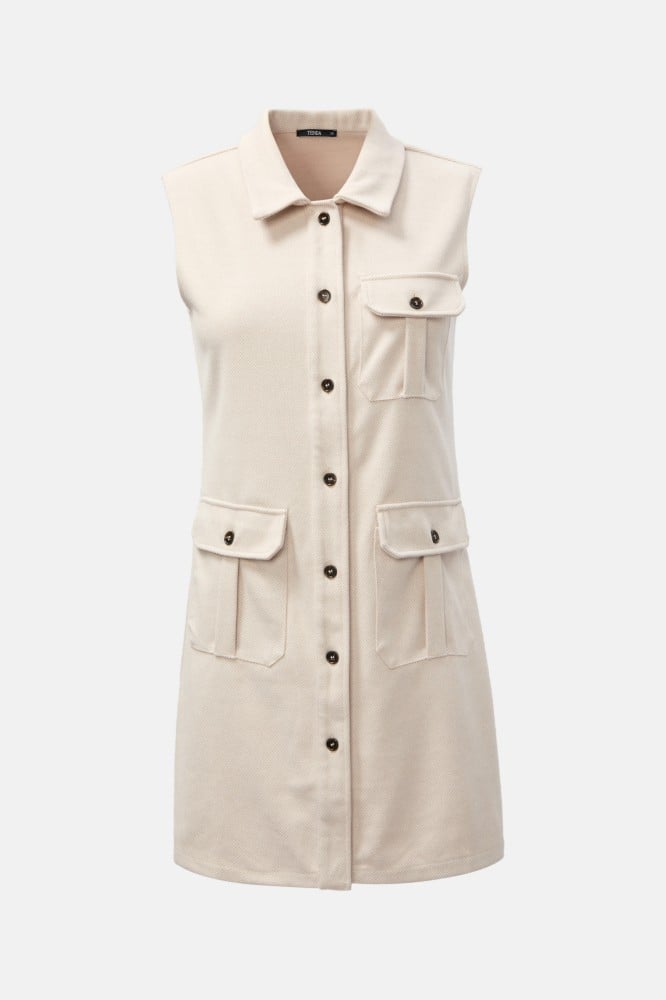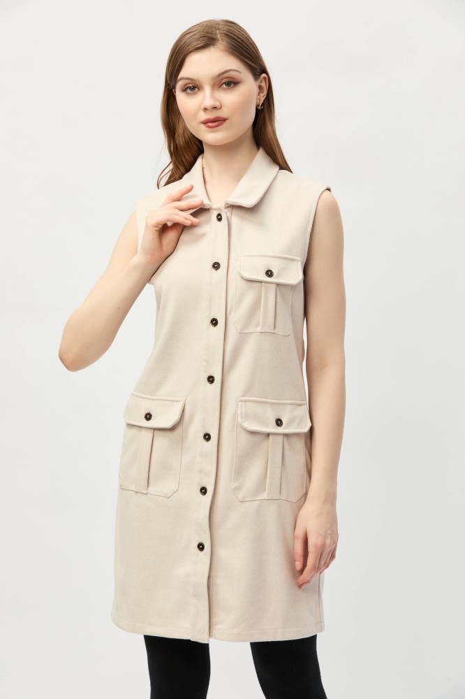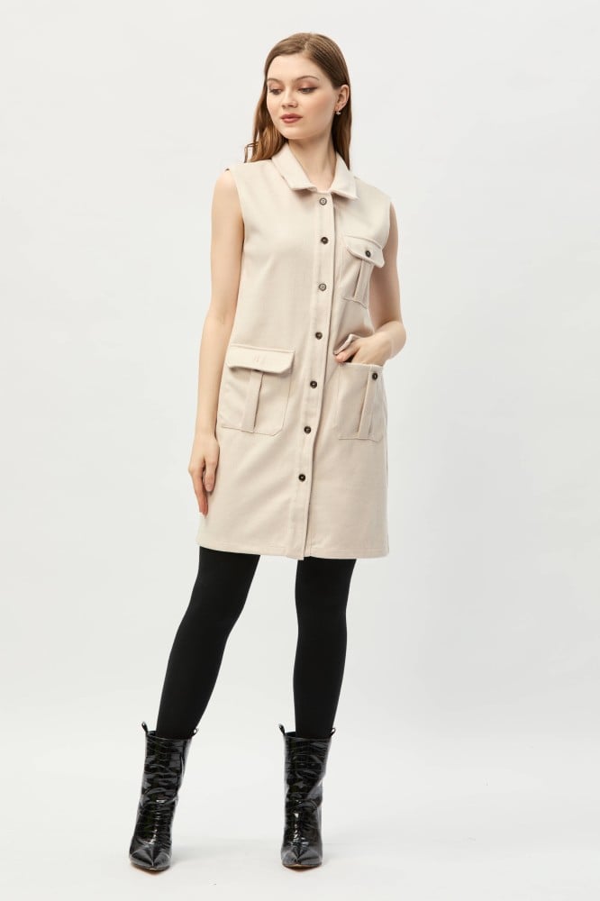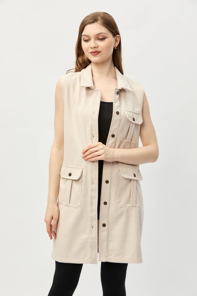 يمنحك هذا الجاكيت الكلاسيكي الدفء والأناقة، يتميز بقصة مفتوحة بأزرار للإغلاق تكسبه طابعًا عمليًا ، بتصميم بدون أكمام ومزين بجيوب ، نسقيه مع بلوزة بياقة عالية لمظهر جذاب