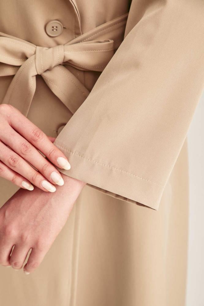 - يمتلك جاكيت قطن بيج ياقة بطية على شكل حرف V، وهو تصميم كلاسيكي يضيف لمسة أنيقة.