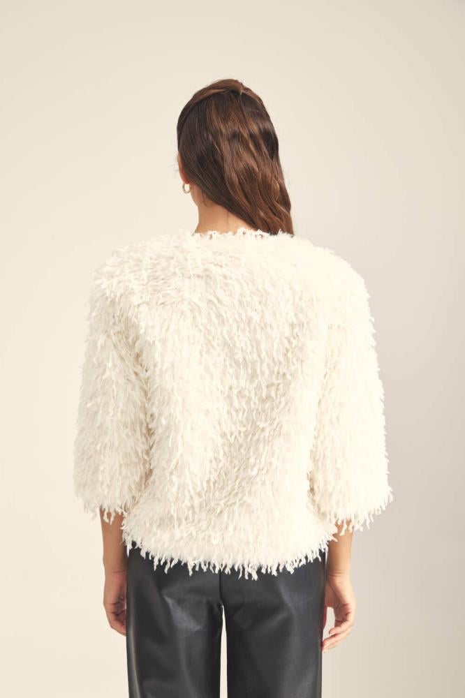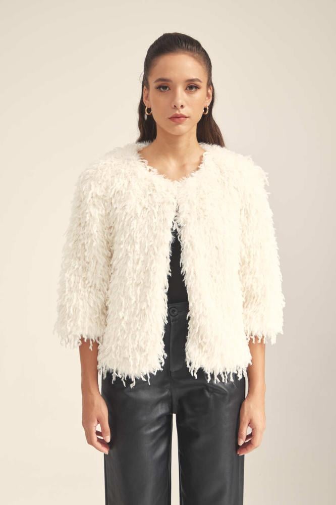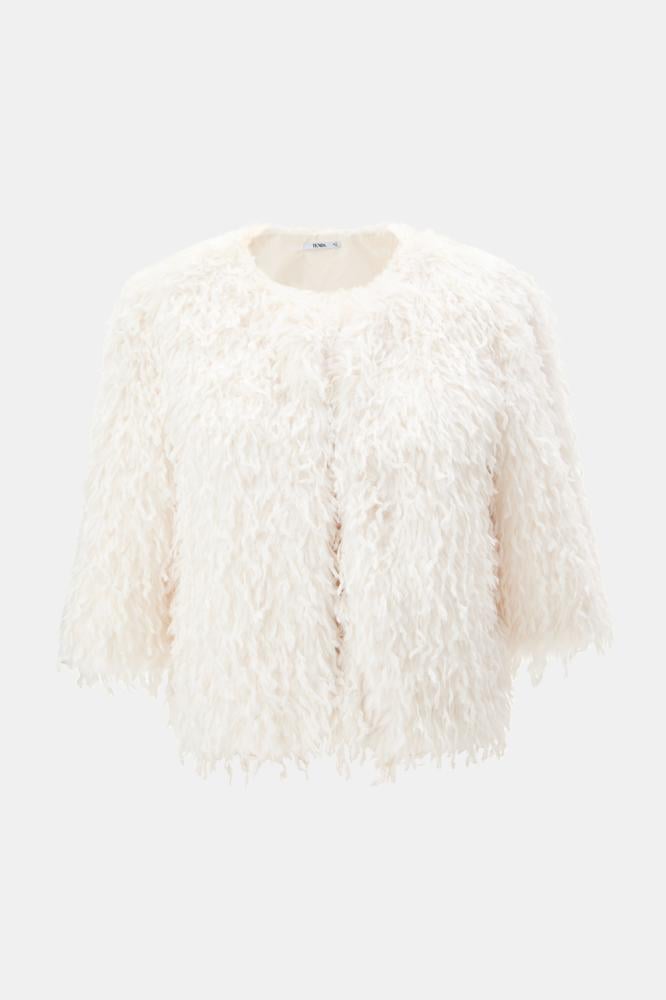 جاكيت فرو فاخر بتصميم مميز مستوحى من مظهر الريش، يتميز بقصة مفتوحة في الأمام مع مشبك إغلاق أنيق. يجمع بين الأناقة العصرية والدفء الفاخر، ليضفي لمسة من الرقي والتفرد على إطلالتك الشتوية