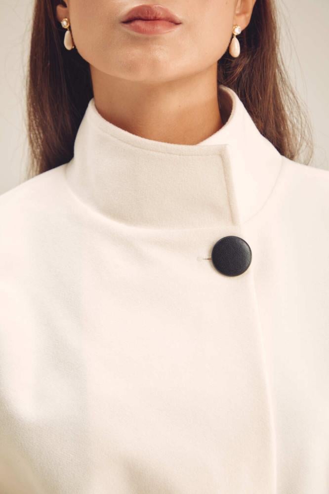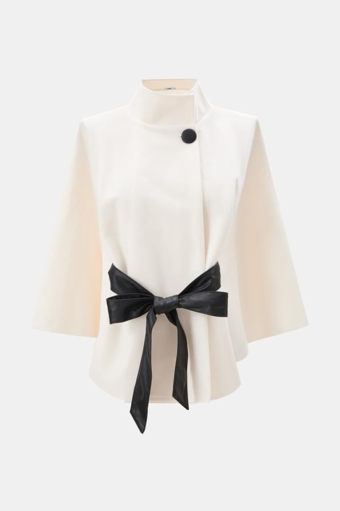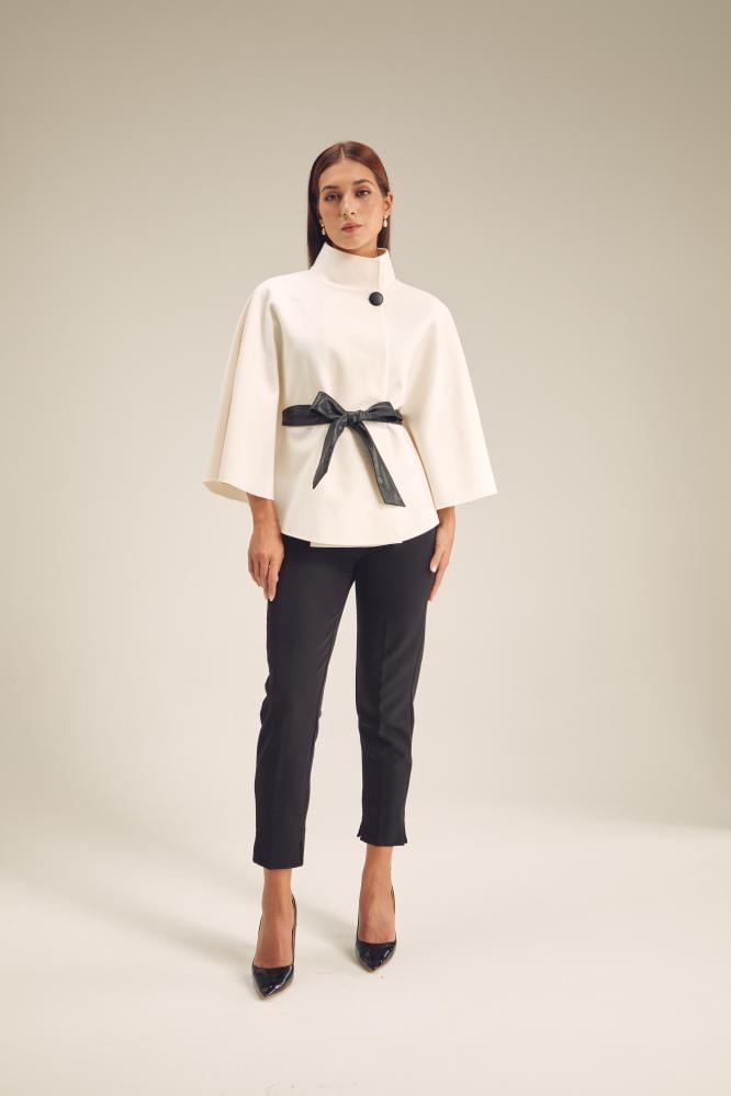انعمي بإطلالة أنيقة وارتدي جاكيت بقصة كيب، يأتي بياقة عالية أنيقة وبزر إغلاق ، وأكمام منفوخة ، ومزين بحزام ربط جلد اسود ، نسقيه مع بنطال جينز سكيني لمظهر فخم.