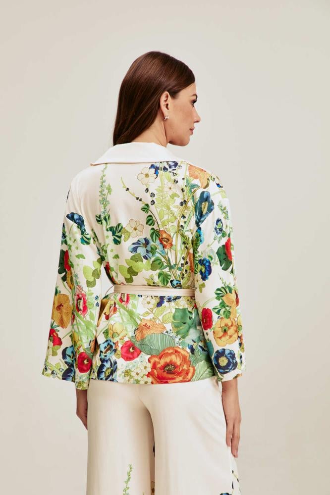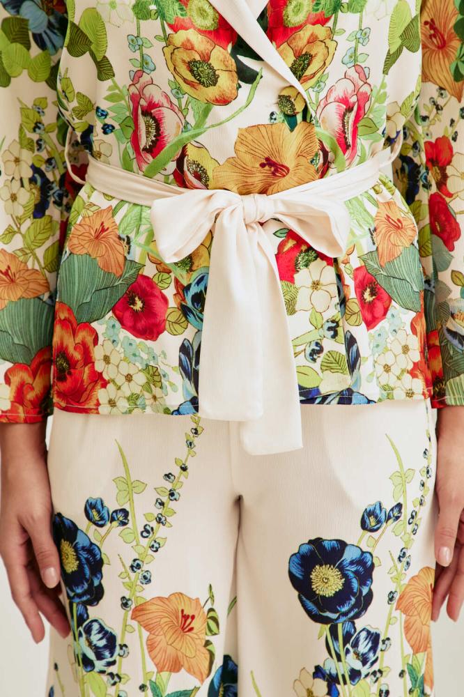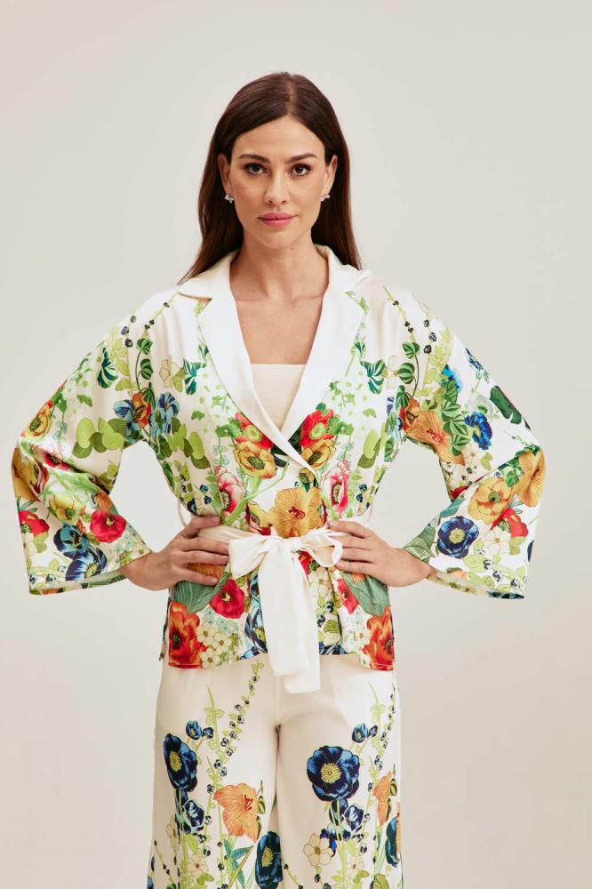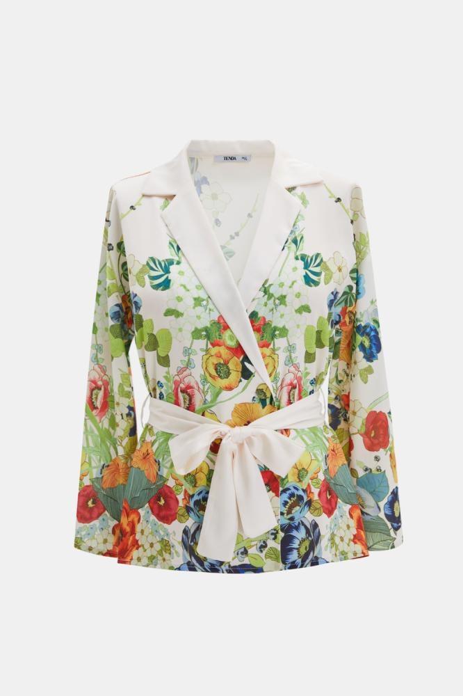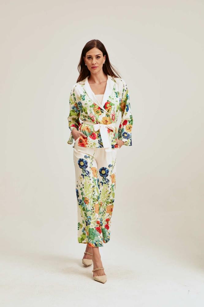 تألقي بأسلوب ناعم وأنيق مع هذا الجاكيت العصري بنقوش موردة ، يتميز بياقة كلاسيكية وبأكمام طويلة، كما أنه مصنوع من نسيج ناعم ومريح للغاية يمكن تنسيقه مع بنطلون بتصميم مماثل للوك لافت