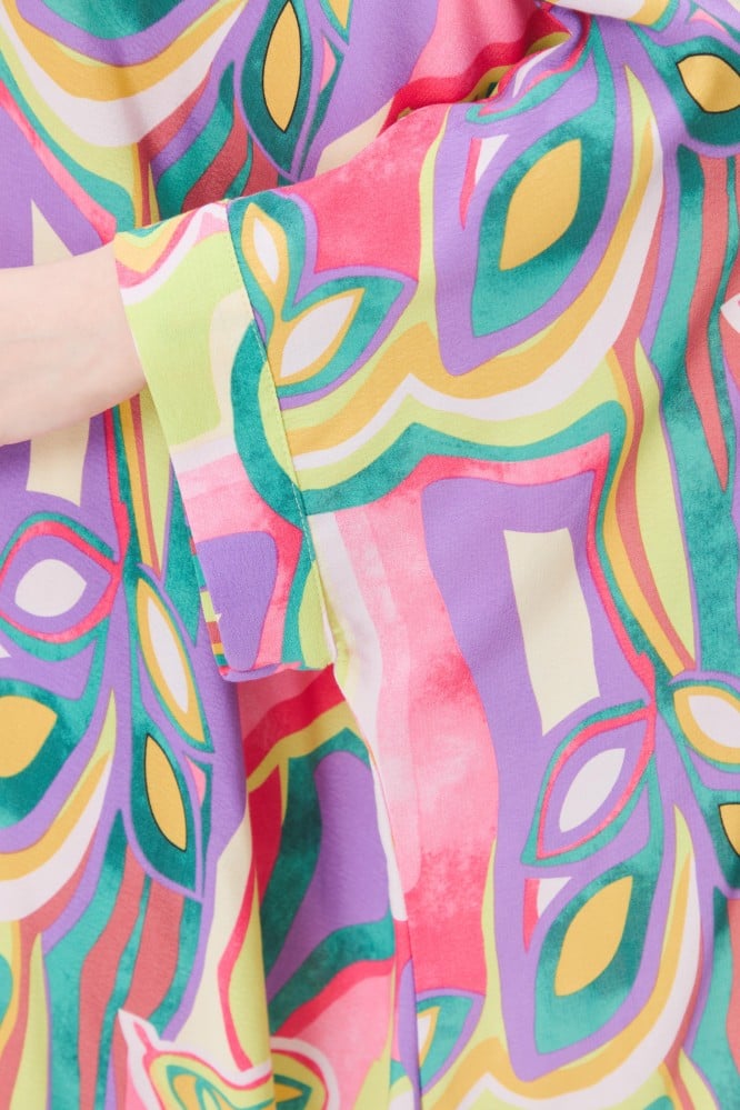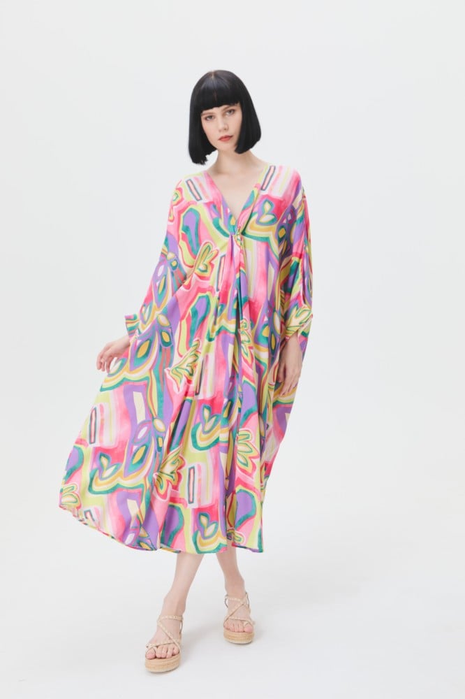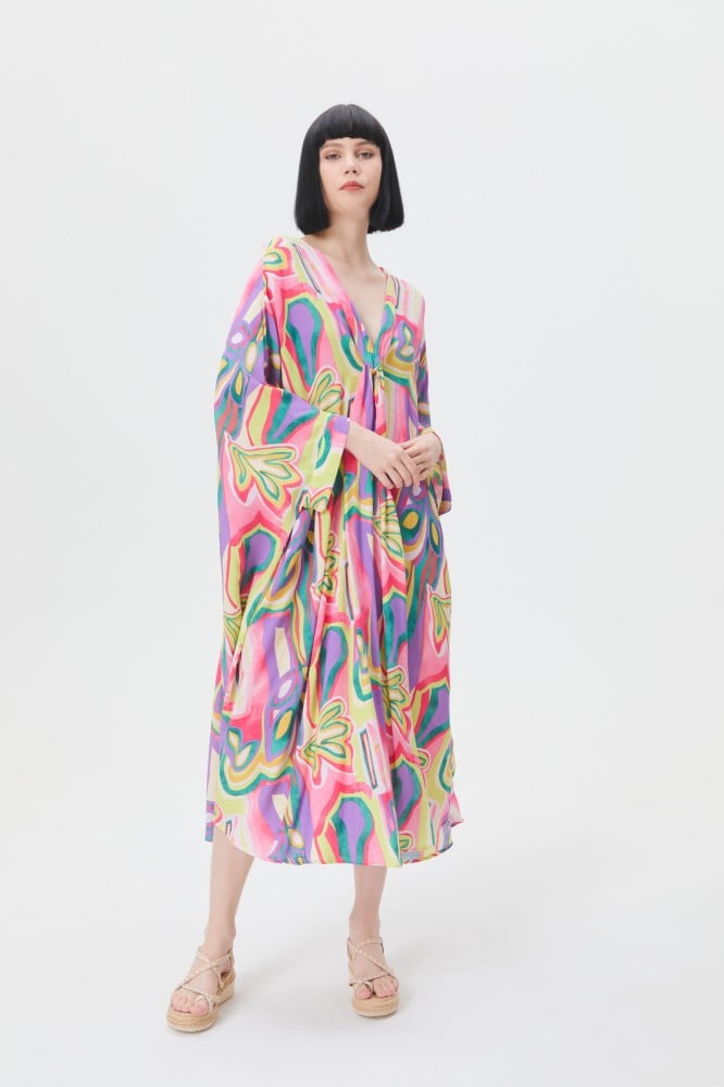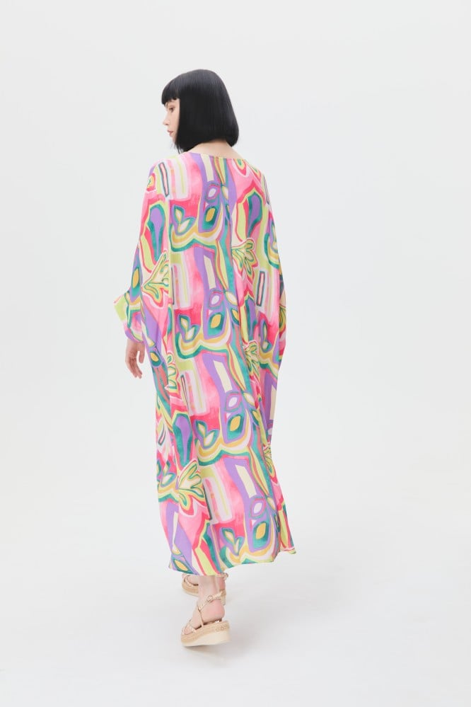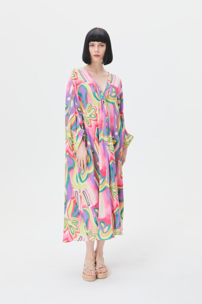 لإطلالة مبهرة تألقي بجلابية مزينة بنقوش جذابة و تتميز بقصة انسيابية وفتحة رقبة على شكل حرف V وأكمام طويلة