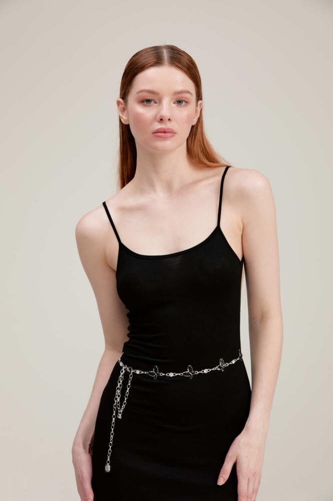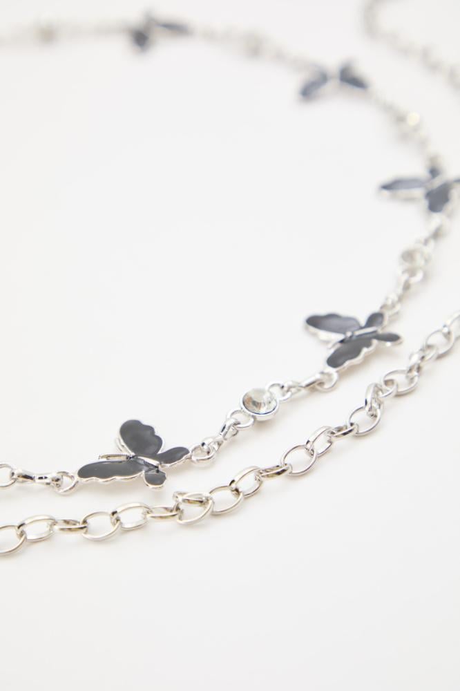يعد هذا الحزام إضافة أنيقة إلى مجموعة إكسسواراتك، فهو مصنوع من سلسلة فضية اللون مفعمة بالفخامة بتصميم عصري ويزدان بتعليقة فراشات ومرصع بالكريستال ، كما يغلق بمشبك لوبستر.