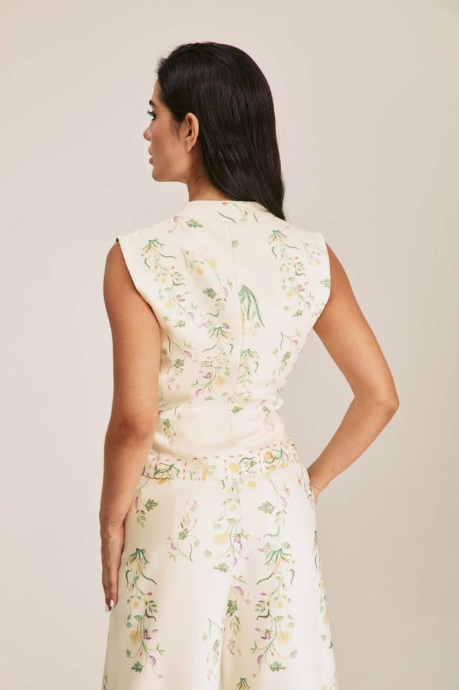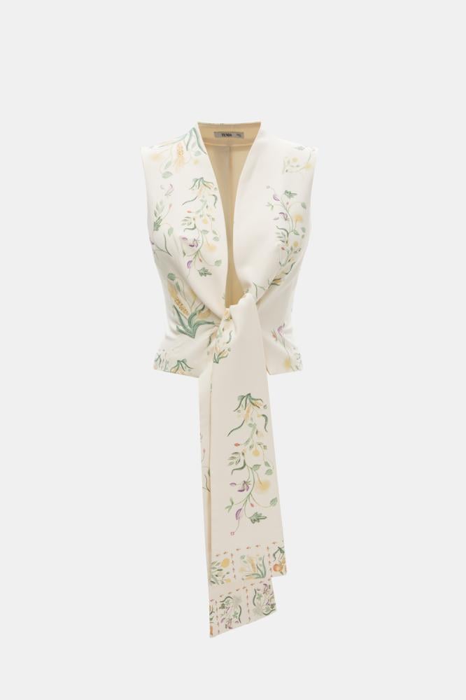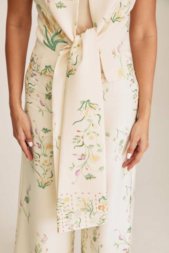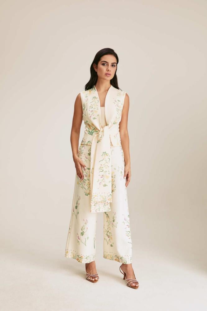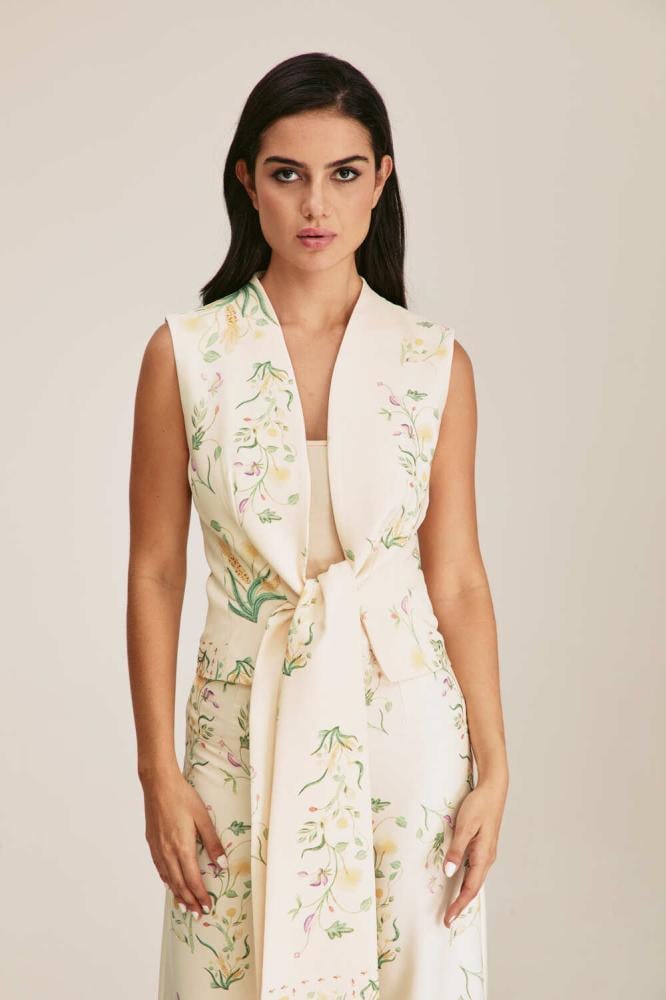 تألقي بأسلوب ناعم وأنيق مع هذا الجاكيت العصري مصمم بنقوش موردة وبلا أكمــام ، ويتميز بقصة مفتوحة من الأمام برباط منسدل ، كما أنه مصنوع من نسيج ناعم ومريح للغاية يمكن تنسيقه مع بنطلون بتصميم مماثل للوك لافت