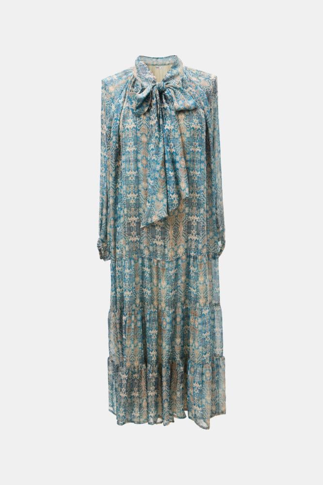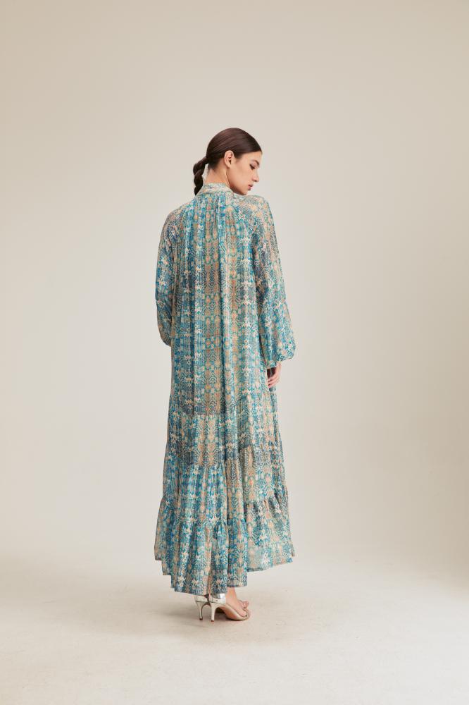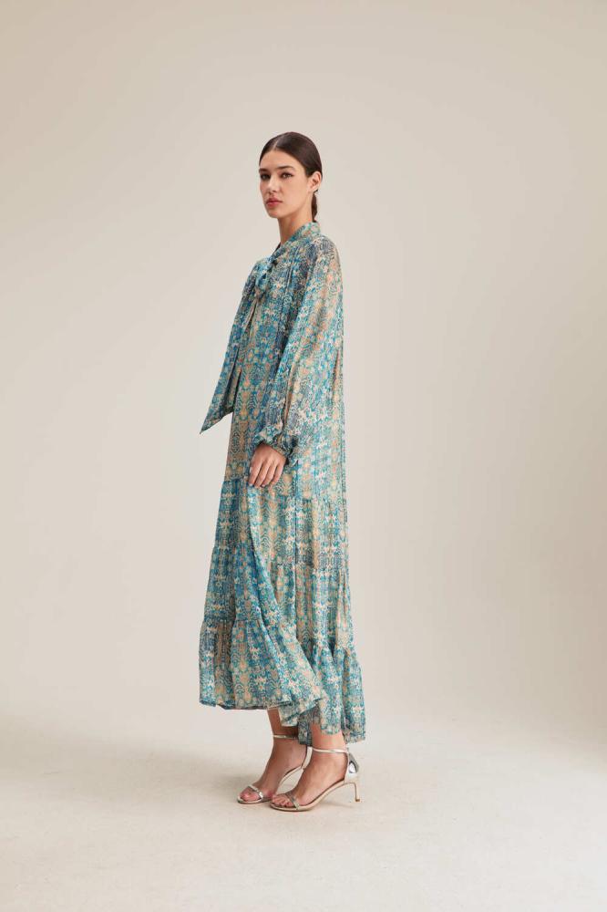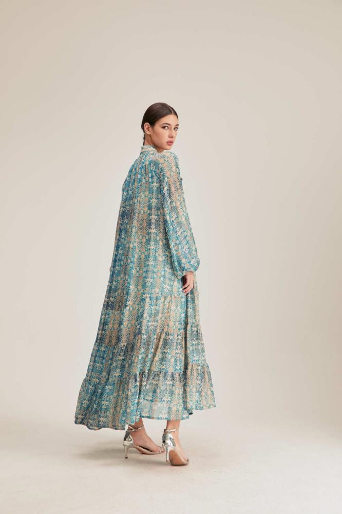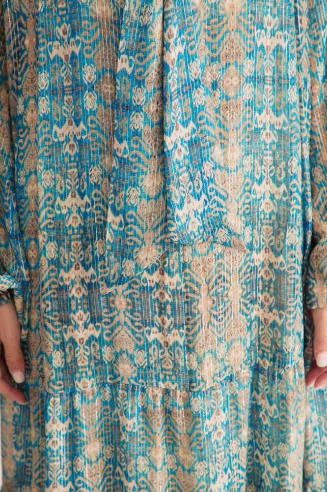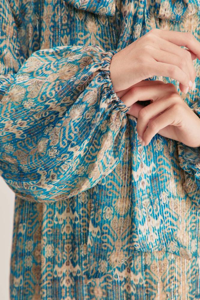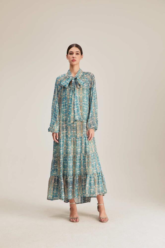 لأناقة ناعمة ومحتشمة انتقي فستان مزين بنقوش لامعة جذابة بتصميم بياقةبربطة وبأكمام بأساور مطاطية ، ويتميز بكشكش من أسفل وقصة منسدلة غير متماثلة