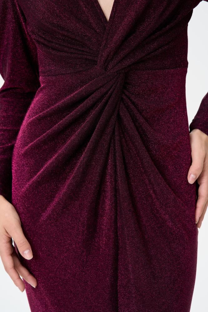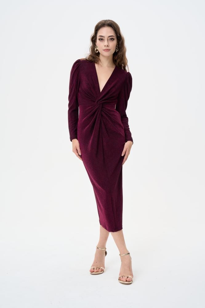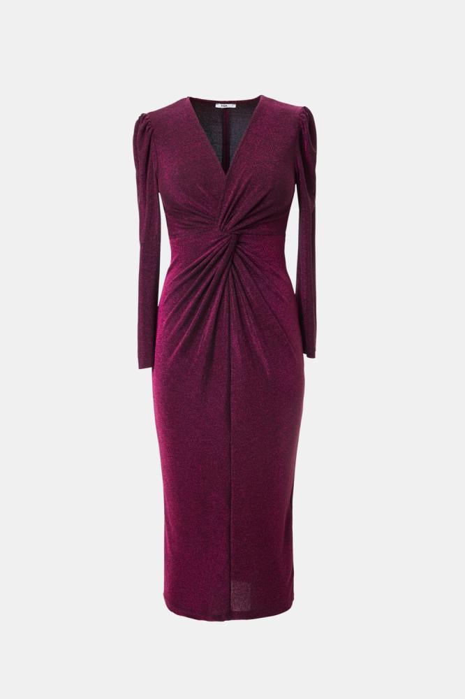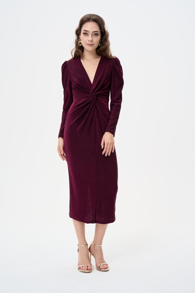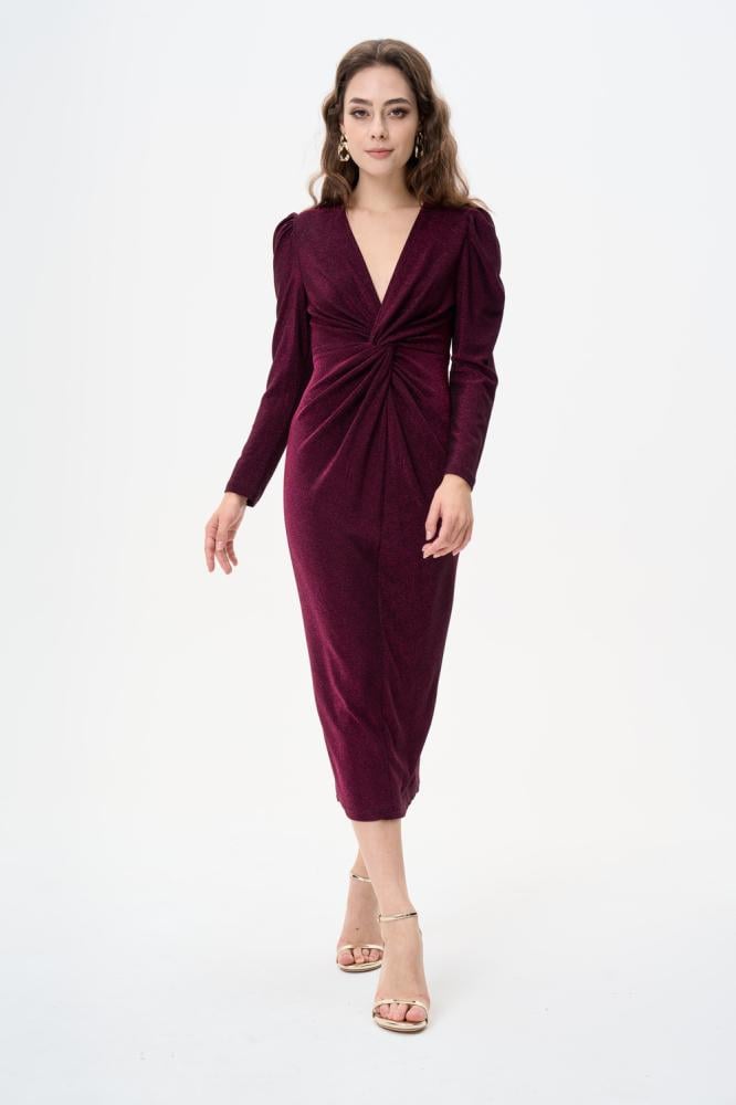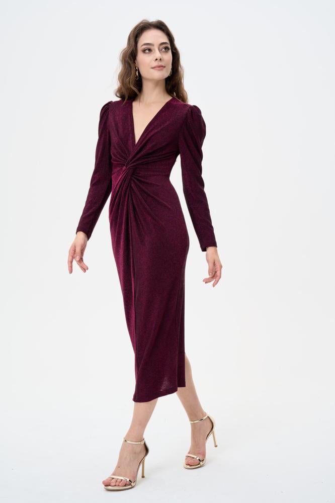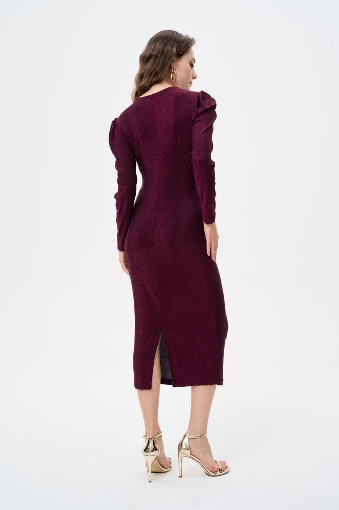 لإطلالة ساحرة مفعمة بالجاذبية، تألقي بفستان جرسية بخامة لامعة ، بتصميم بياقة V عميقة وبأكمام طويلة ويتميز بقصة ضيقة مزينة بفتحة من الخلف .