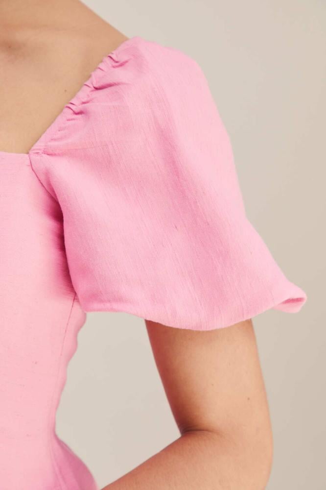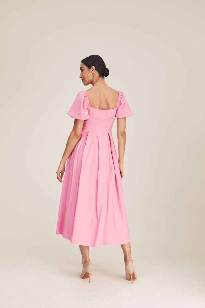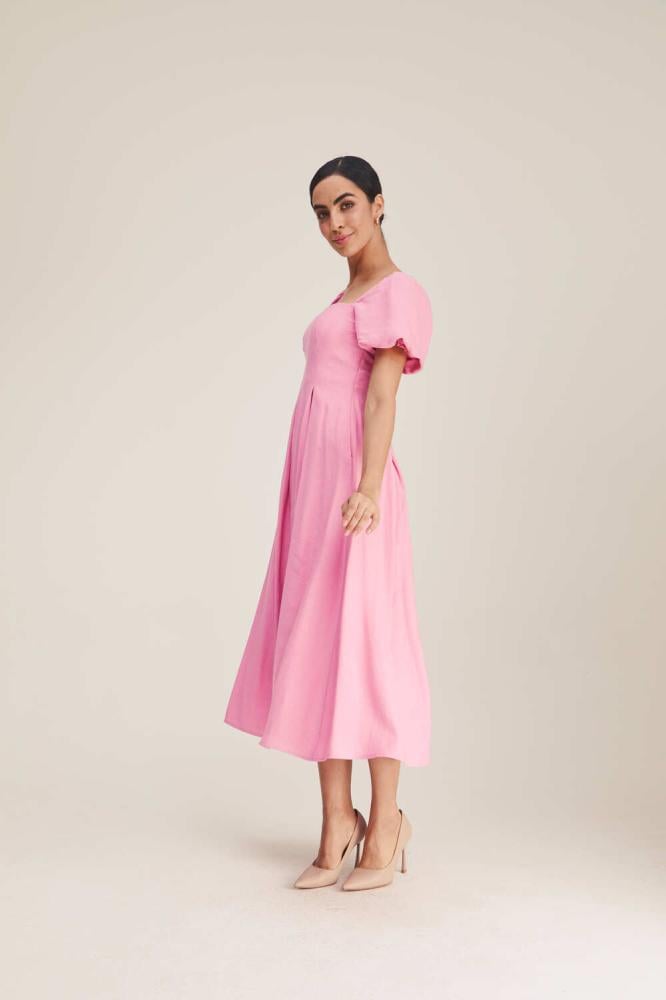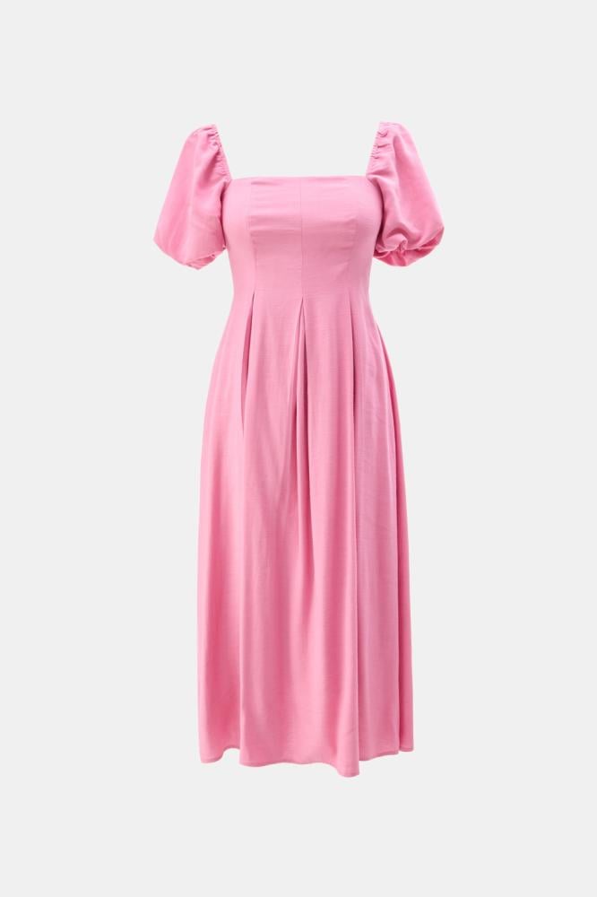 فستان بلون جذاب مفعم بالأنوثة والأناقة يتميز بأكمام منفوخة وفتحة رقبة واسعة ، مصمم بطيات ناعمة وقصة جذابة