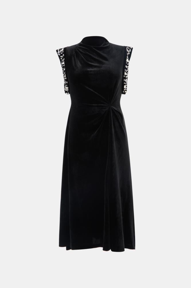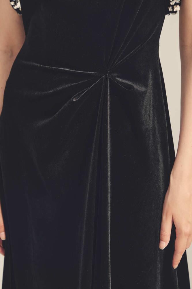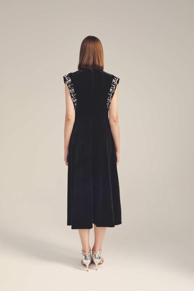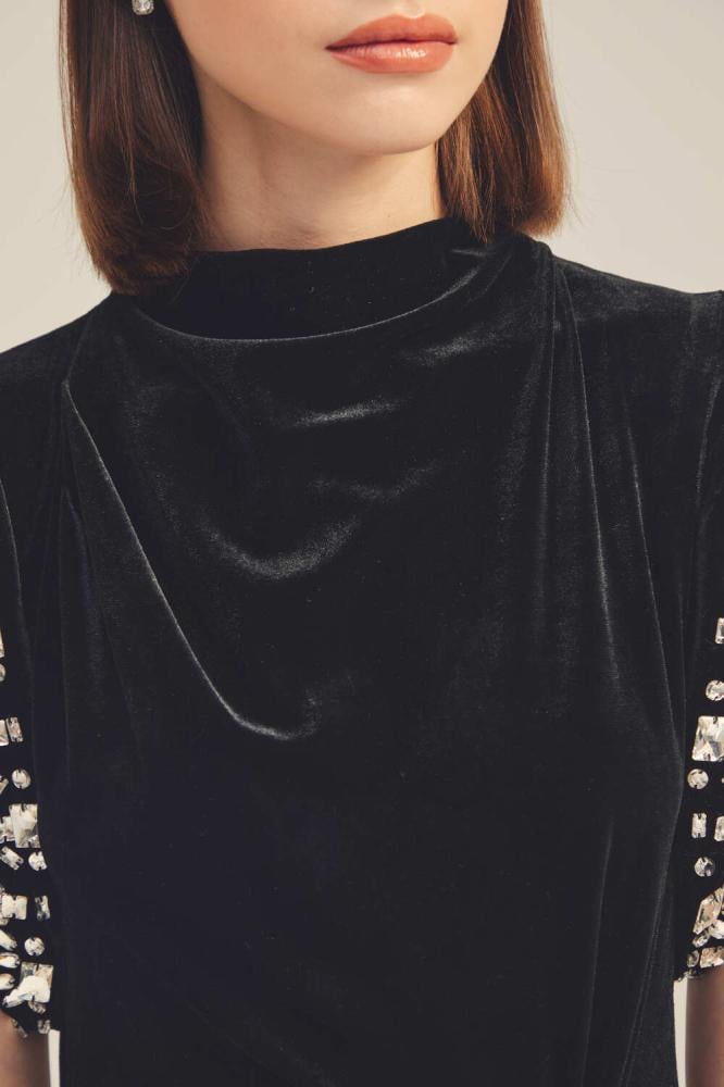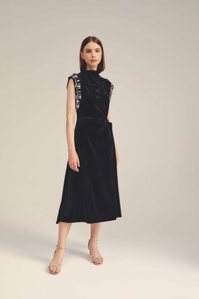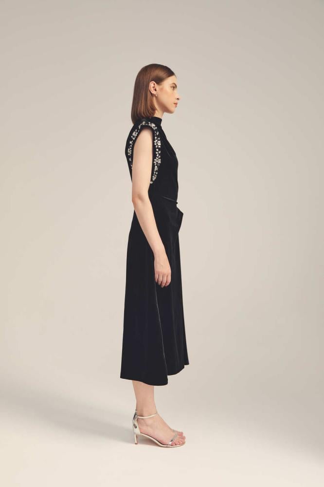 فستان ملكي من المخمل الفاخر، تتألق أكتافه بأحجار براقة تمنحه لمسة ساحرة. تفاصيل الثنيات تنساب برقي لتبرز جمال قوامك بأناقة لا مثيل لها. تصميم يجمع بين الفخامة والجاذبية، يجعلك تتألقين بثقة في كل مناسبة.