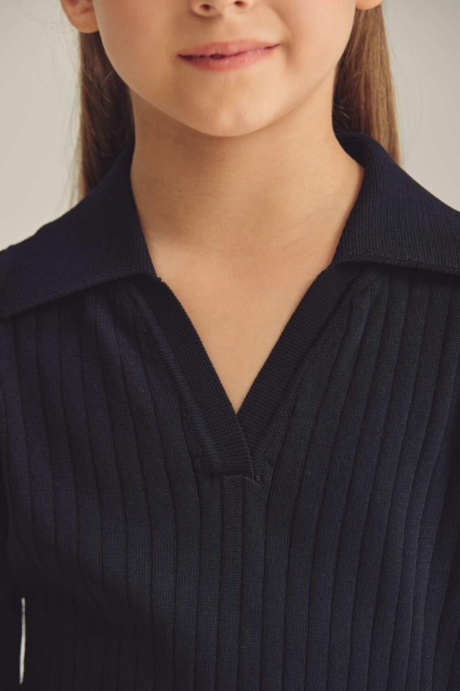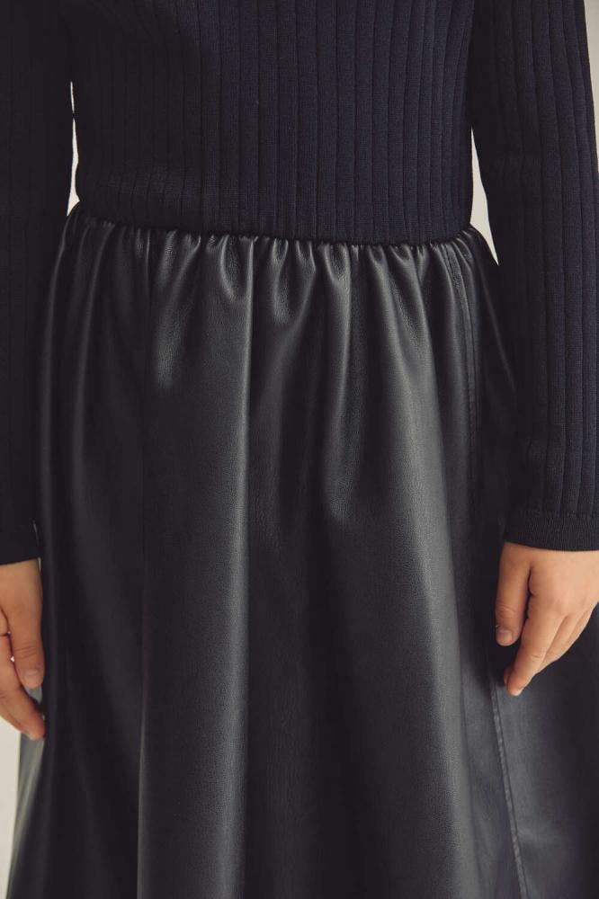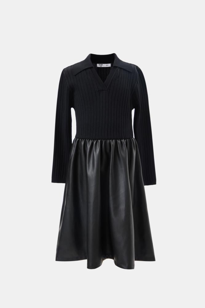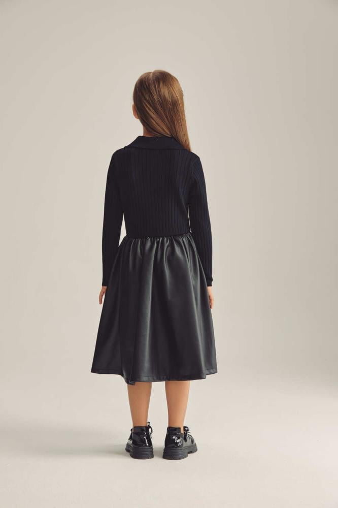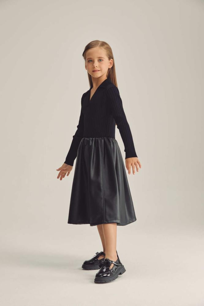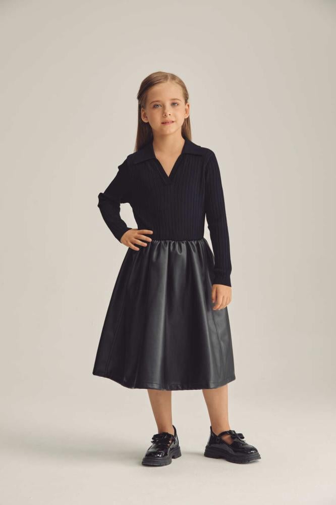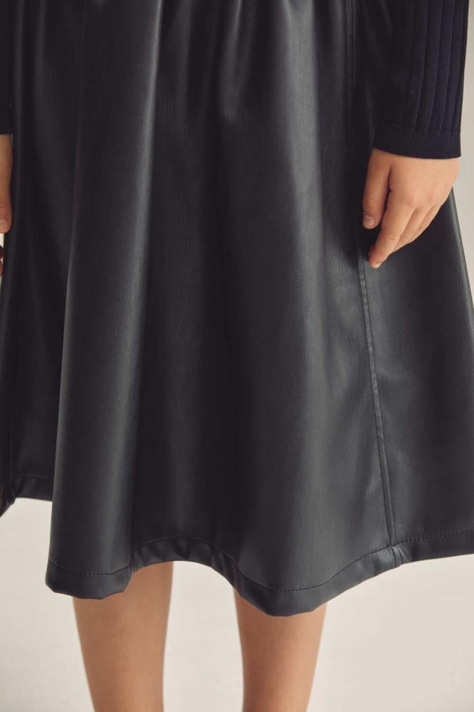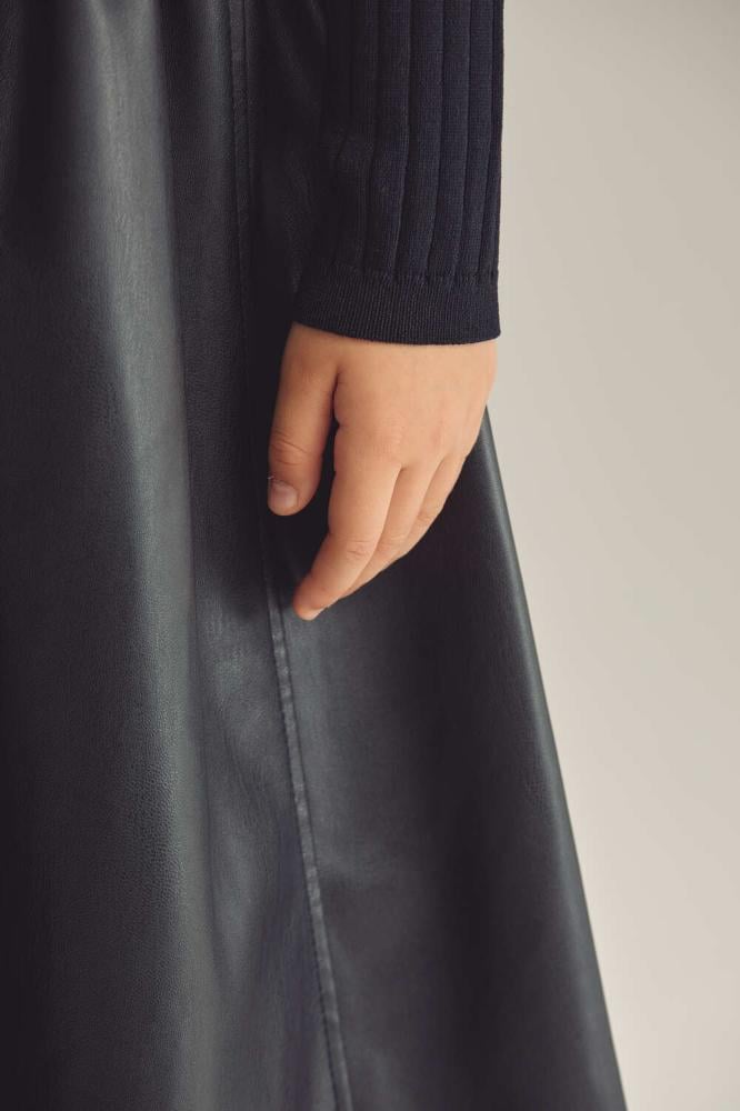 فستان بناتي بتصميم أنيق يجمع بين الأناقة التقليدية والعصرية. الجزء العلوي مصنوع من قماش محبوك ومصمم بتنورة جلد بثنيات بسيطة .