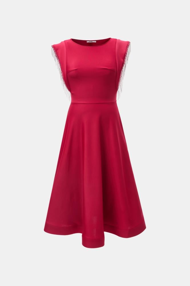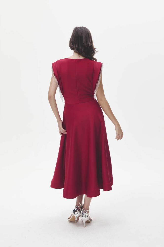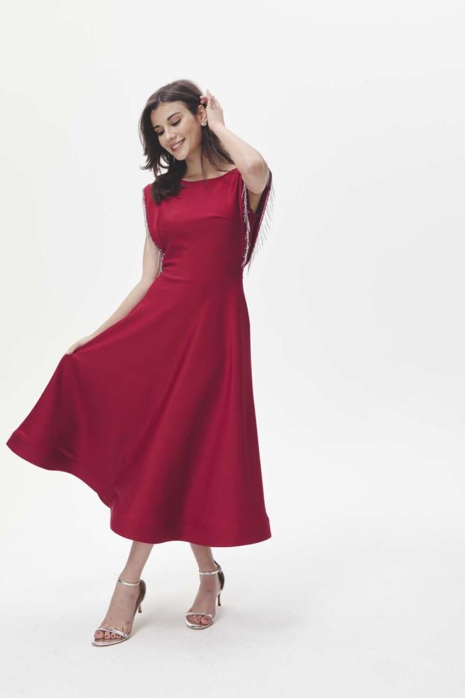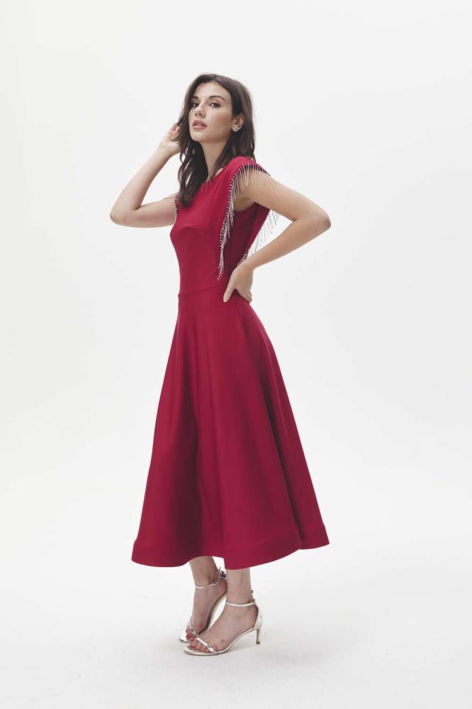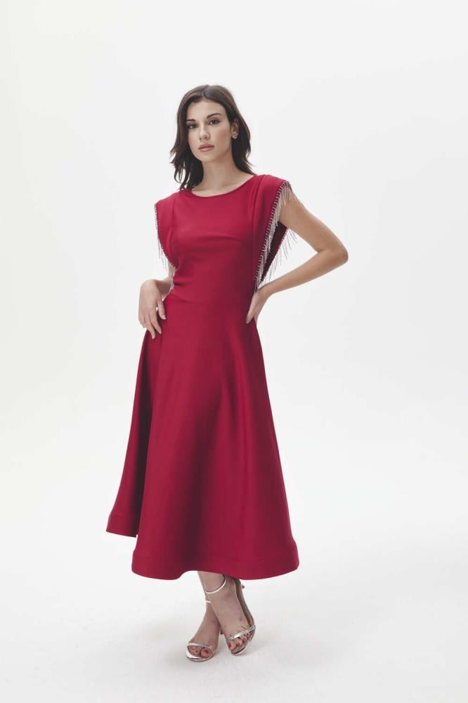 لإطلالة أنثوية ساحرة، فستان ناعم بقصة على شكل حرف A، مصمم بياقة مستديرة وبأكمام قصيرة ، ومزين بشراشيب مرصعة بالكريستال