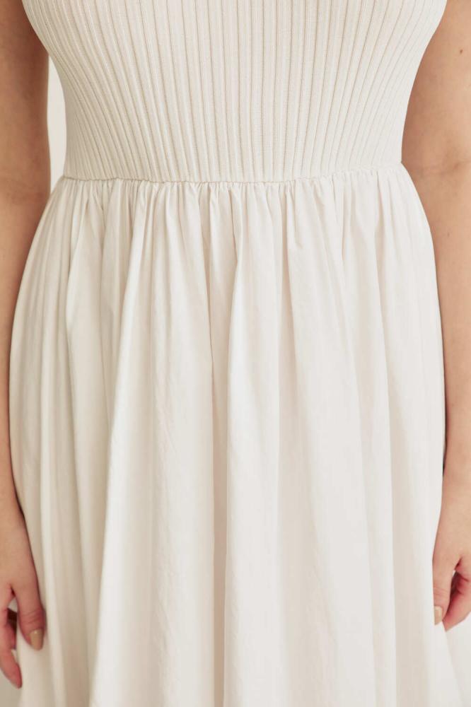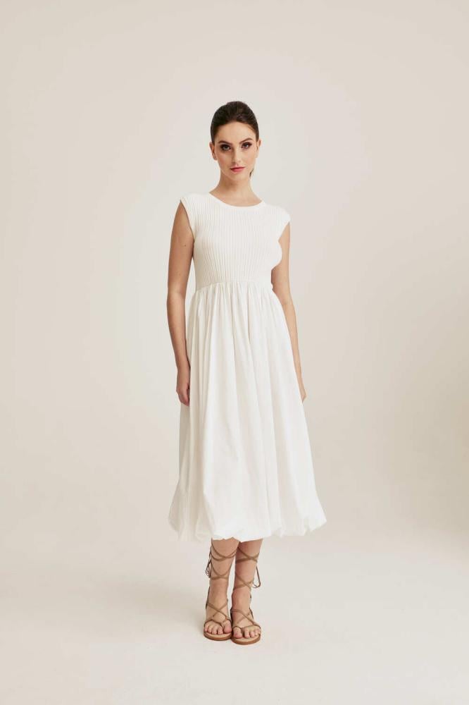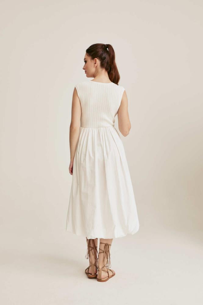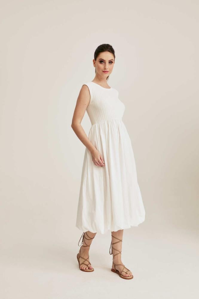 فستان بتصميم منفوخ مفعم بالأنوثة، مصمم من أعلى بخامة محبوكة تنسدل بتنورة بطيات وقصة منفوخة ، ويتميز بفتحة رقبة مستديرة وأكمام قصيرة ،نسقيه مع صندل بمقدمة مفتوحة لإطلالة صيفية متكاملة.
