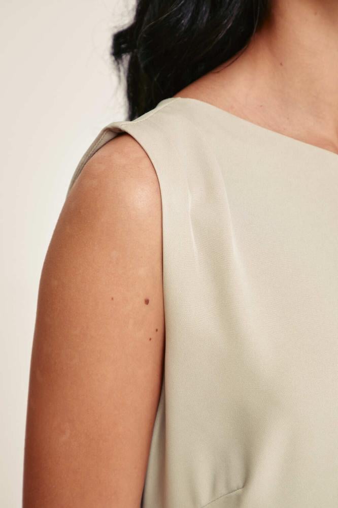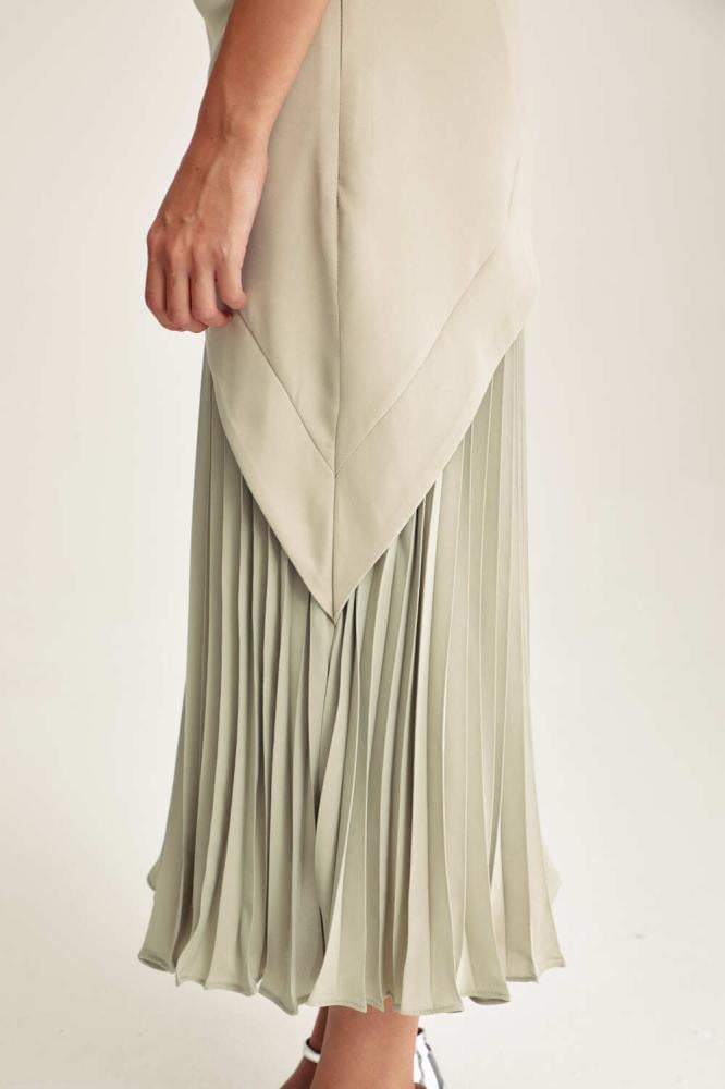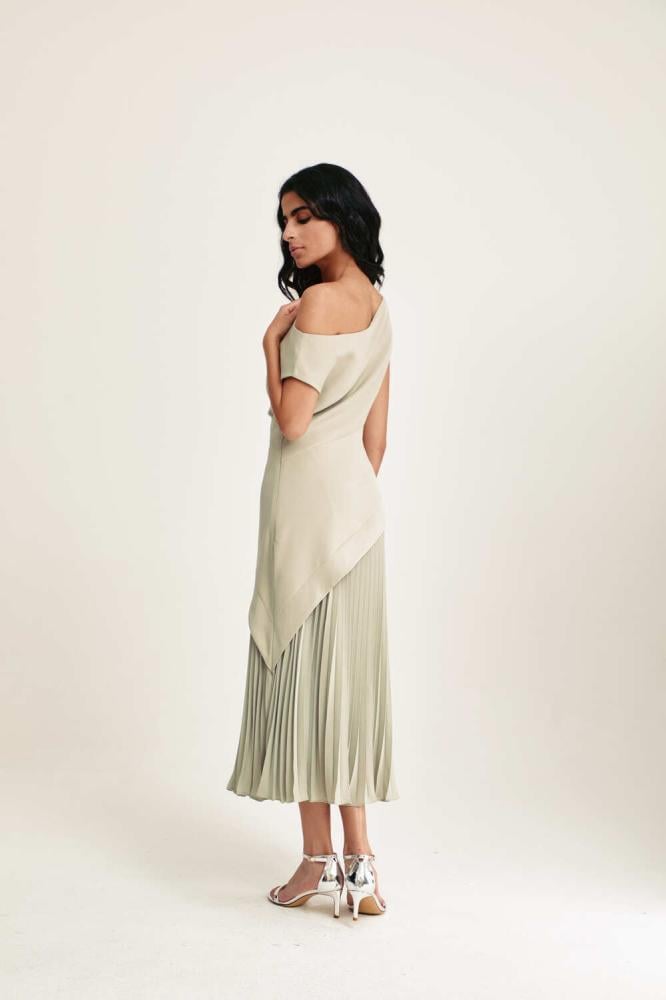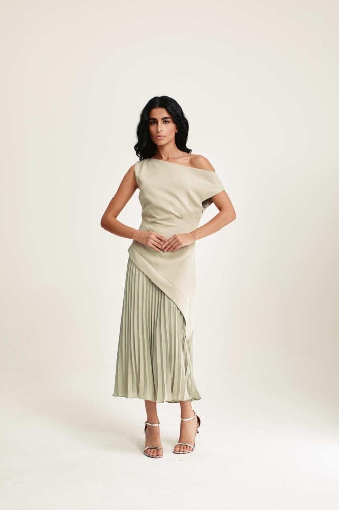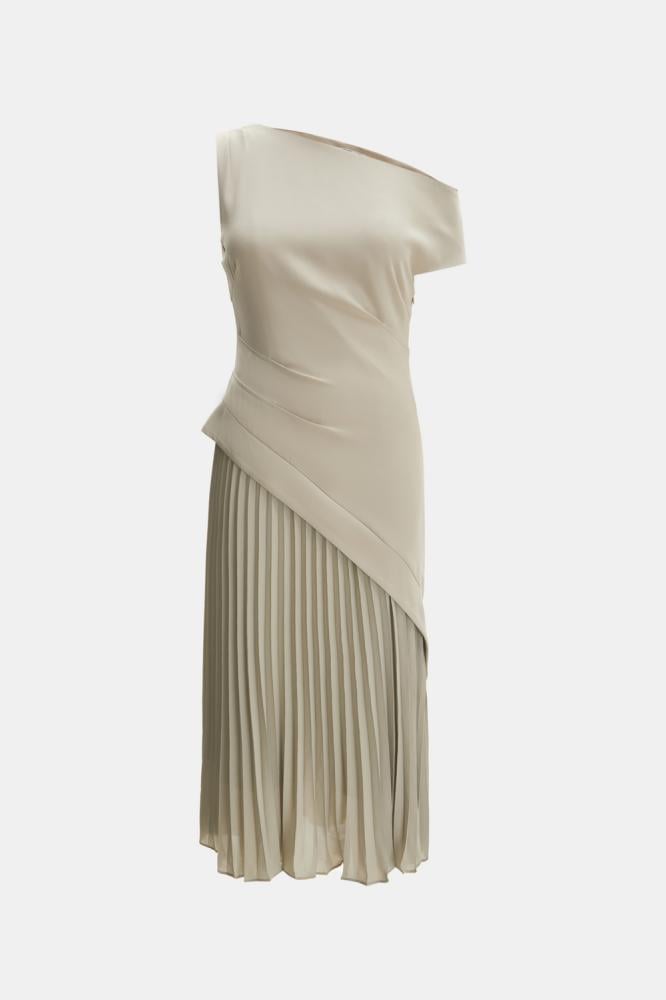 فستان بكتف واحد يتميز بتفاصيل درابية أنيقة، تصميم يبرز جمال القوام بطريقة ناعمة ومتناسقة. تنسدل كسرات من الأسفل لتمنح حركة وانسيابية رائعة مع كل خطوة،