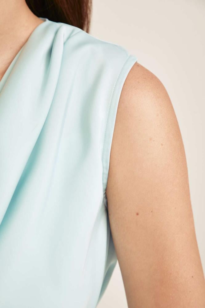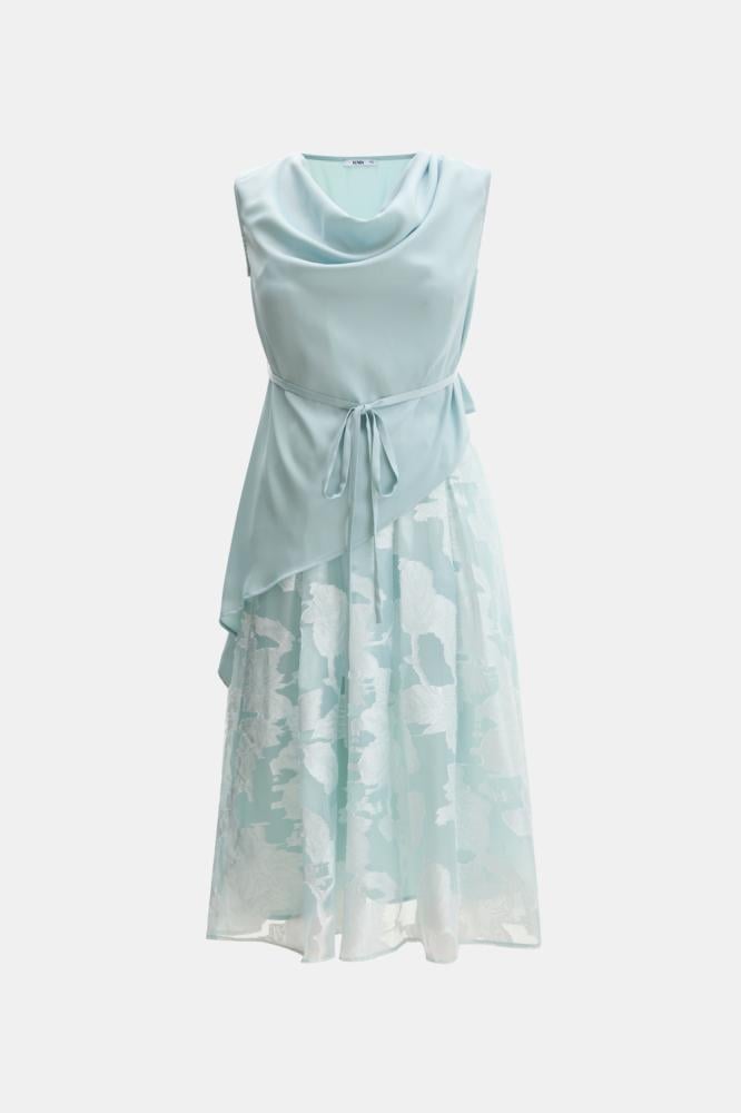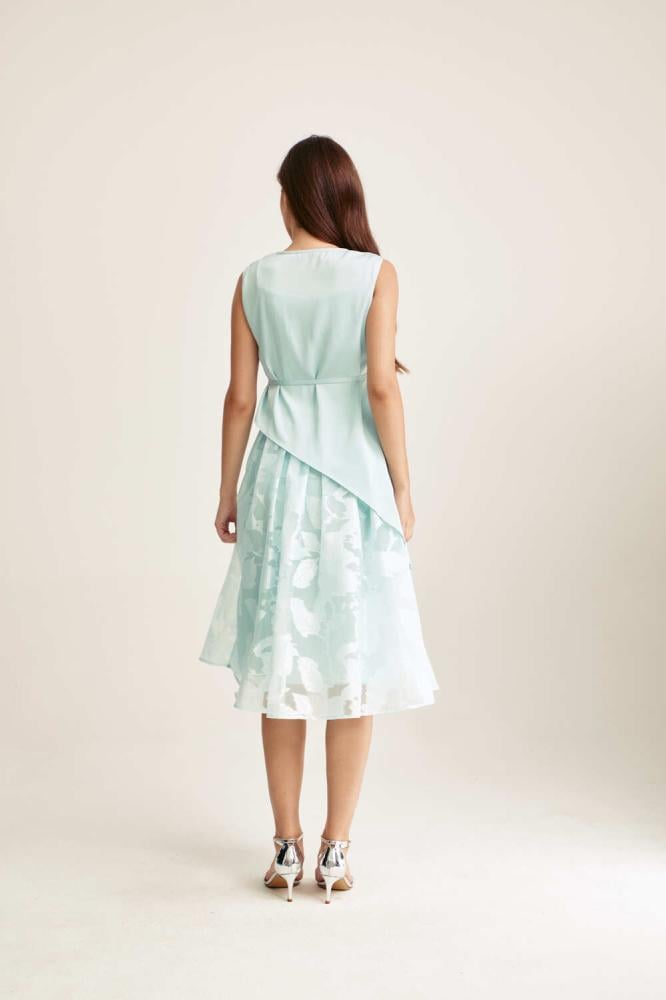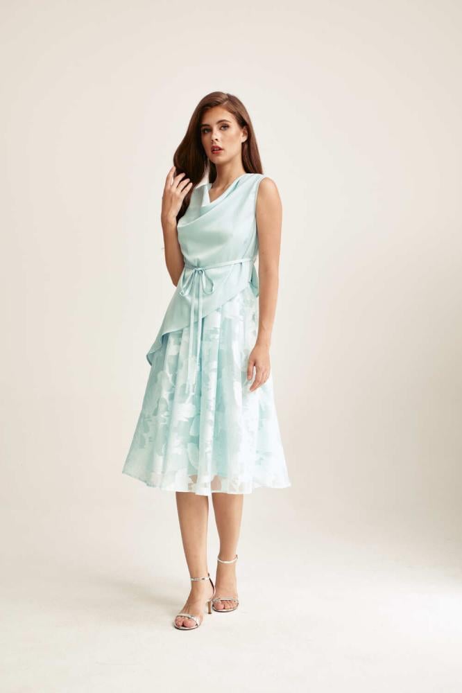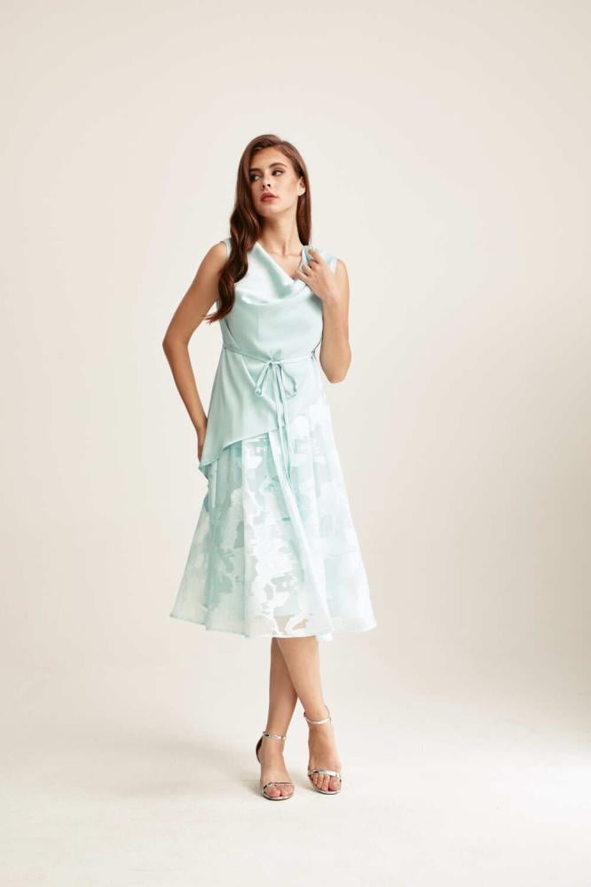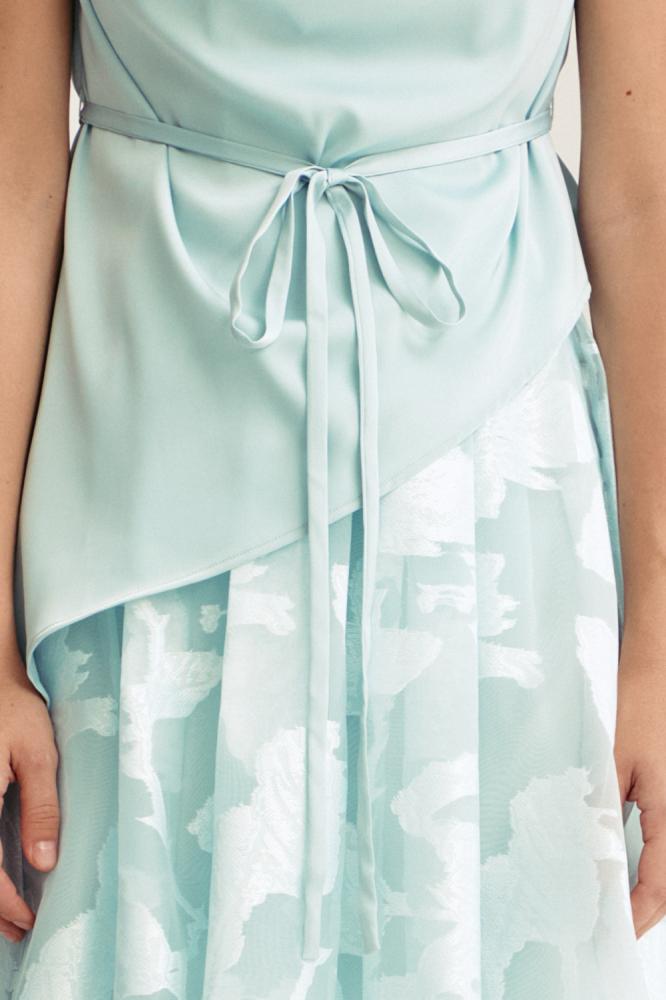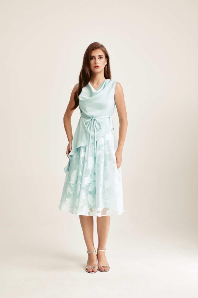 فستان بتصميم قطعتين، يتميز ببلوزة بياقة متدلية لمظهر راقٍ وانسيابي. وبقصة غير متماثلة تضيف لمسة عصرية جذابة. تنسدل التنورة الواسعة المصنوعة من الجاكار بطيات ناعمة، مما يمنحك لمسة فخامة وانسيابية مثالية للمناسبات الخاصة.