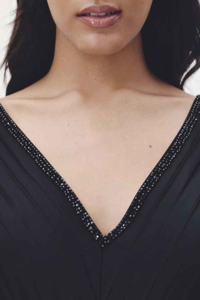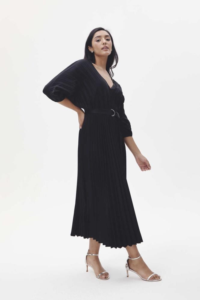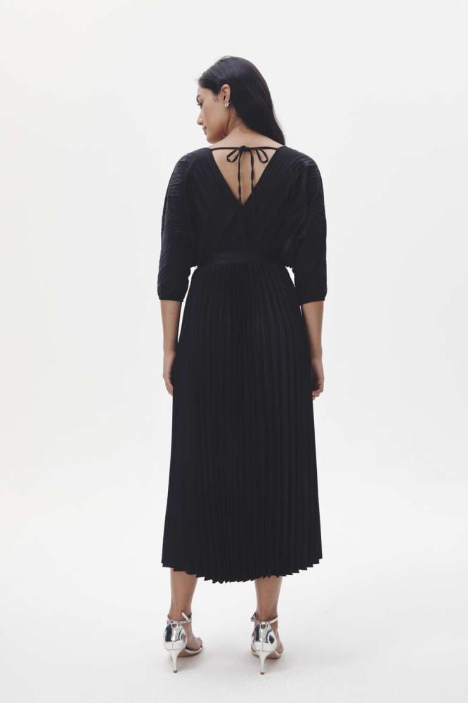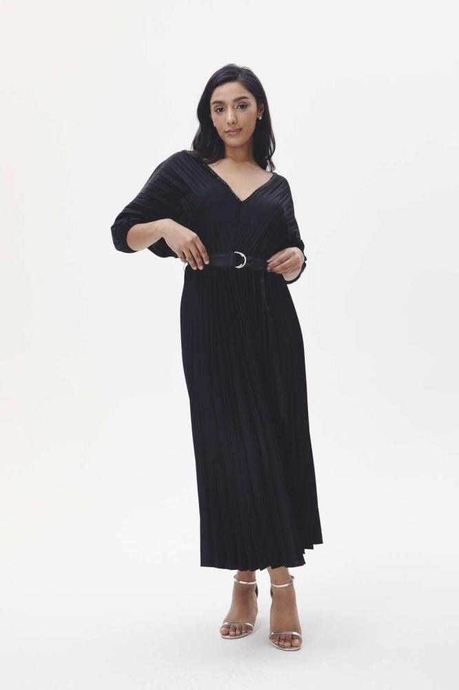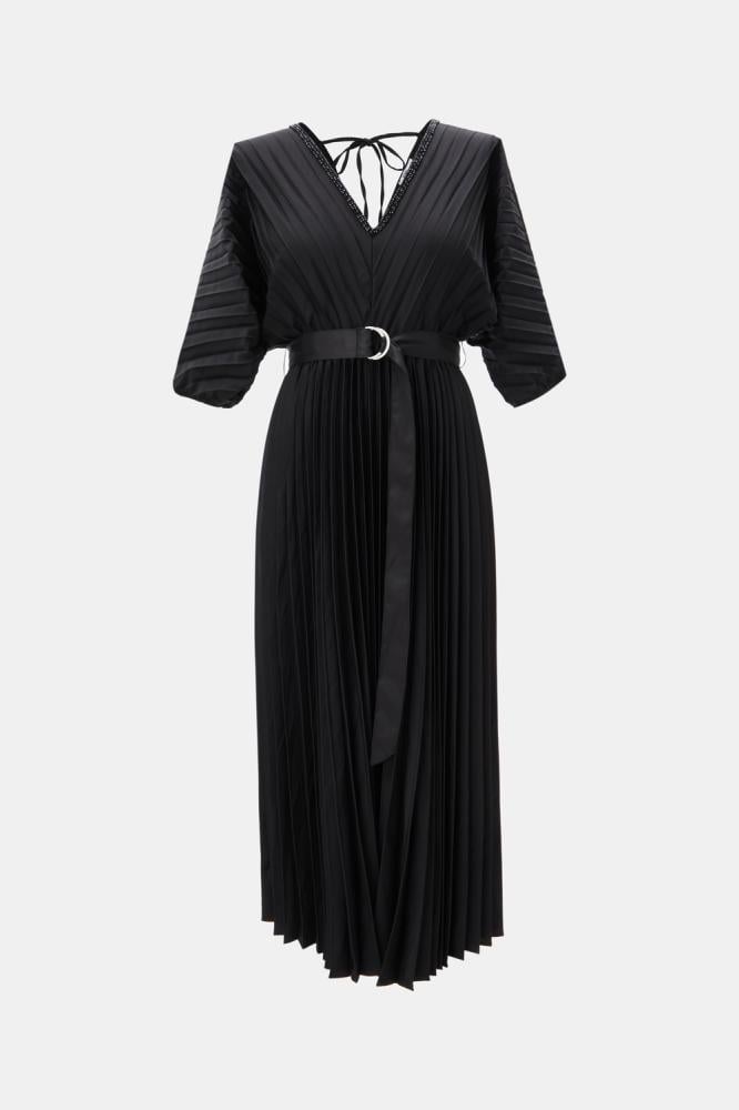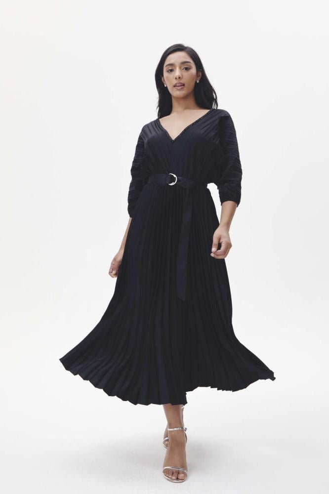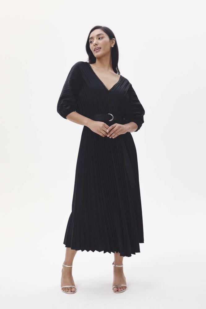 يجمع هذا الفستان التفاصيل الكلاسيكية والتصميم العصري . ويتميز بقصة مفعمة بالأنوثة وياقة V مزدانة بالخرز ، بأكمام متوسطة الطول وأساور مطاطية ،ويأتي مع حزام من نفس الخامة