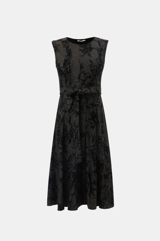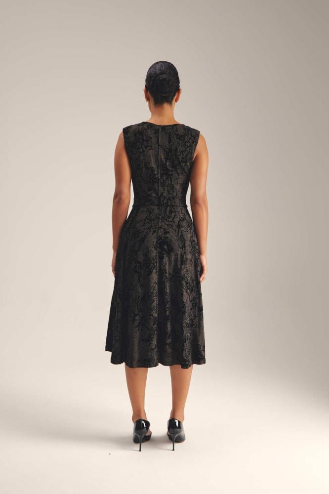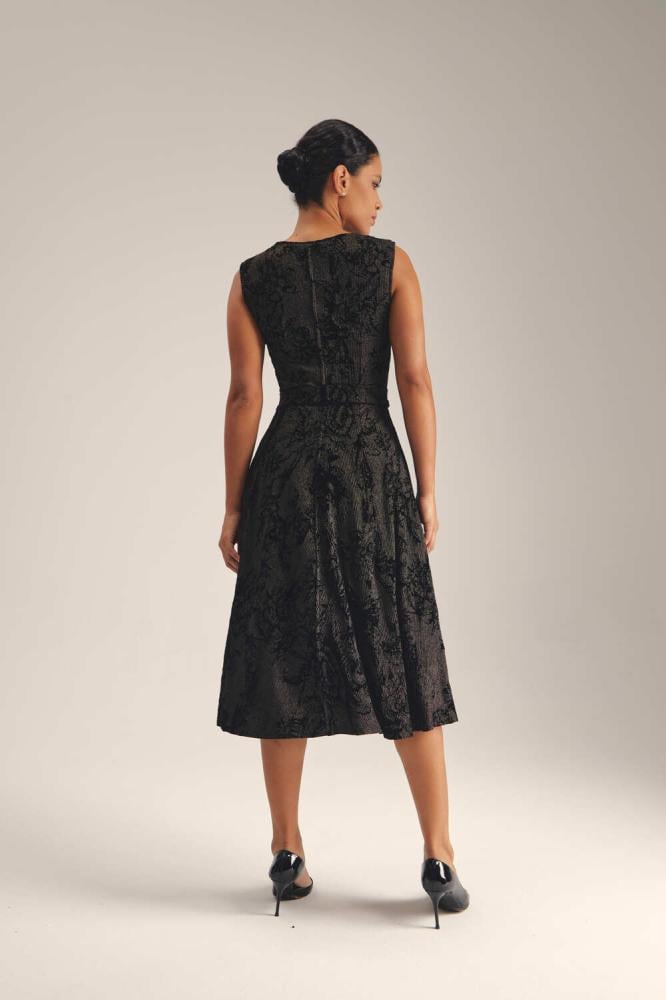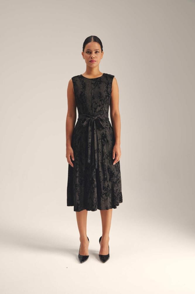 For your special occasion look, a dress that combines luxury and femininity, with a round neckline and sleeveless design, featuring velvet floral patterns with shiny touches, and a cut that highlights the beauty of your figure. It also comes with a tie belt.
