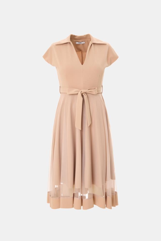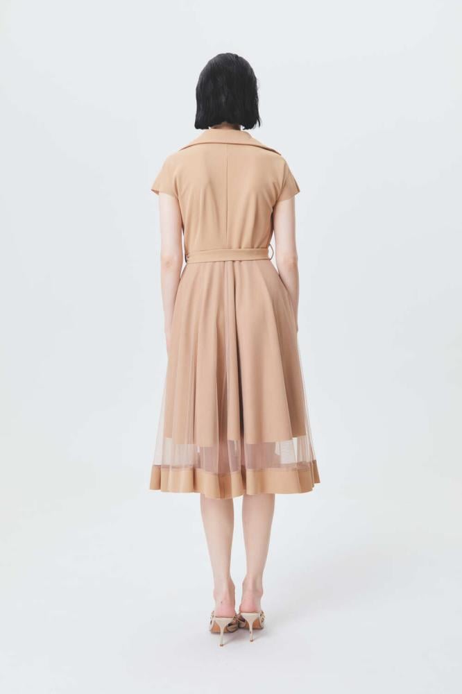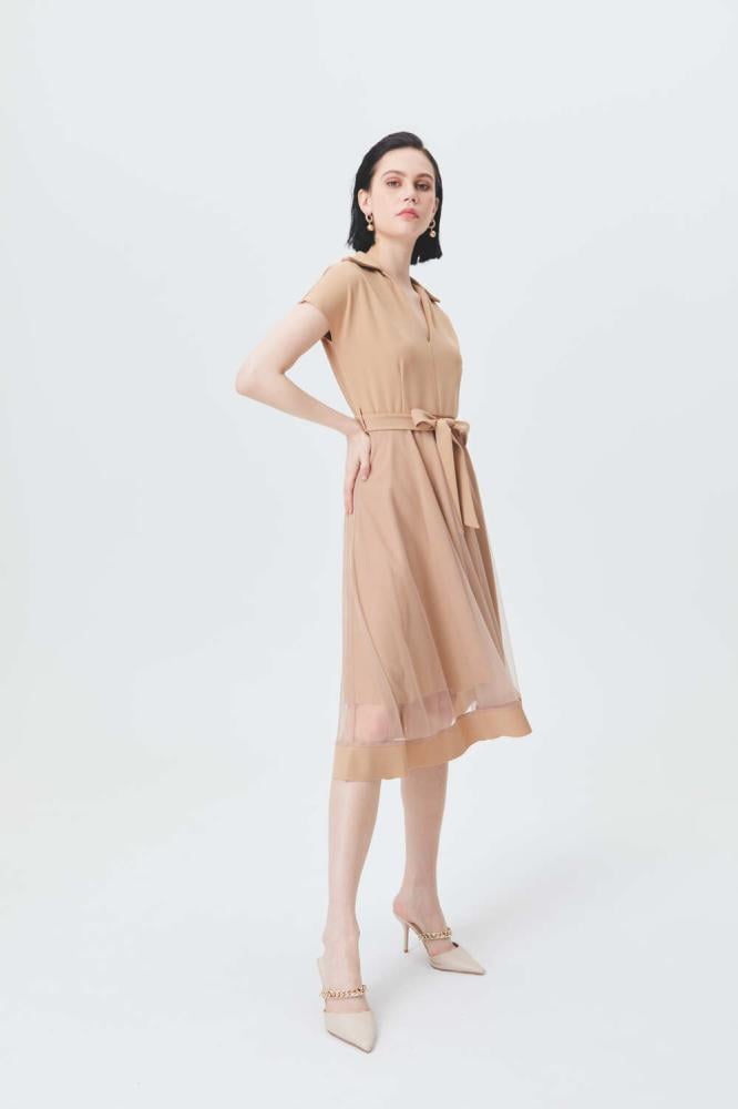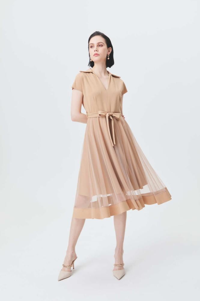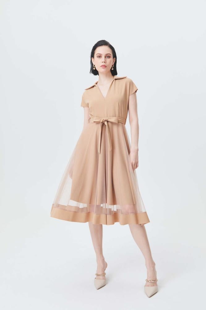 - يمتاز الفستان بطول متوسط، مما يجعله مناسبًا لكافة المناسبات سواء كانت رسمية أو غير رسمية، كما يمكن ارتداؤه في المكتب أو خلال العشاء المسائي.