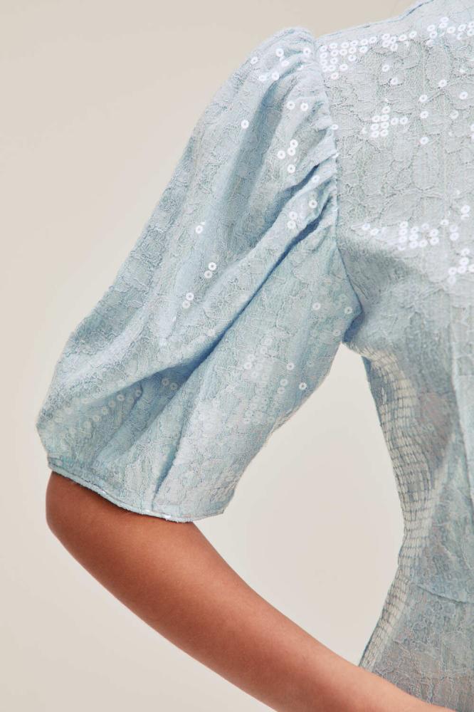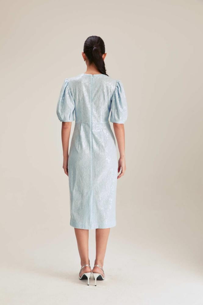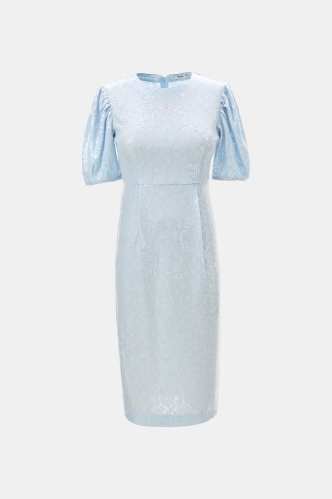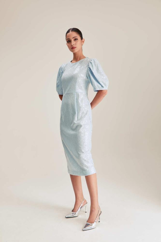 تألقي بإطلالة براقة في مناسباتك الراقية بفستان بتصميم جذاب بقصة تبرز جمال قوامك وبتصميم بياقة مستديرة وبأكمام منفوخة .