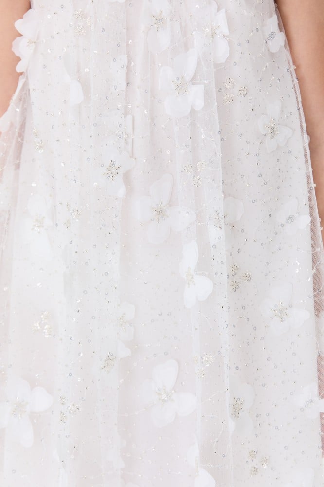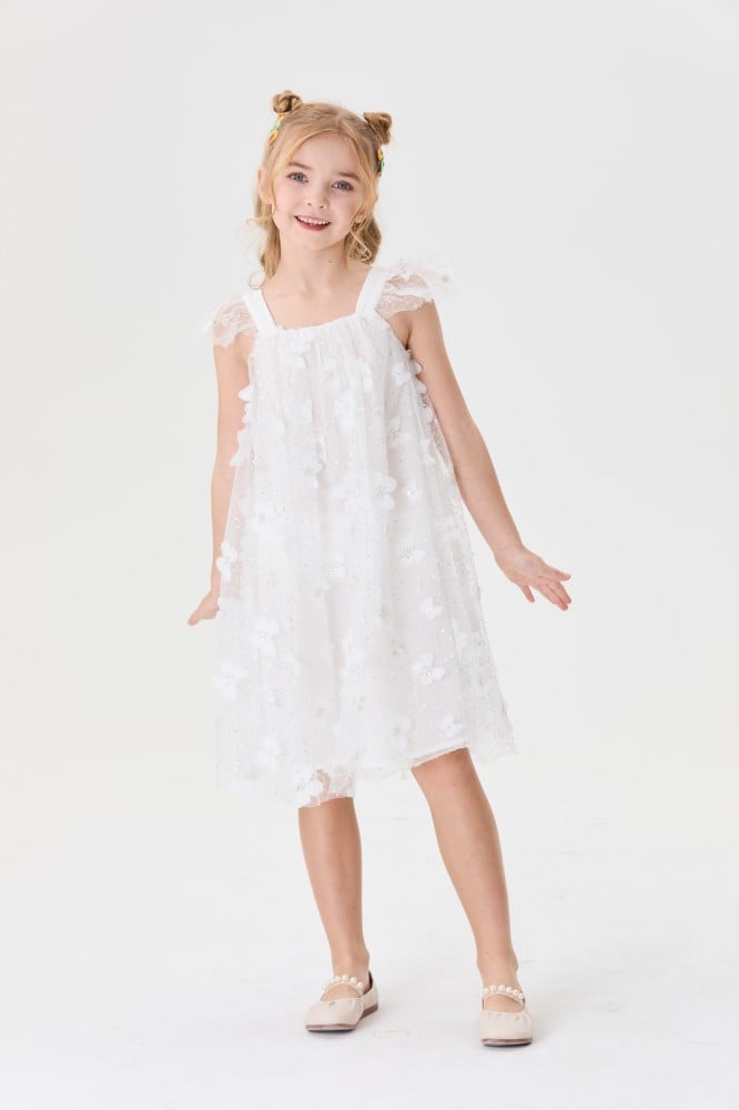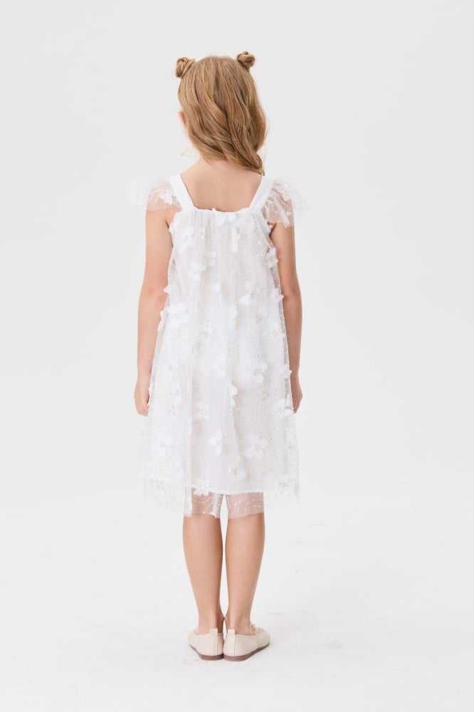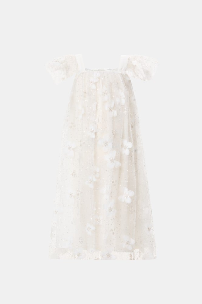 أضيفي إلى مجموعة صغيرتكم المختارة للمناسبات المميزة هذا الفستان الساحر . يأتي بقصة فضفاضة أنيقة مغطاة بطبقة مزينة بالترتر والخزر لإضفاء لمسة براقة على التصميم. تميز بفتحة رقبة مربعة وأكمام تول بكشكش.