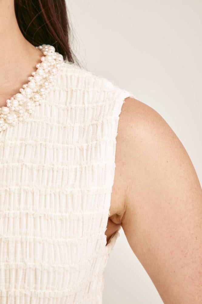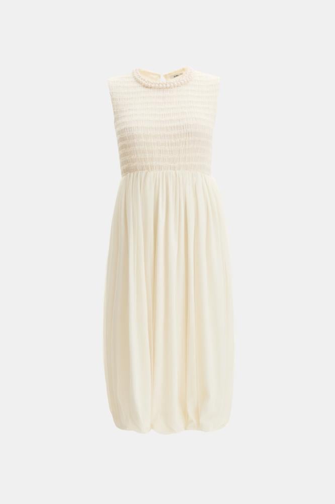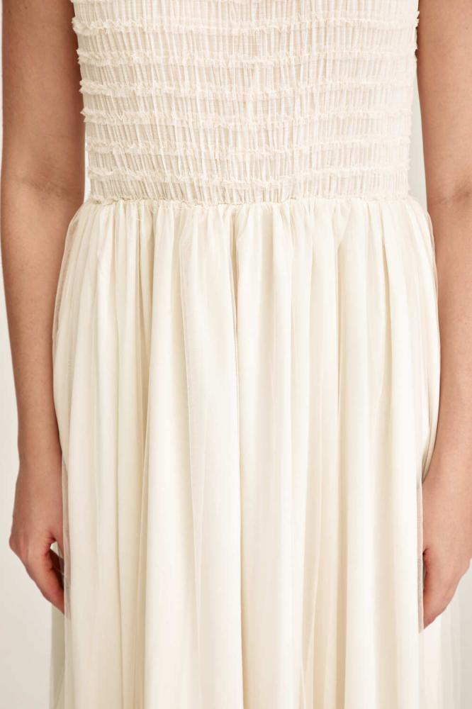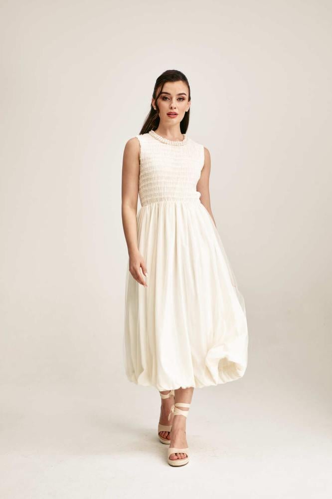 فستان تول ناعم بياقة مزينة باللؤلؤ، بتفاصيل مزمومة من الأعلى تضيف لمسة فاخرة، وتنورة بكسرات تنسدل بانسيابية ، مع خصر مطاطي يمنحك راحة وأناقة في آنٍ واحد.