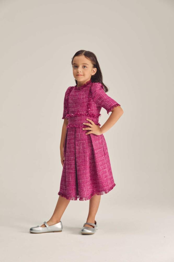 Give your little girl a princess-like look! This tweed dress features a round neck, short sleeves, sequin details, and tasseled edges, giving your little girl a luxurious look.