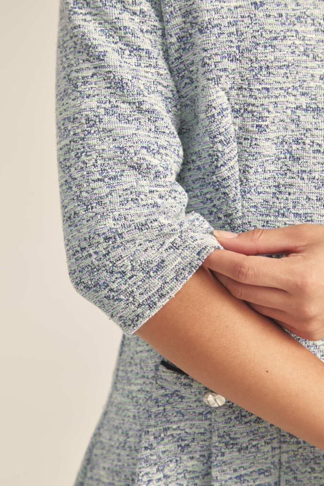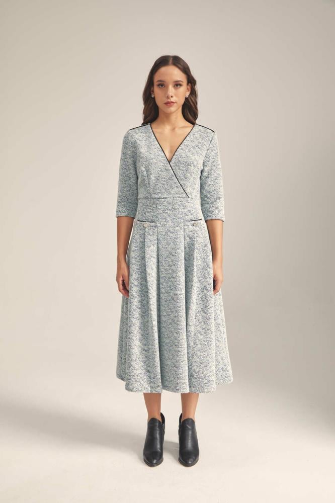فستان كلاسيكي مفعم بالأنوثة ،يتميز بياقة لف وبأكمام متوسطة الطول ، بتصميم بقصة جذابة ضيقة الخصر وعلى شكل حرف A ومزين بجيوب .
