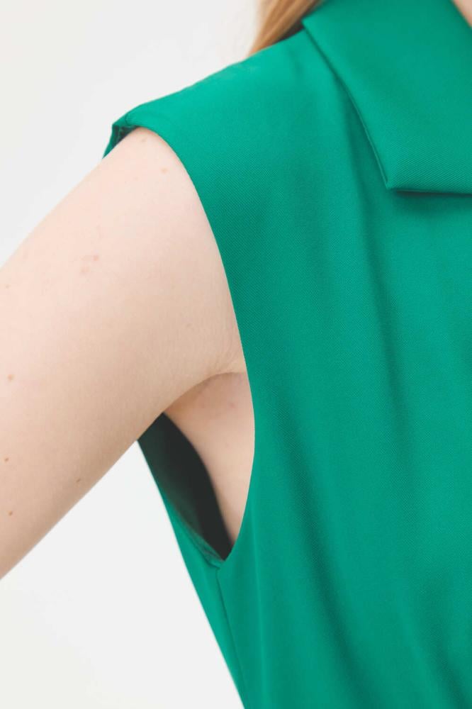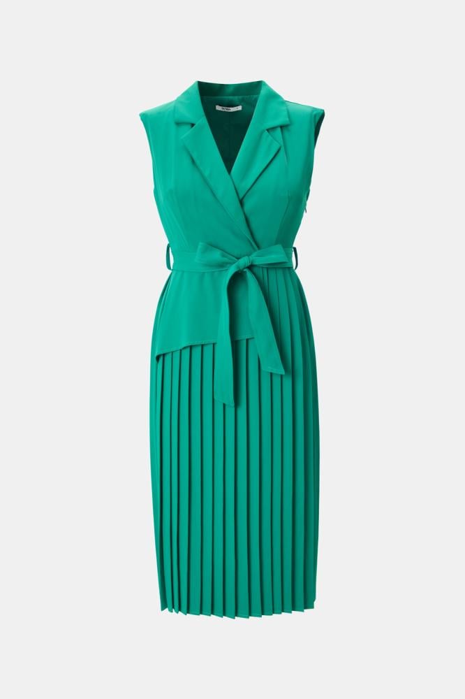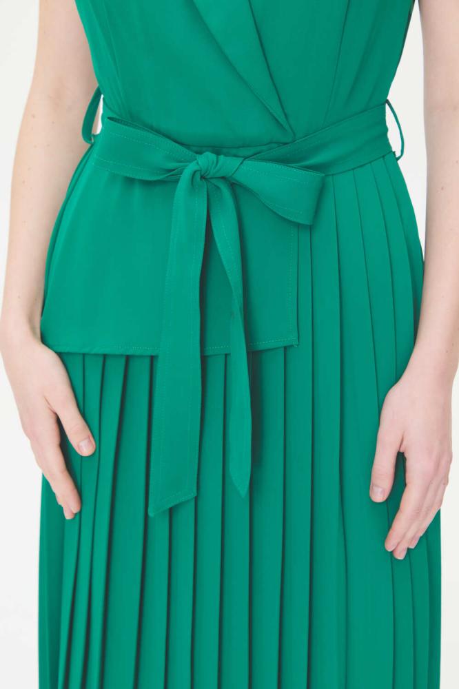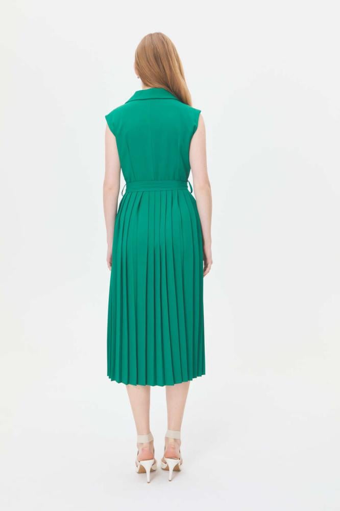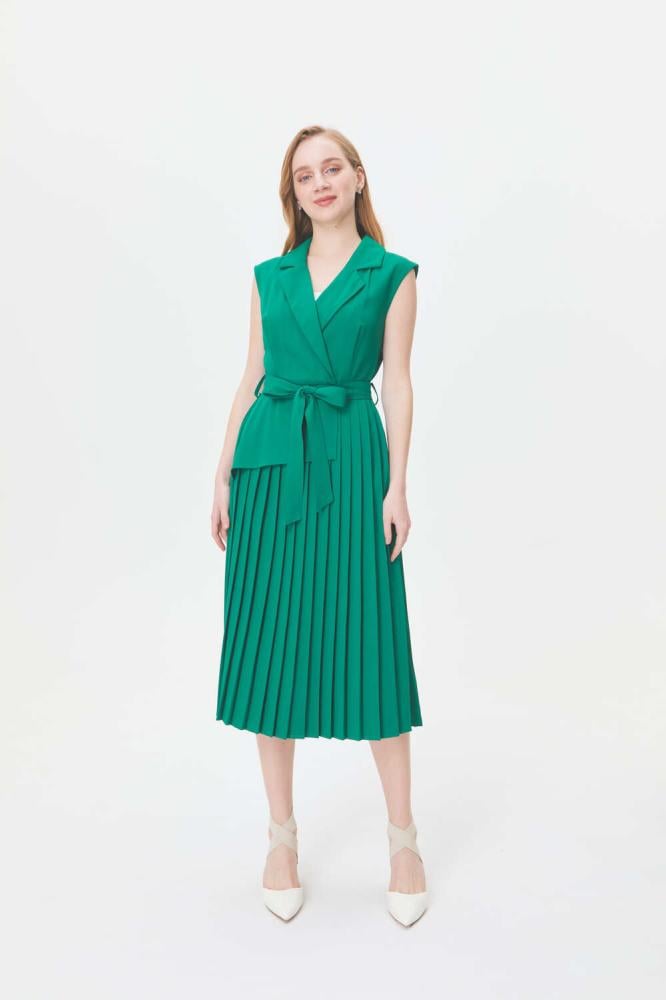 لأناقة انثوية جذابة اعتمدي هذا الفستان في مناسباتك ، يتميز بياقة مطوية و بدون أكمام ويتميز بتنورة بليسيه كما ويأتي مع حزام ربط