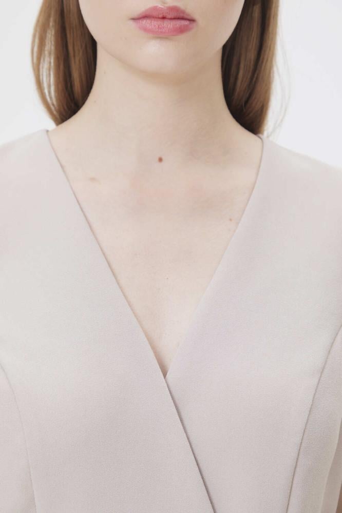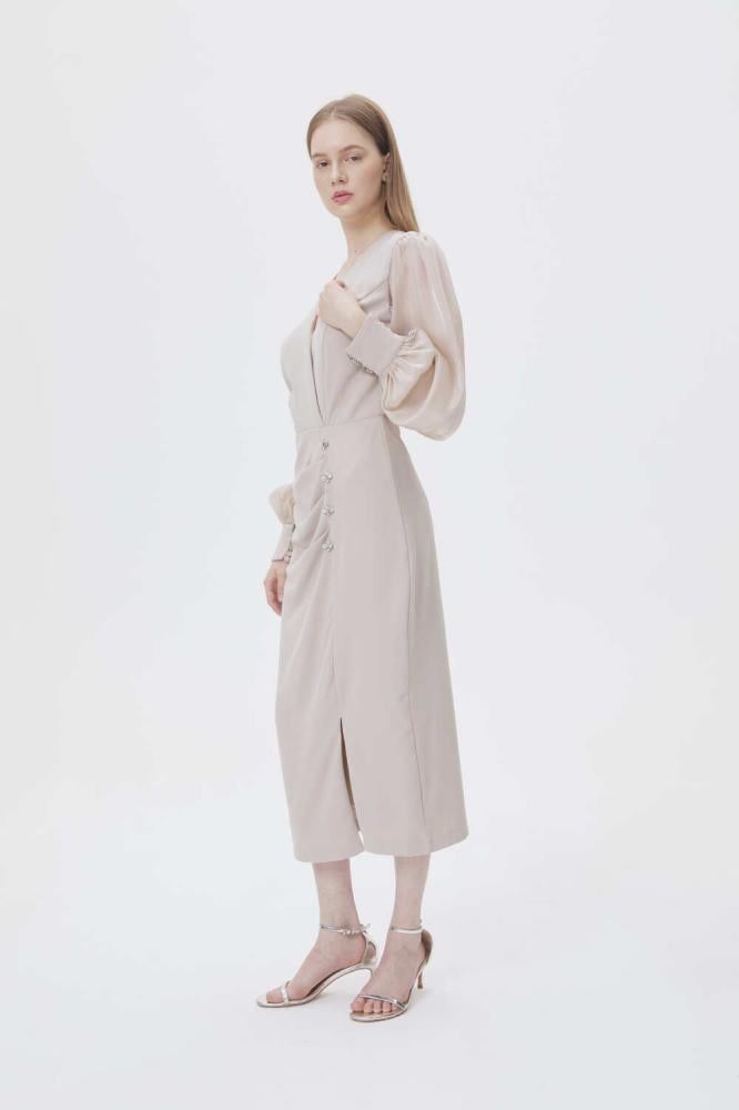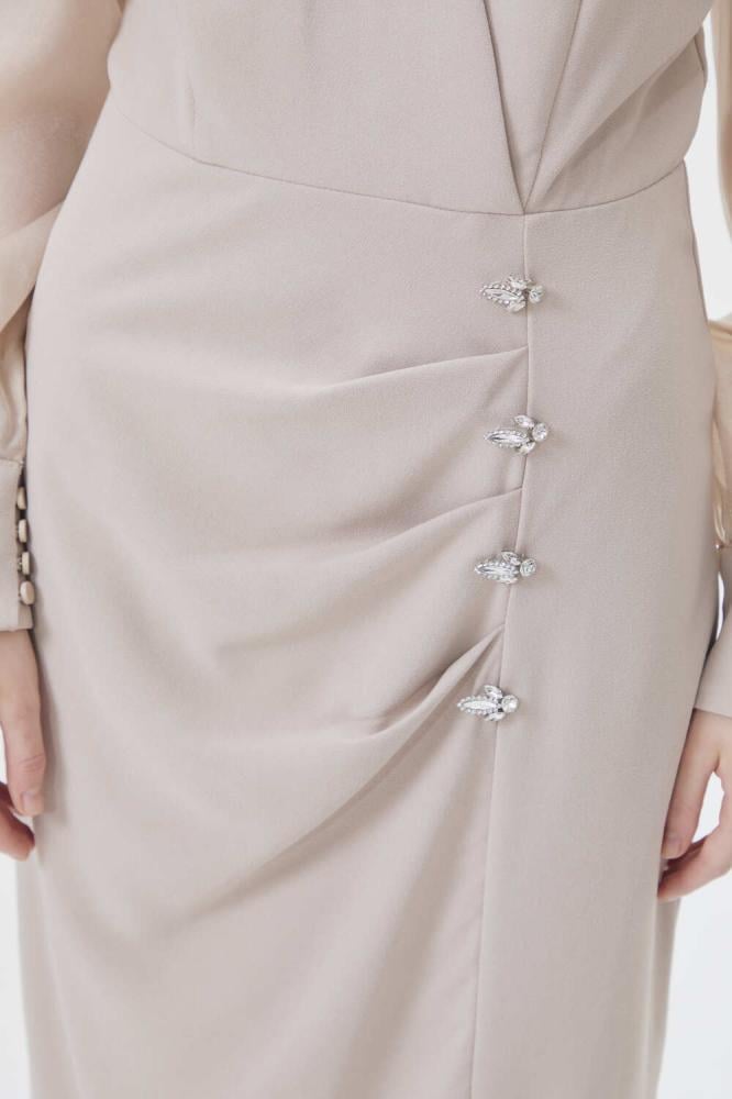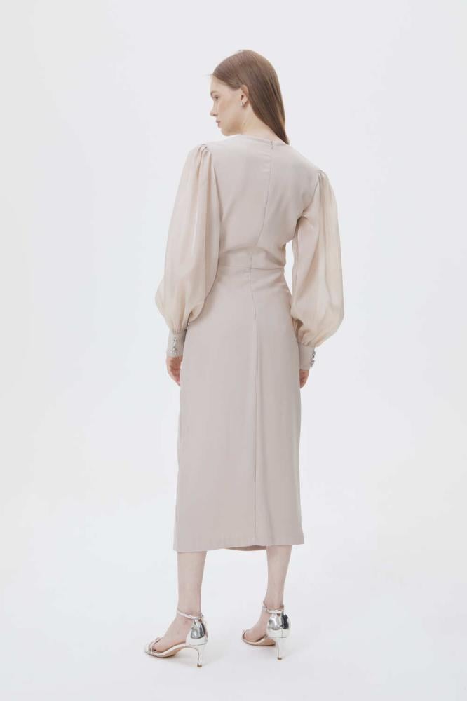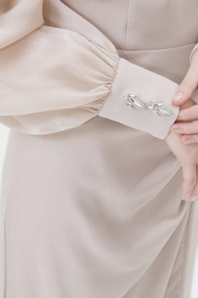فستان بياقة لف أنيقة وتصميم يجمع بين الكسرات الجذابة عند الخصر وأكمام منفوخة شفافة تضيف لمسة من الفخامة. ومزين بأحجار براقة وفتحة من أسغل ، يعتبرخيار مثالي لإطلالة أنثوية مبهرة في مناسباتك الخاصة.