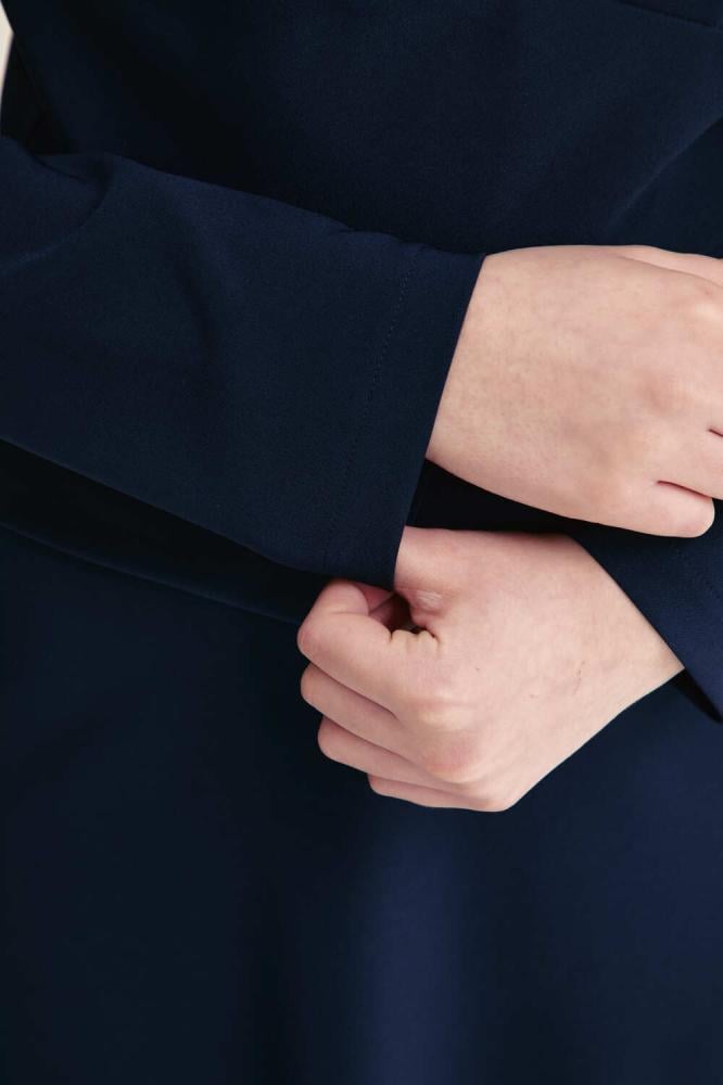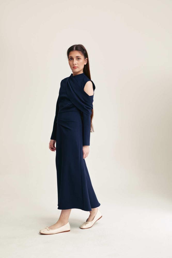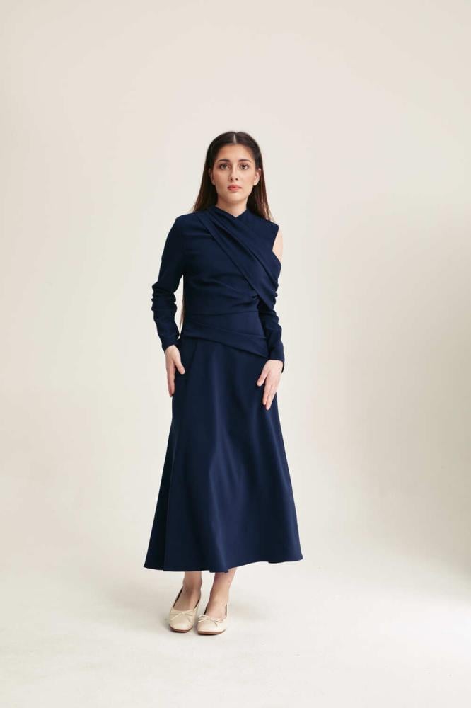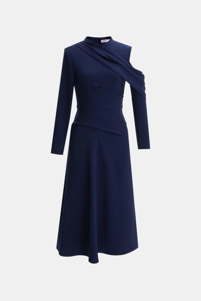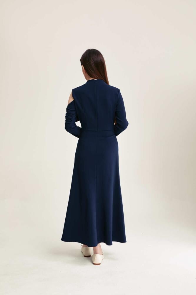 فستان كحلي بأكمام طويلة وياقة ضيقة، بقصة ناعمة درابية تمنح أناقة متكاملة ورقي ، مثالي للمناسبات والحفلات، تصميم أنثوي يجمع بين الفخامة والراحة لإطلالة جذابة ومميزة
