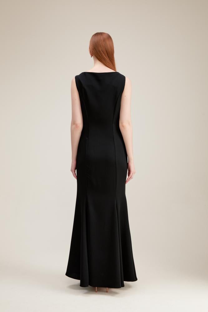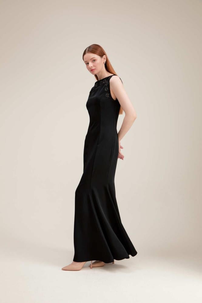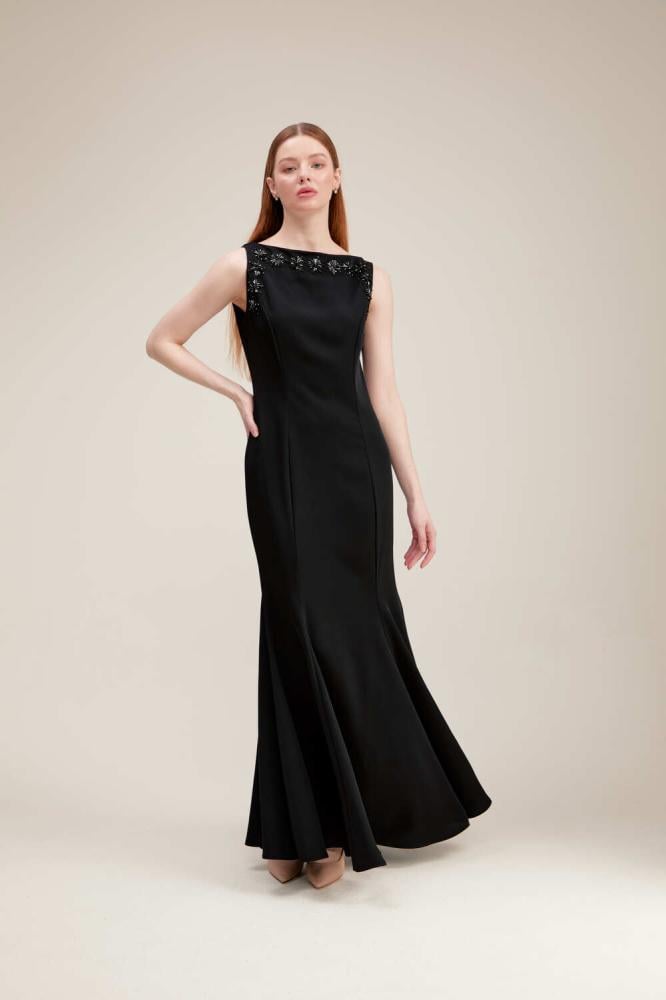 فستان سهرة اسود بتصميم الحورية من سنبل، هو اختيار يتحدث عن الأناقة والروعة، هذا الفستان الطويل يمتاز بقصة حورية تبرز القوام بشكل ساحر، مع ياقة قارب مزينة بالخرز تضيف جمالاً ورونقاً فريداً، اللون الأسود الكلاسيكي والخامة المصنوعة من الكريب الناعم تجعل هذا الفستان خياراً رائعاً للمناسبات الخاصة.