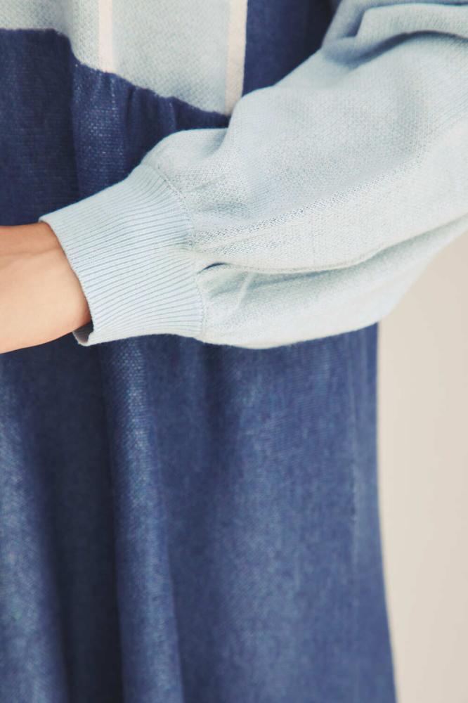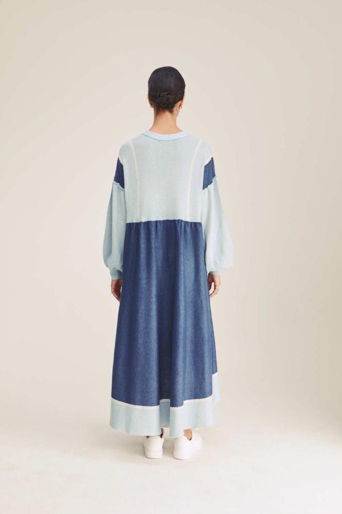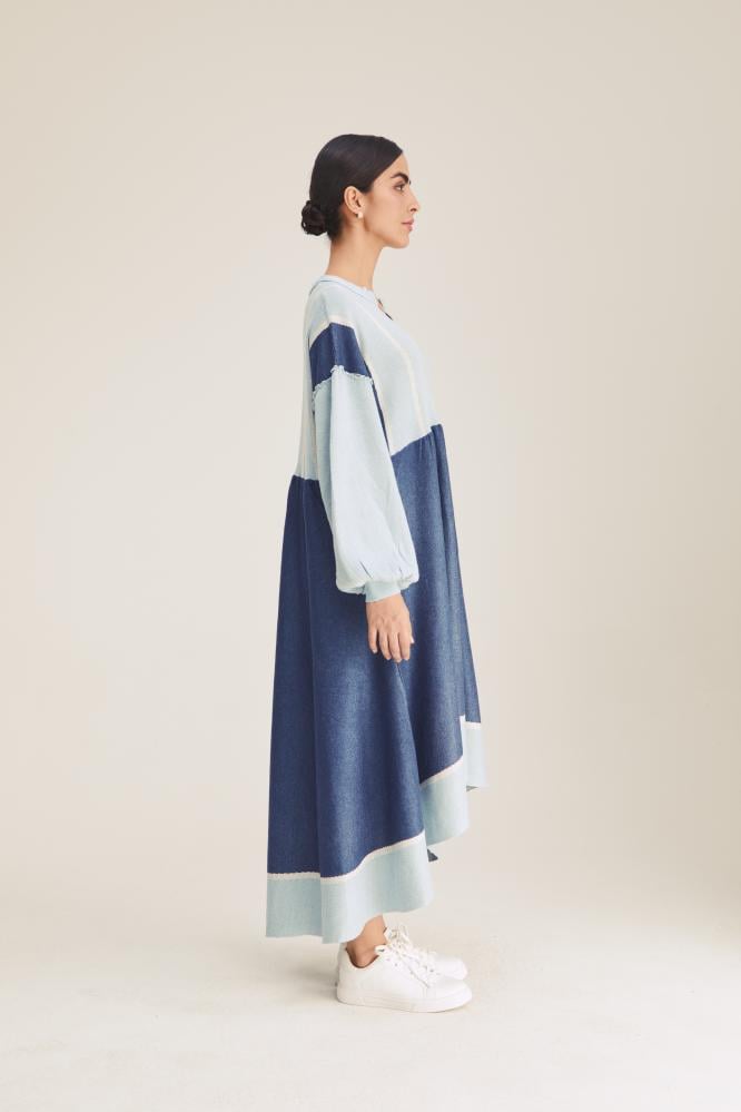 هذا الفستان مستوحى من روعة الألوان الباردة مع تصميم يجمع بين الكلاسيكية والحداثة. يتميز بقصته الفضفاضة التي تضمن الراحة والأناقة في آنٍ واحد، مع لمسات لونية متدرجة بين الأزرق و الأزرق الفاتح. الأكمام المنتفخة تضيف مظهراً ديناميكياً، والمزيج بين التفاصيل الناعمة والمرحة يجعله مثالياً للارتداء اليومي أو المناسبات الكاجوال