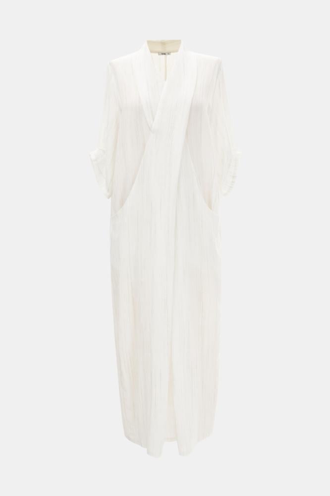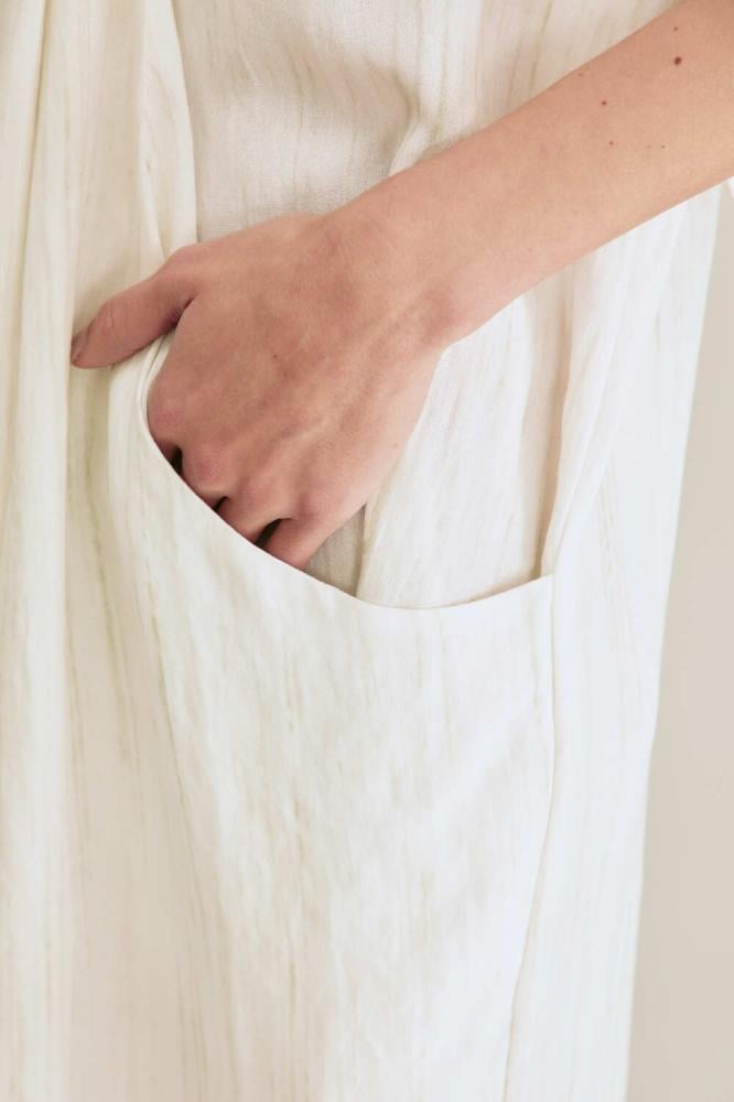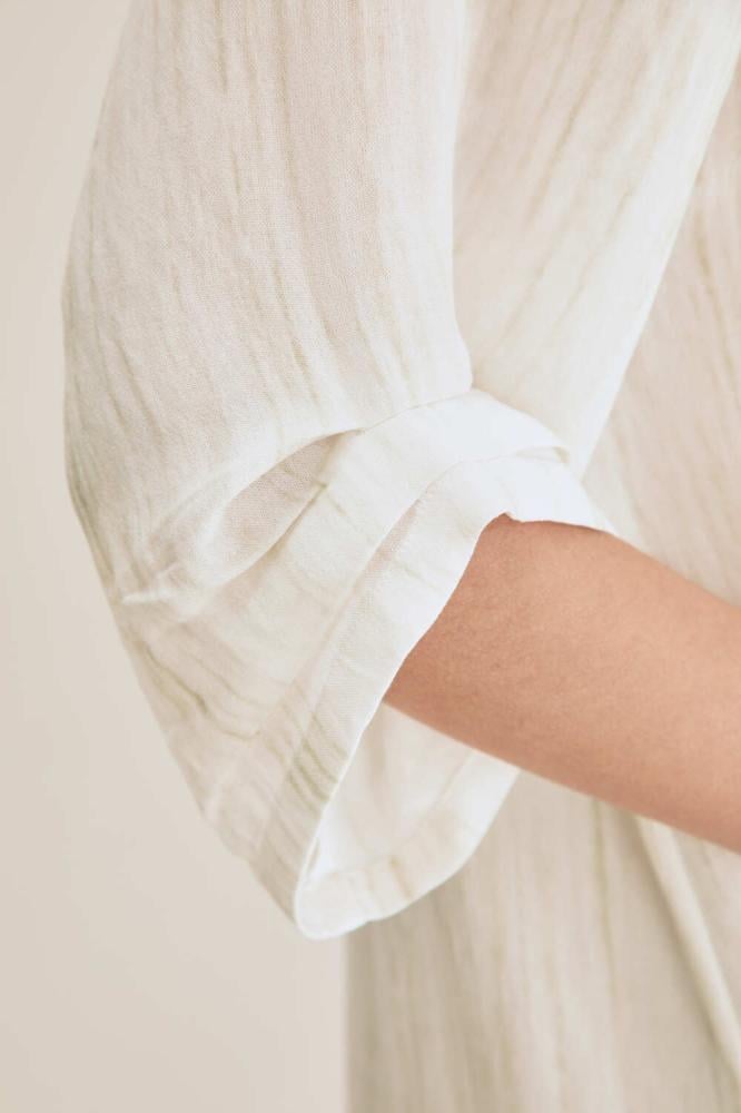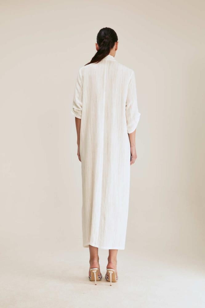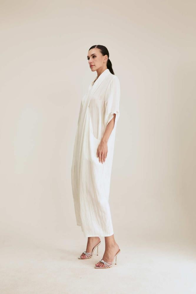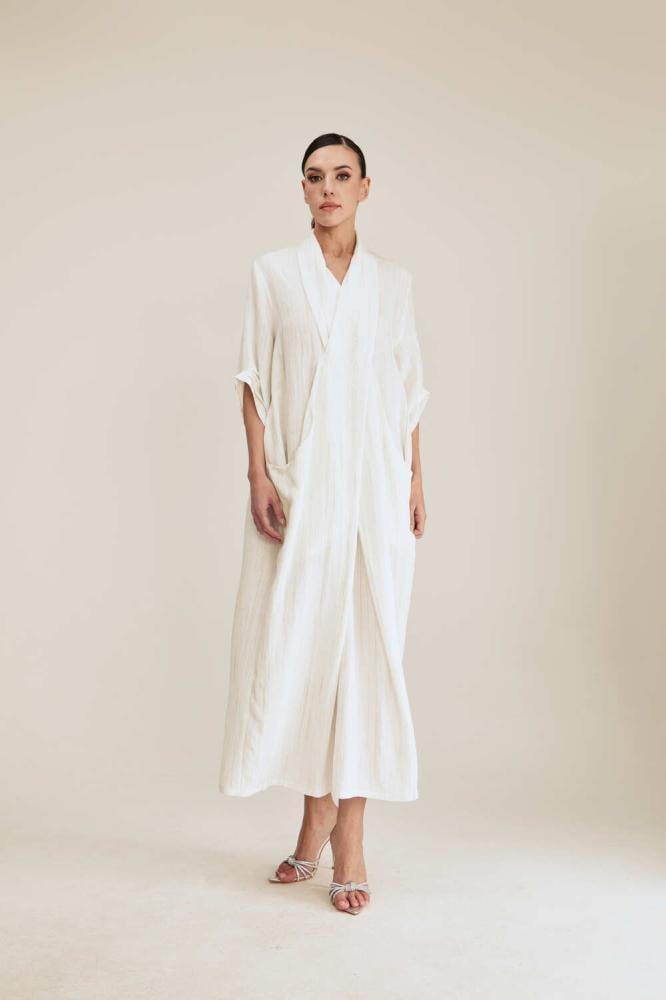 لأناقة ناعمة ومحتشمة انتقي قفطان مصمم بياقة بطية على شكل حرفV وبأكمام متوسطة الطول ،ومزين بنقوش مقلمة، ويأتي بجيوب .