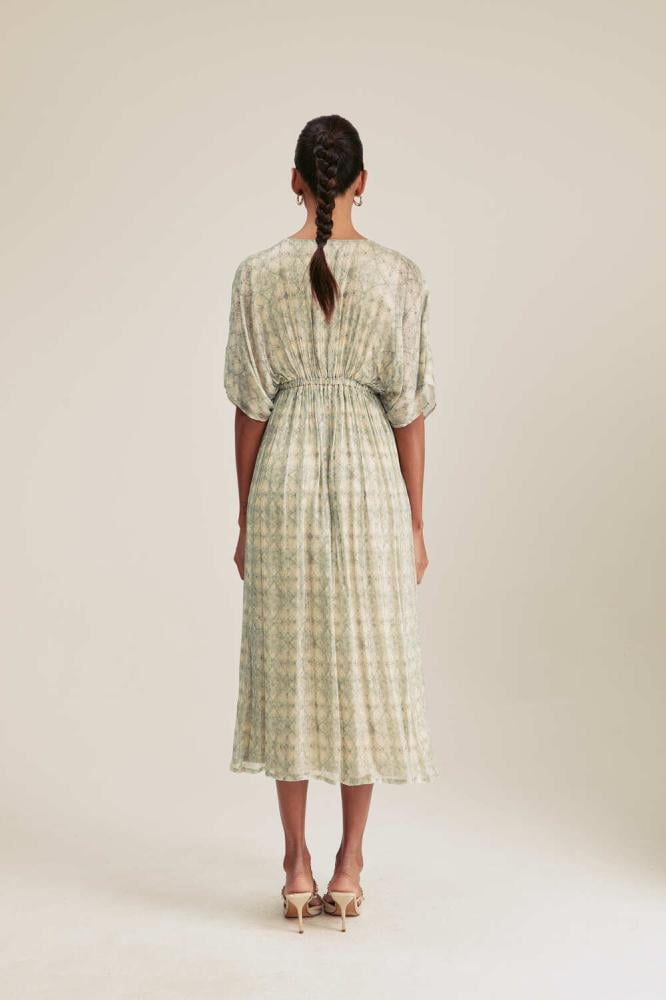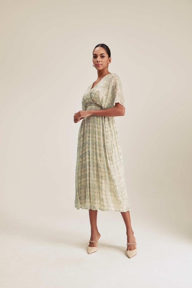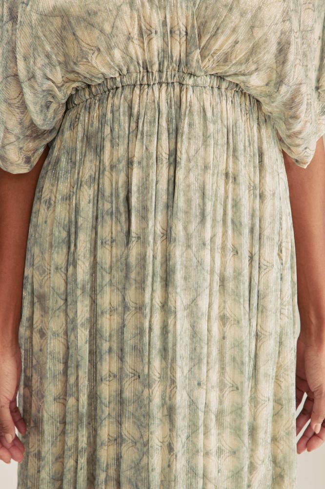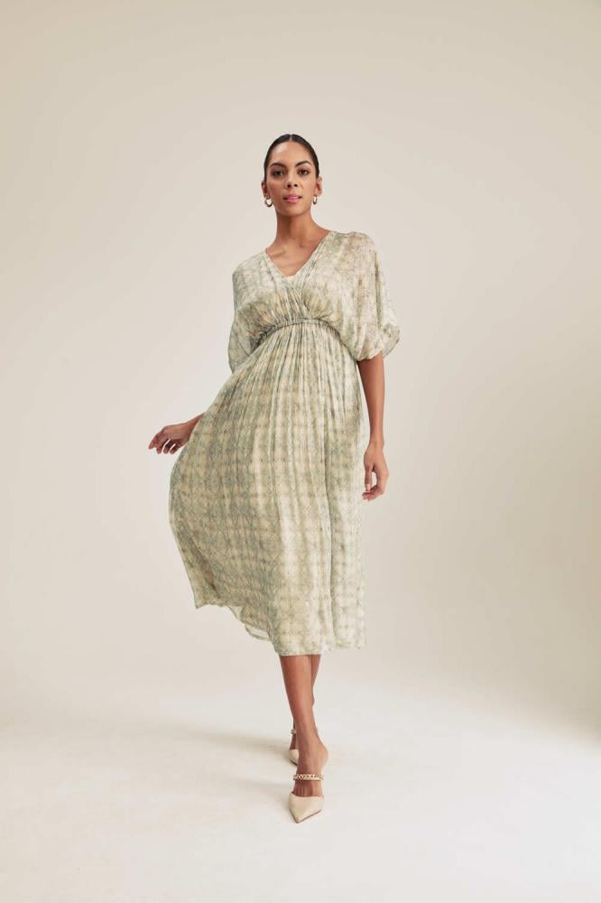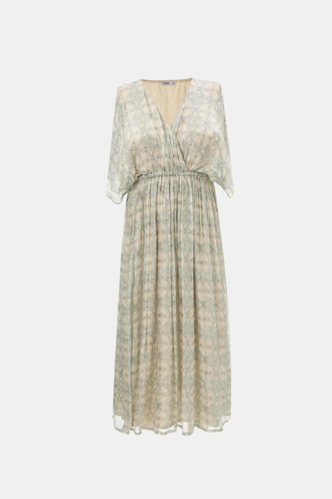 انعمي بمظهر مفعم بالأنوثة مع فستان بتصميم مزين بالكامل بنقوش هندسية بلمعة ويتميز بخصر مطاطي وياقة ل ، ويأتي بقصة فضفاضة مريحة تفيض بالرقي.