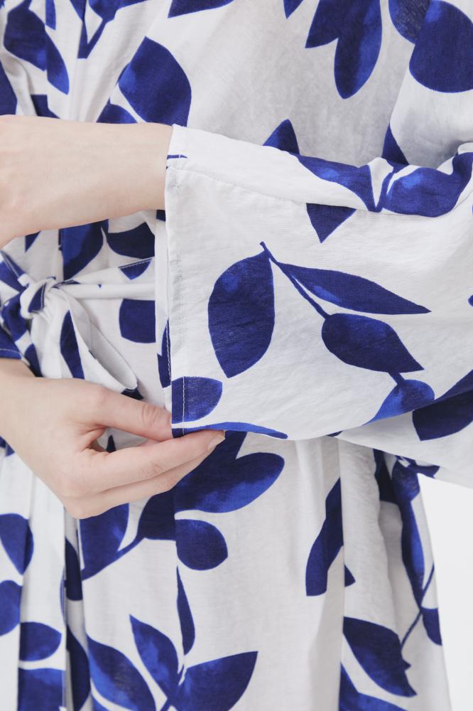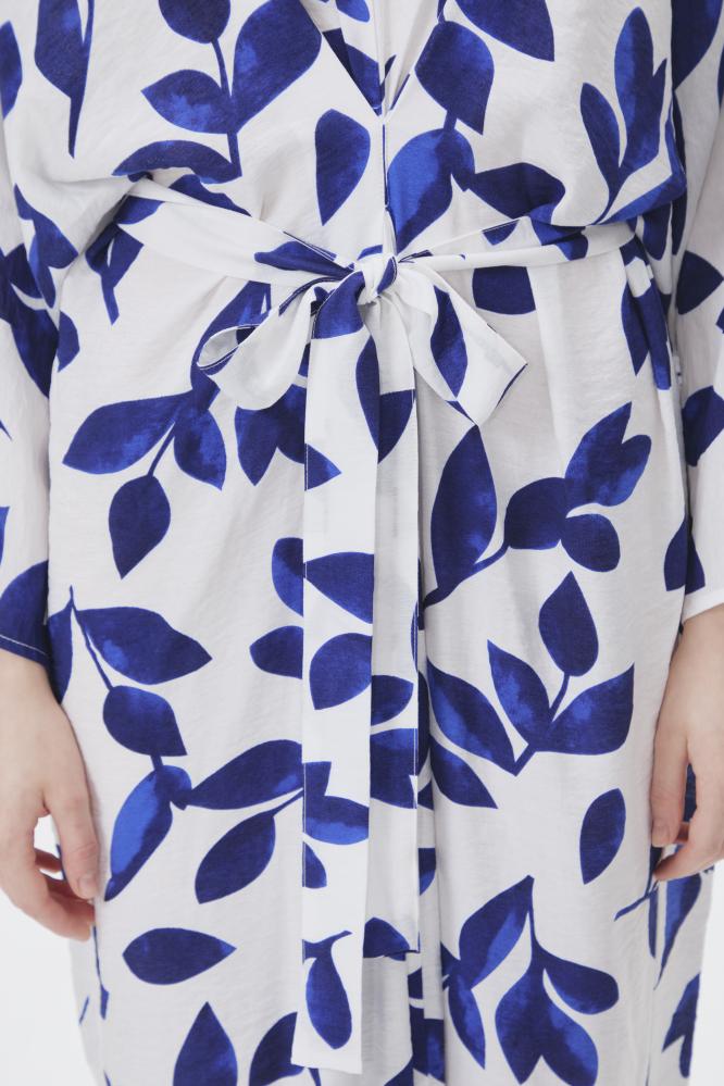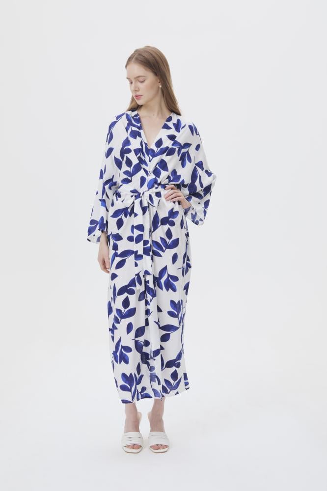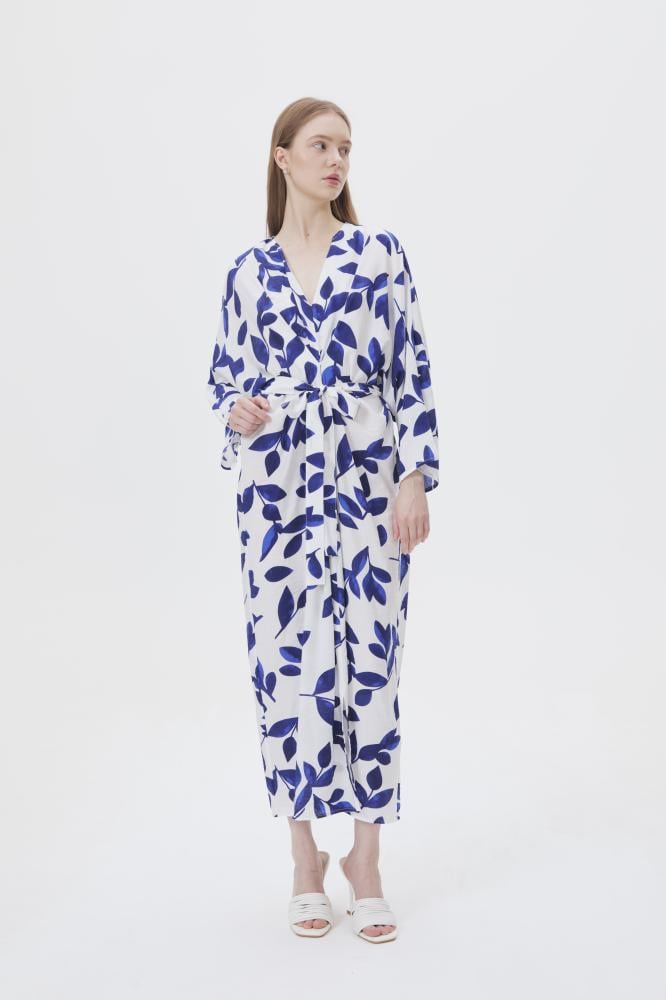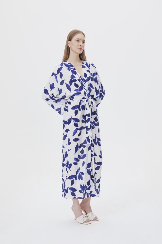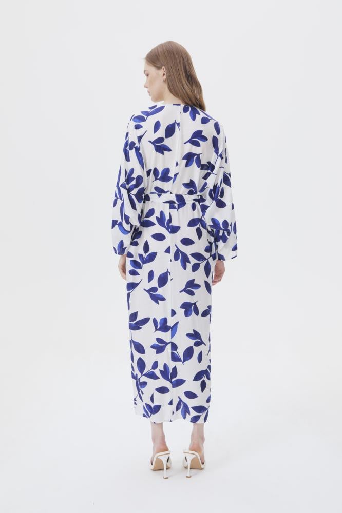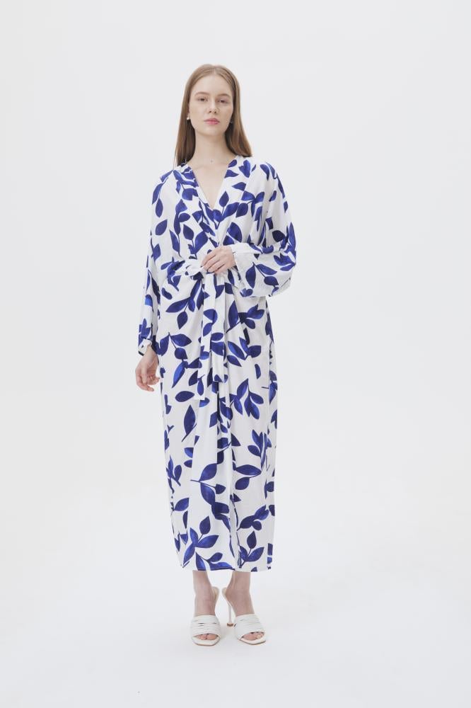 فستان بقصة أنثوية جذابة ،بتصميم مزدان بنقشة أوراق الشجر ، بياقةV وبأكمام طويلة ، ويأتي مع حزام ربط ، نسقيه مع أقراط ذهبية لإكمال الإطلالة.