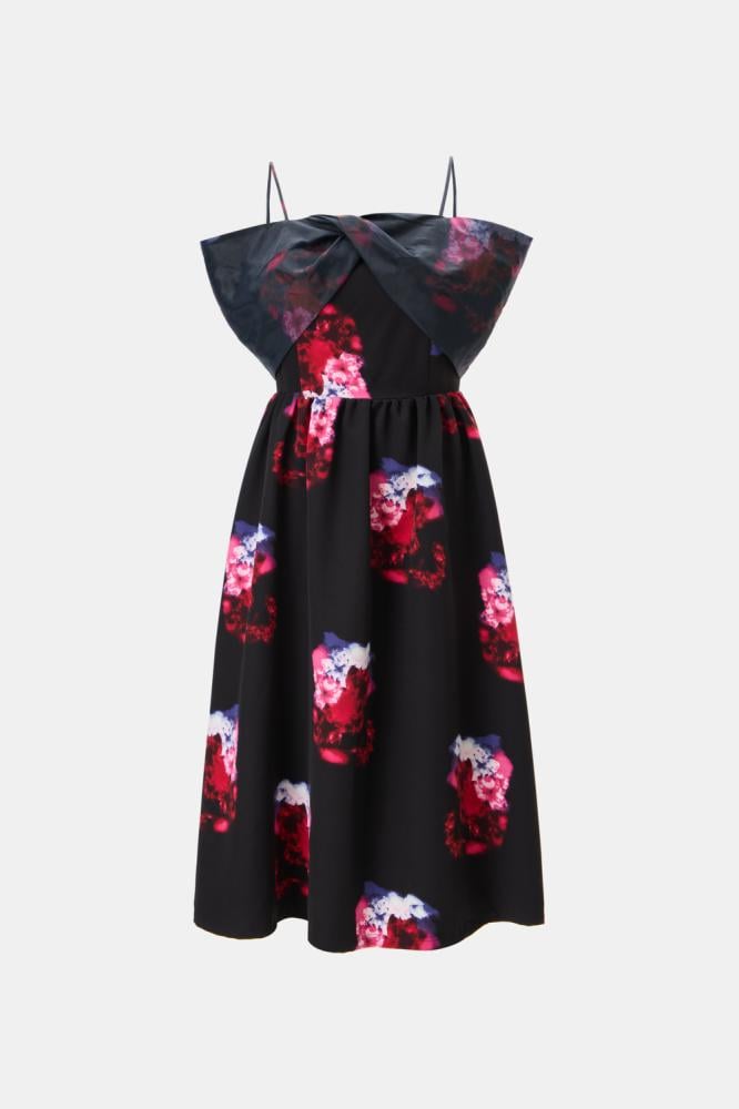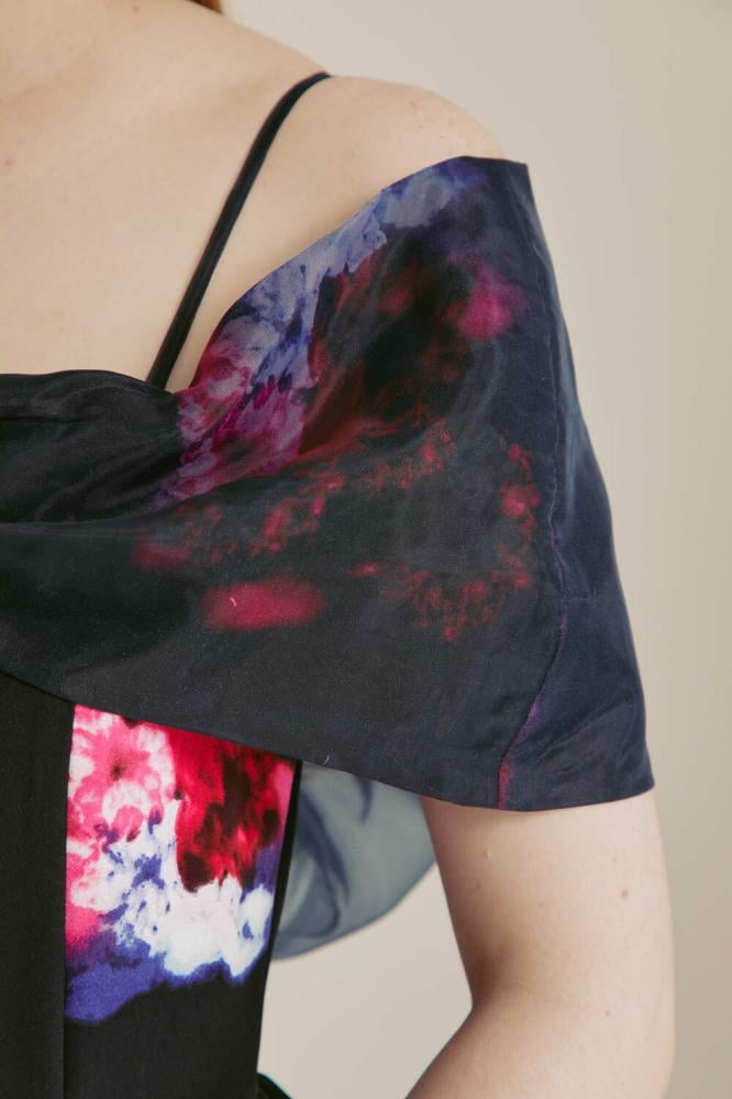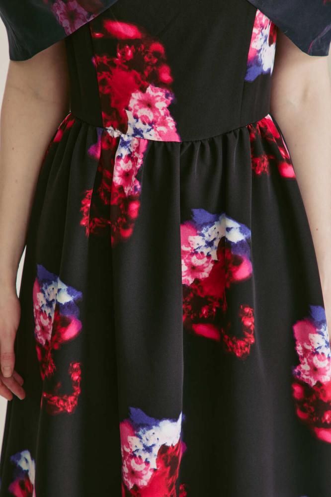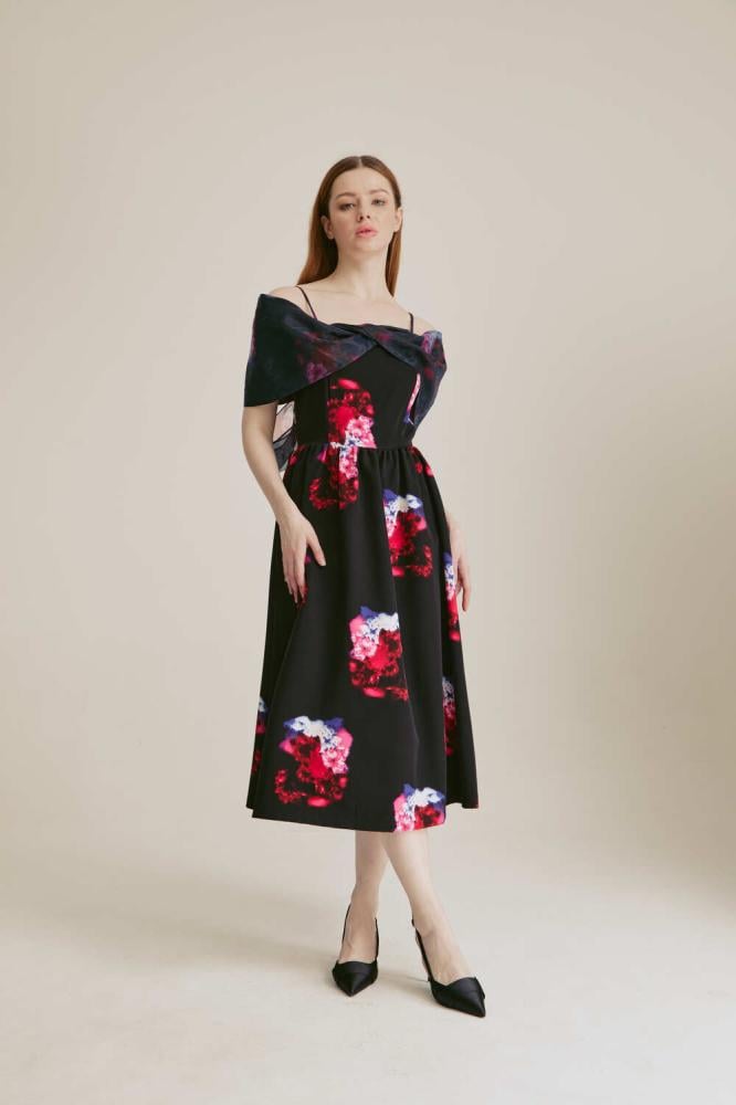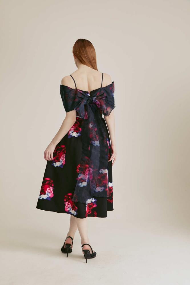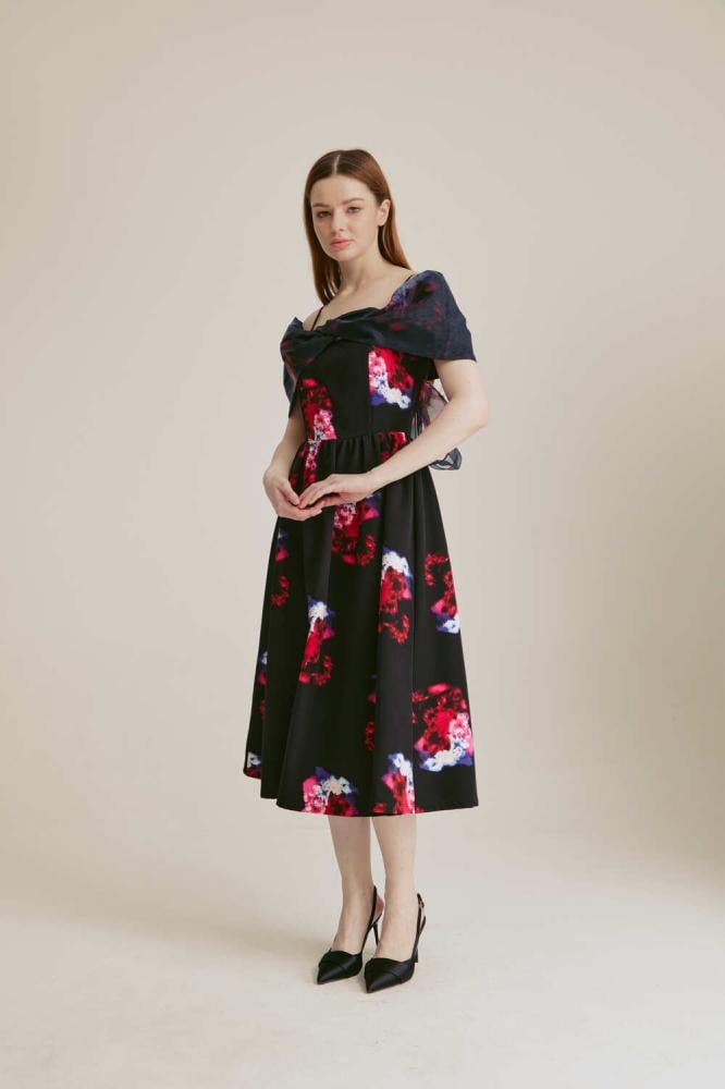 فستان أنيق باللون الأسود مع نقوش وردية تضيف لمسة حيوية وجذابة. يتميز بحمالات رفيعة ،وقصة على شكل حرف A، مزين برباط من الخلف يعزز من فخامته ، مثالي للمناسبات المسائية.