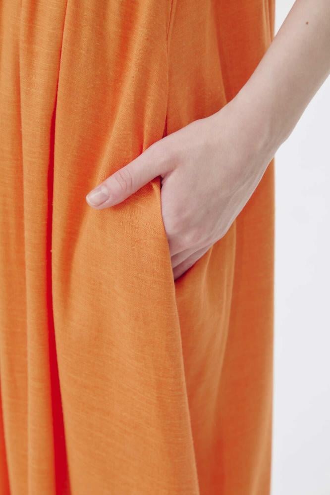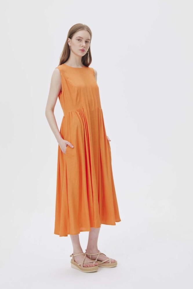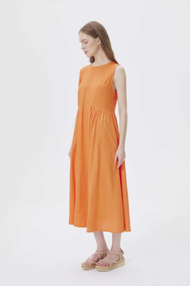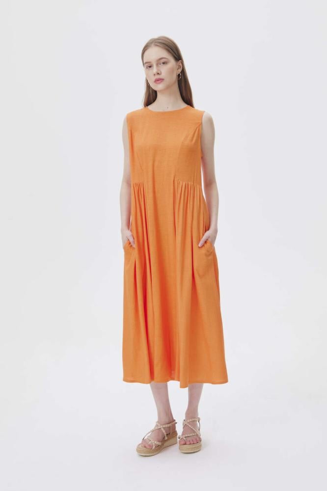 أضيفي لمسة مفعمة بالحيوية إلى إطلالتك ، فستان ناعم بلون مشرق بتصميم بياقة مستديرة وبدون أكمام ويتميز بتفاصيل ثنيات