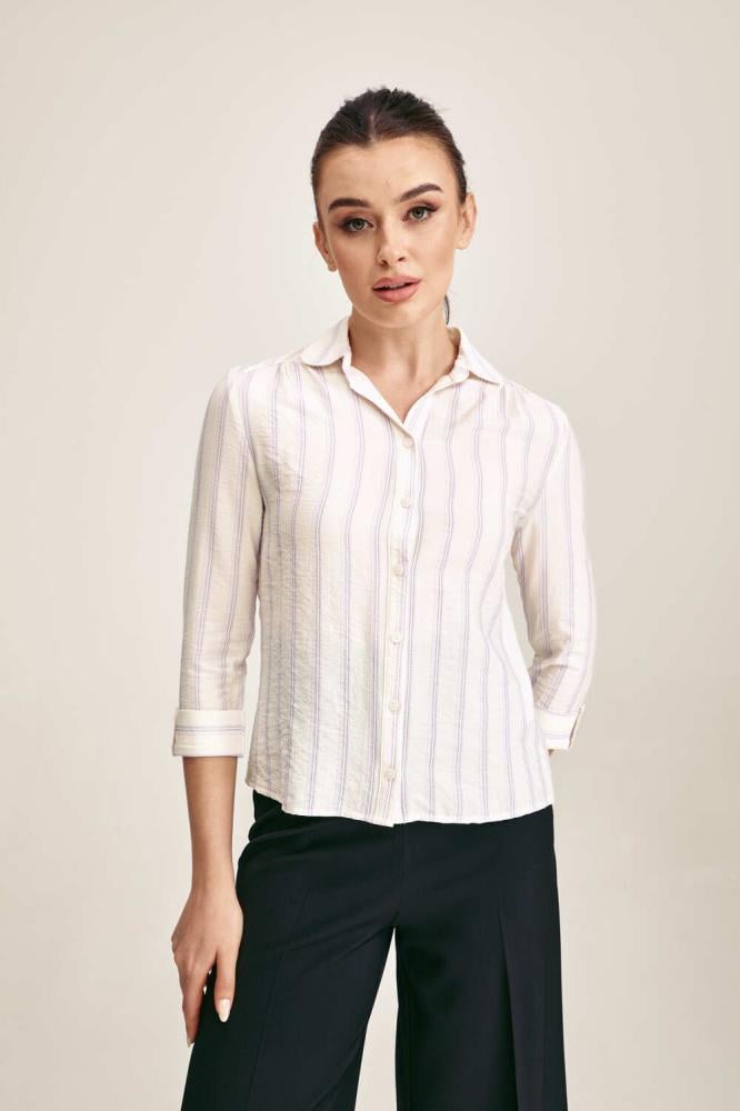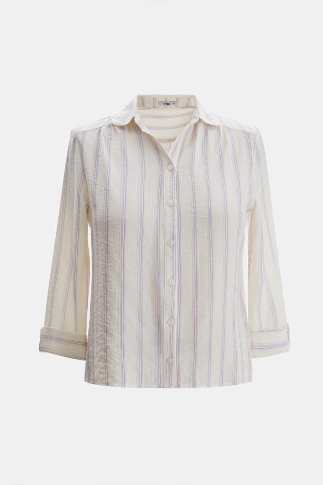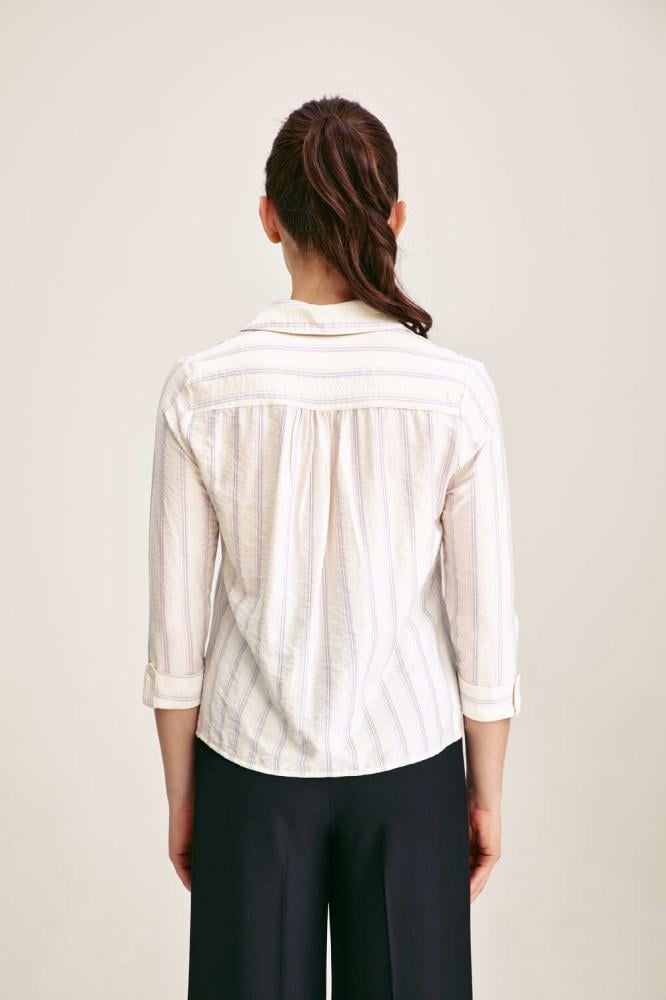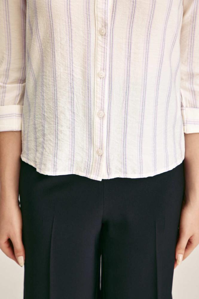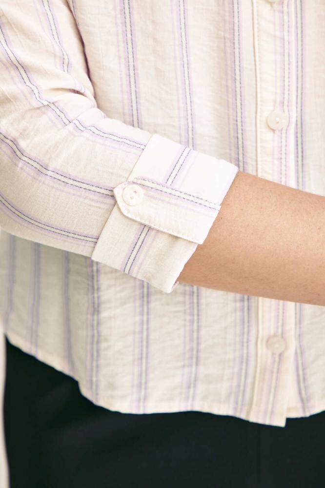 - يتميز بنقشة مقلمة عصرية تمنح القميص طابع أنيق، وتساعد في إبراز القوام بشكل رشيق وانسيابي.
