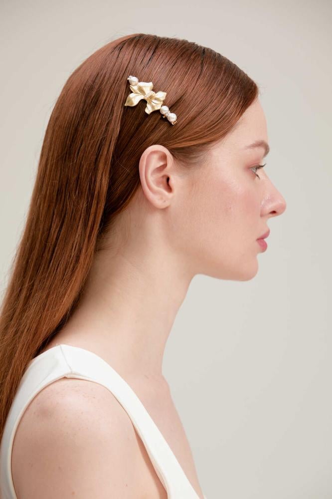 أضيفي لمسة أناقة إلى إطلالتك مع مشبك الشعر لامع ومعدني، ويتميز بتصميم فاخر مرصع بكريستالات ومزين بفيونكة وتفاصيل من اللؤلؤ