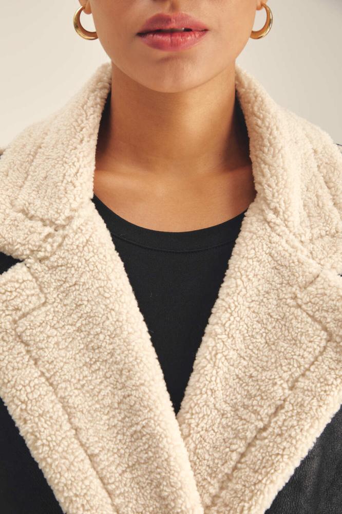 This wool-lined leather jacket offers exceptional luxury, with an elegant design and intricate details that make it a unique piece. It features a folded collar, pockets, and comes with a tie belt.